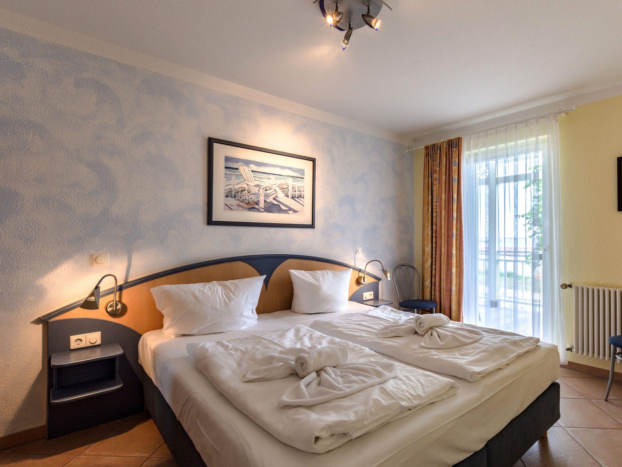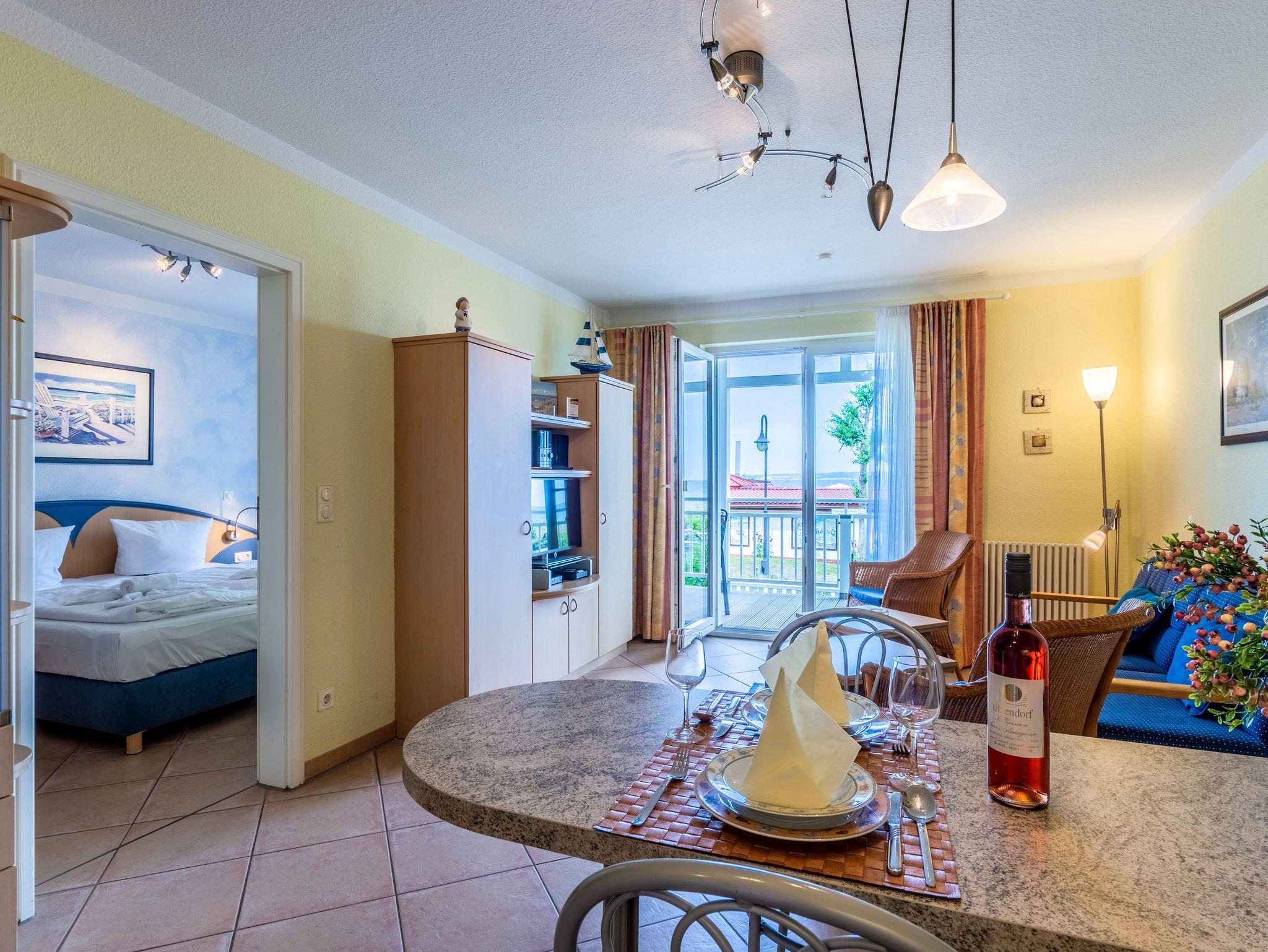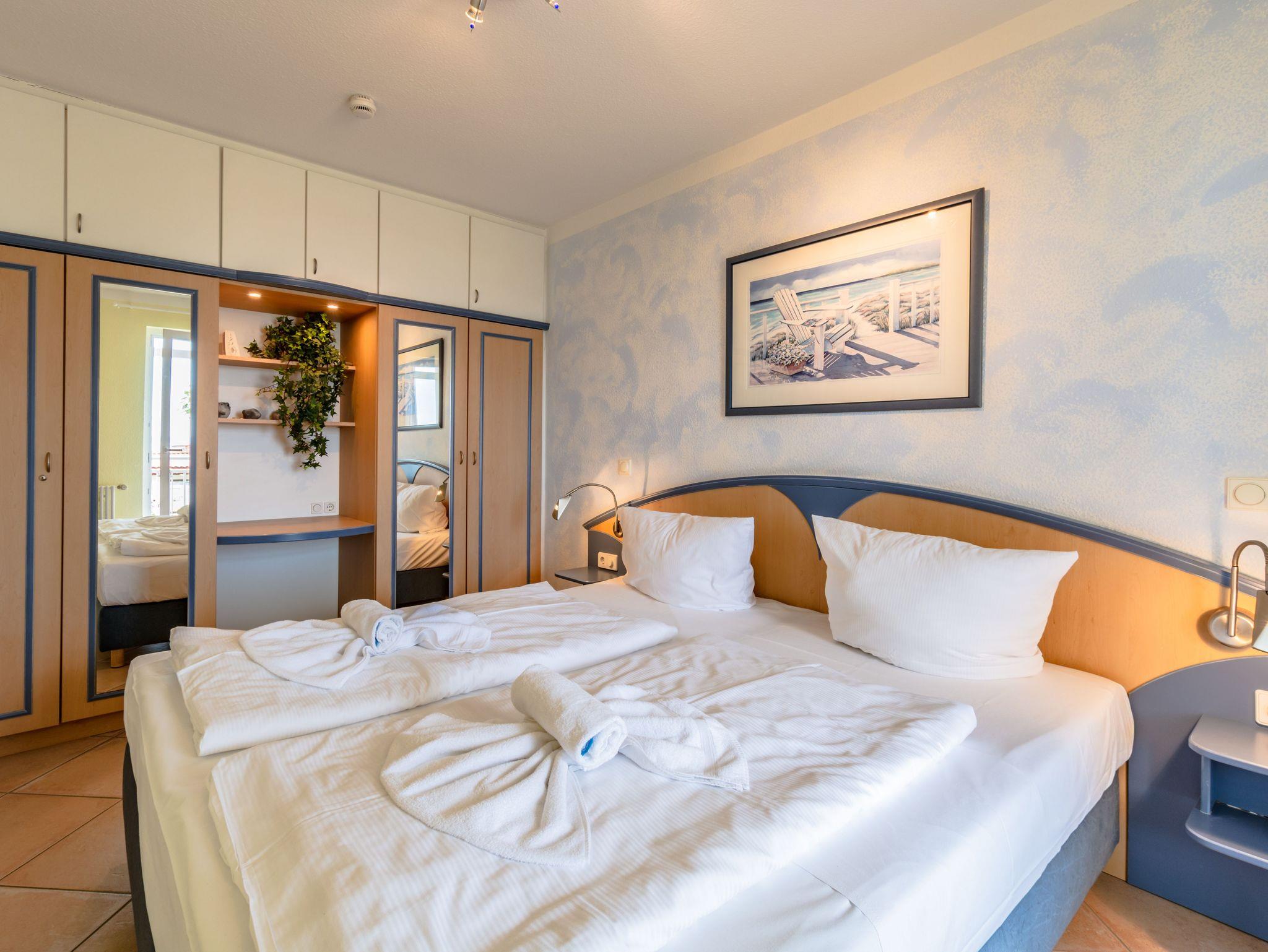 Das 2-Raum-Apartment befindet sich in der Hochpaterre und ist für bis zu 4 Personen geeignet. Das Apartment verfügt über einen Balkon mit frontalen Meerblick.
