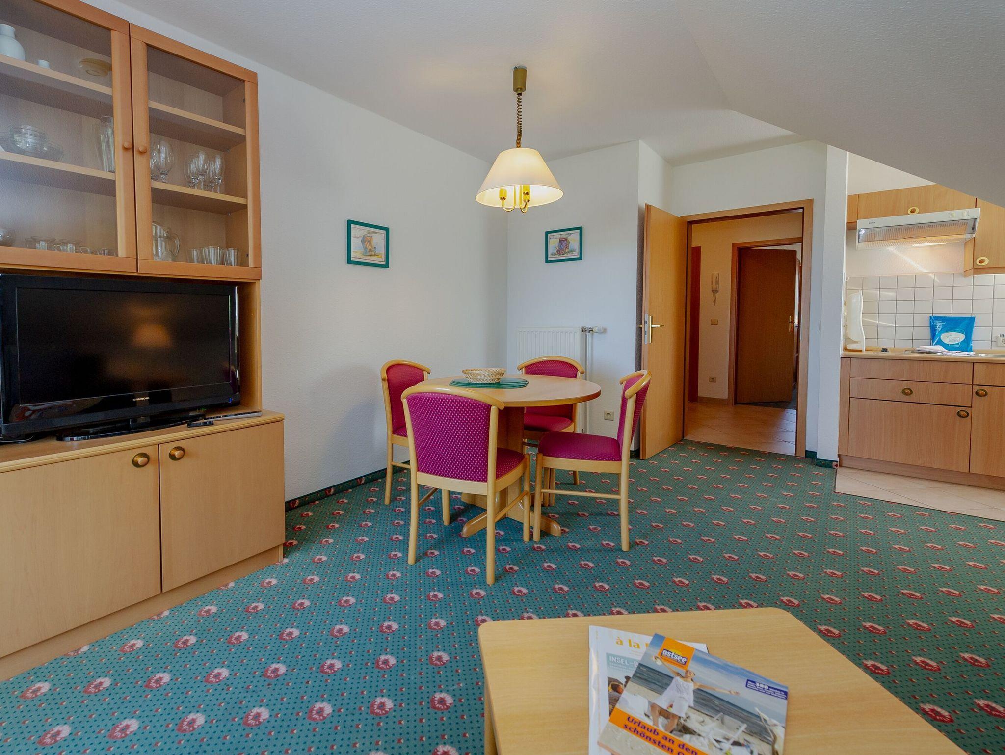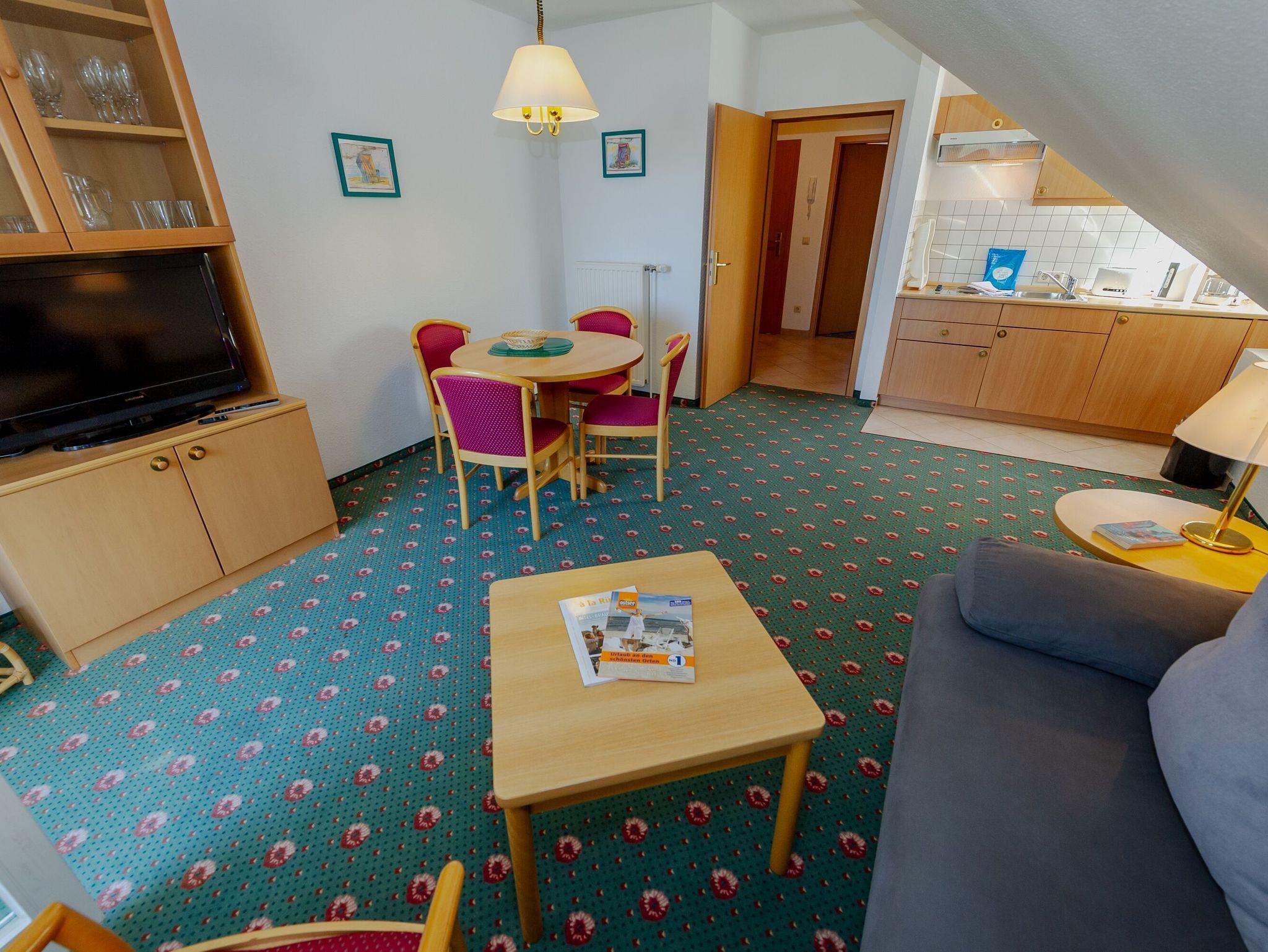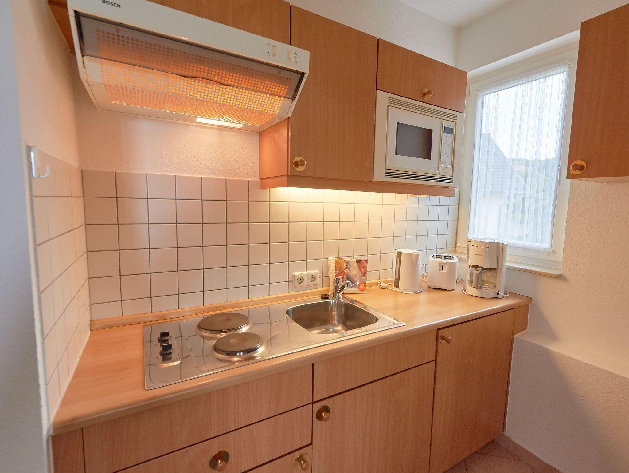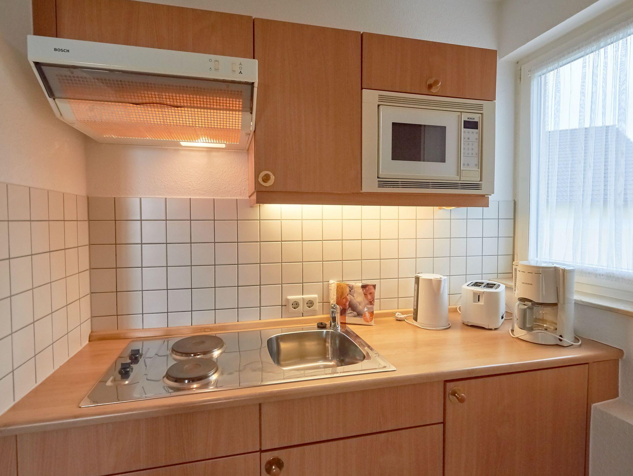 Das kombinierte Wohn-/Esszimmer Ihrer Urlaubsunterkunft verfügt über eine bequeme Couch, eine Mini-Stereoanlage mit Radio/CD-Player, einen Flachbild-TV und einen Esstisch. Die in den Wohnbereich integrierte Küchenzeile ist u.a. mit einem Kühlschrank mit Gefrierfach, einem 2-Platten-Herd, einer Mikrowelle sowie Wasserkocher, Kaffeemaschine, Toaster und diversem Kleininventar ausgestattet. Der nächste Bäcker für die frischen Frühstücksbrötchen befindet sich nur wenige Gehminuten entfernt.