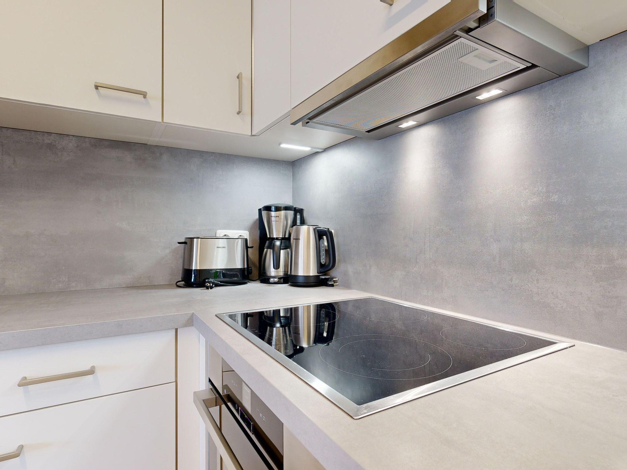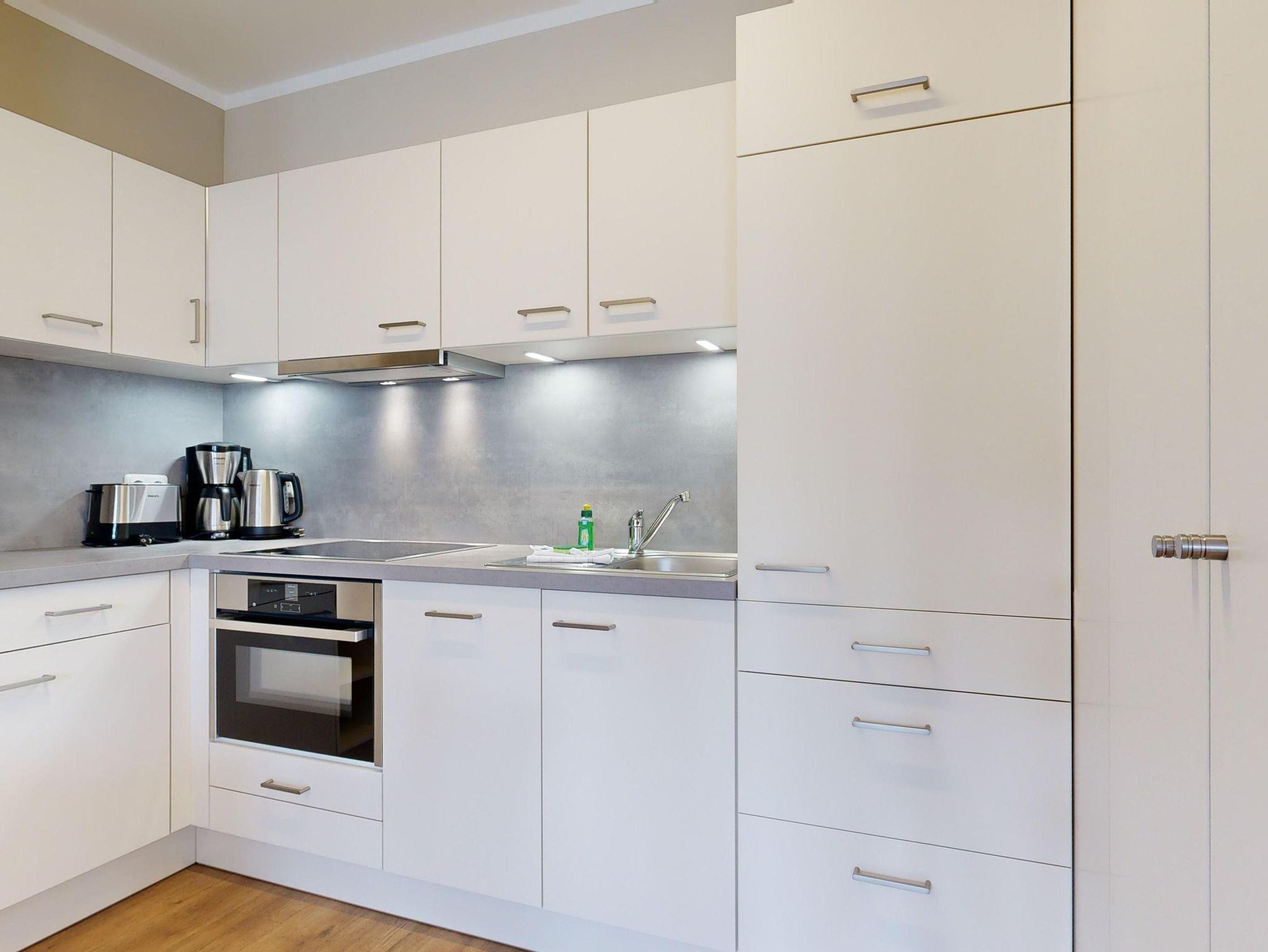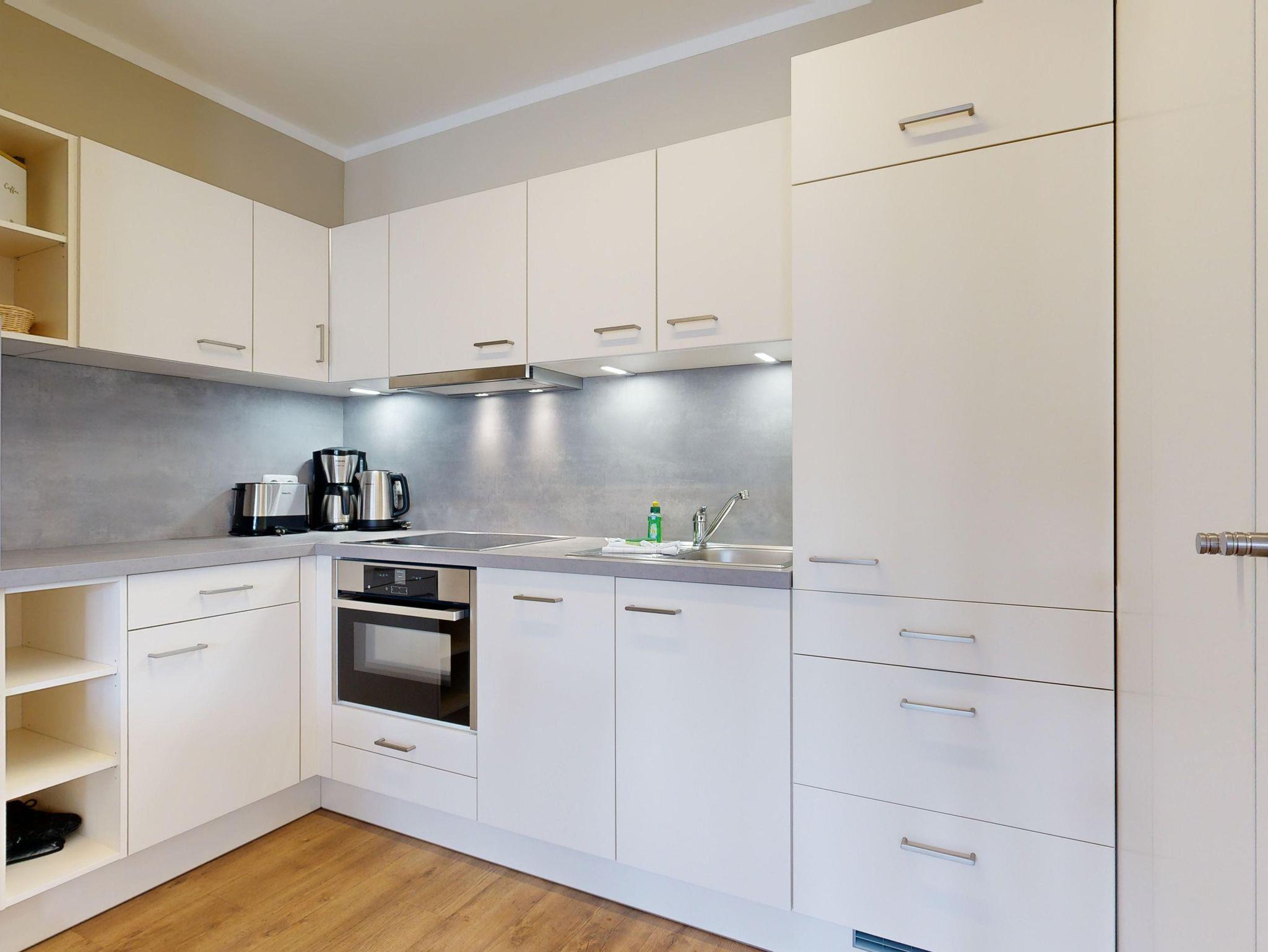 Küche mit Ceranfeld, Kühlschrank mit Gefrierfach, Backofen, Spülmaschine, Toaster, Wasserkocher, Kaffeemaschine