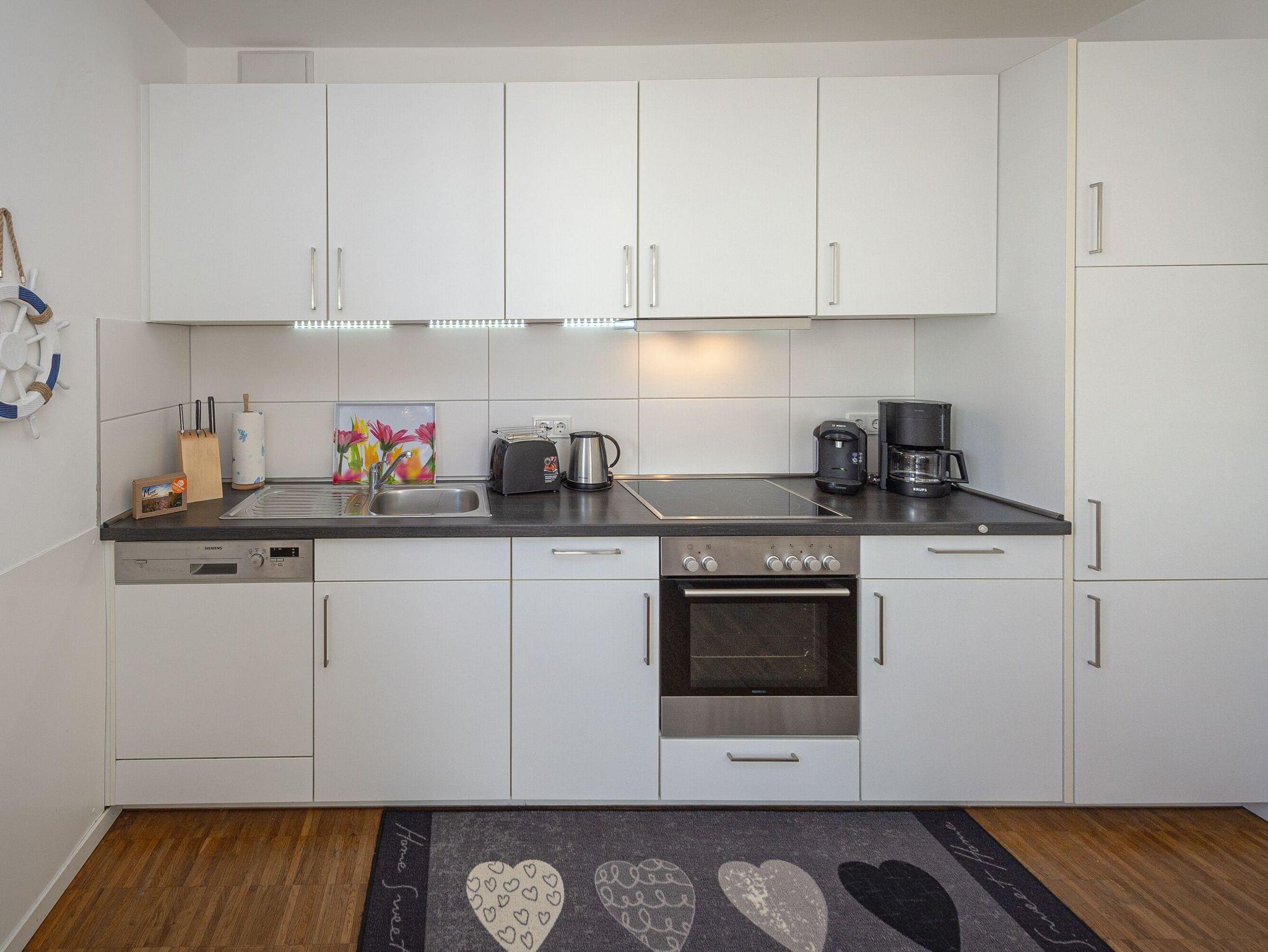Die voll ausgestattete offene Küche mit einem Geschirrspüler, Kühlschrank mit Tiefkühlfach, Backofen, 4 Platten-Cerankochfeld, Toaster, Wasser- und Eierkocher sowie drei verschiedene Kaffeemaschinen (Filterkaffee, Tassimo Kapselkaffee) lässt keine Wünsche offen.