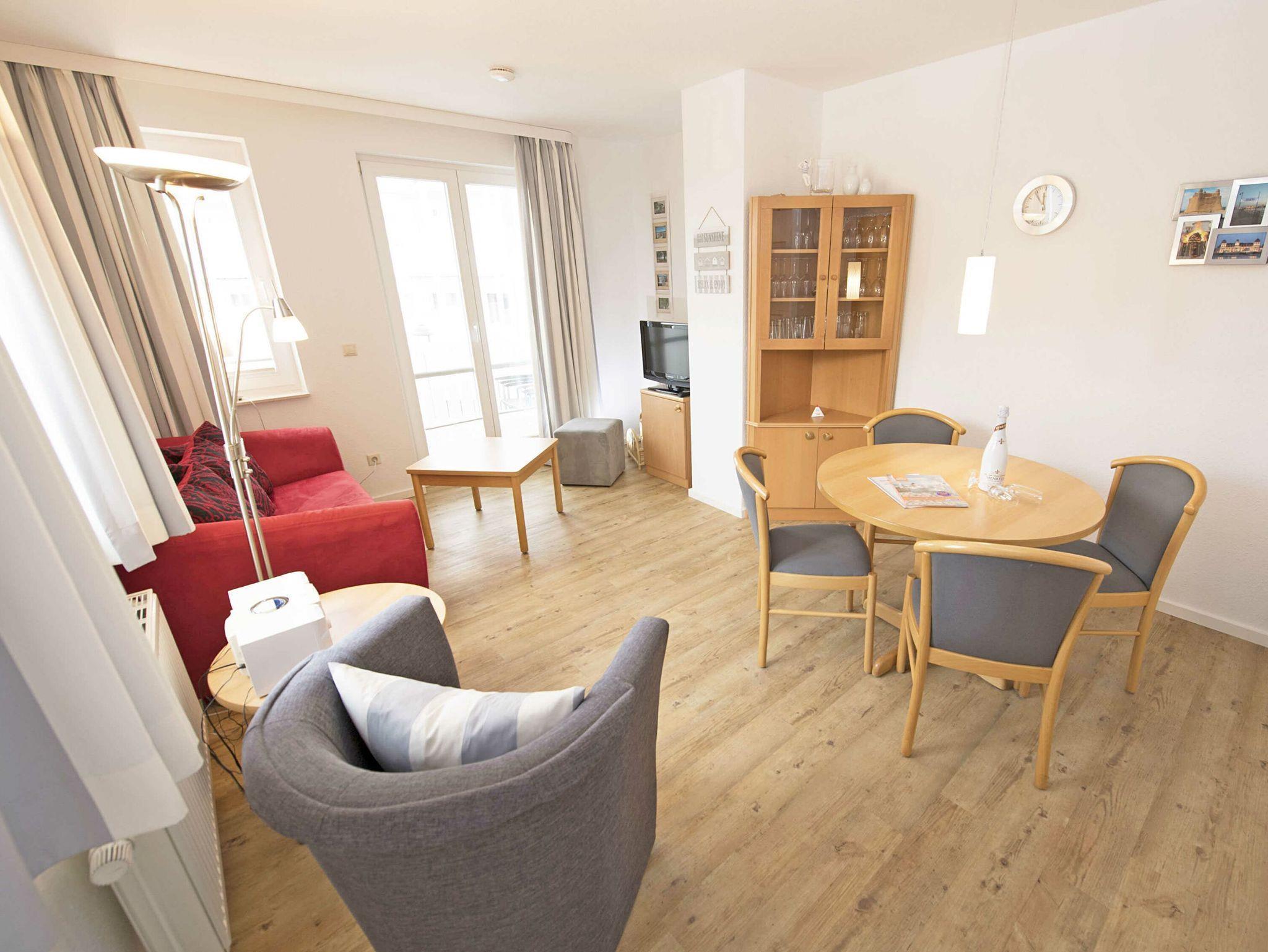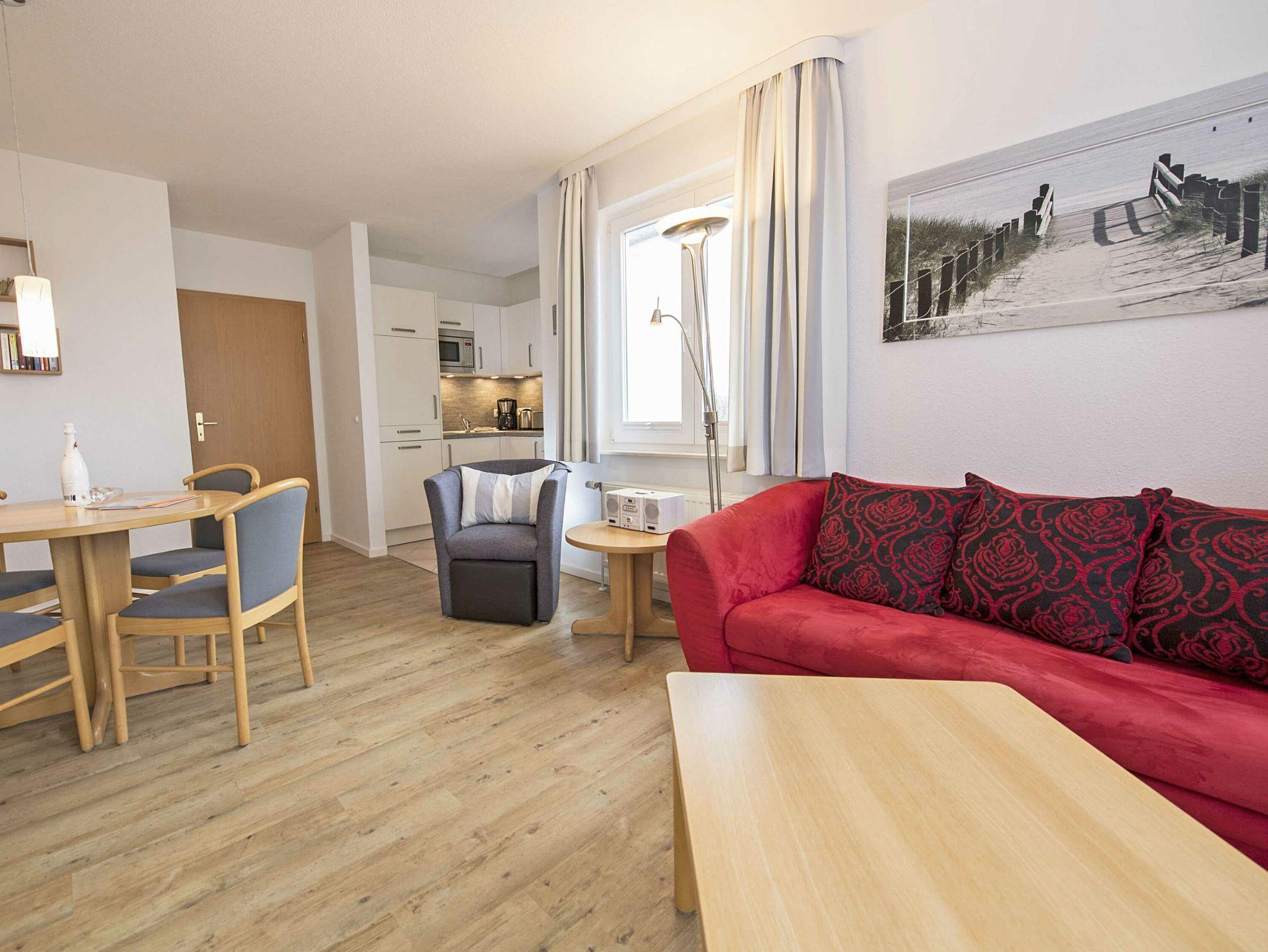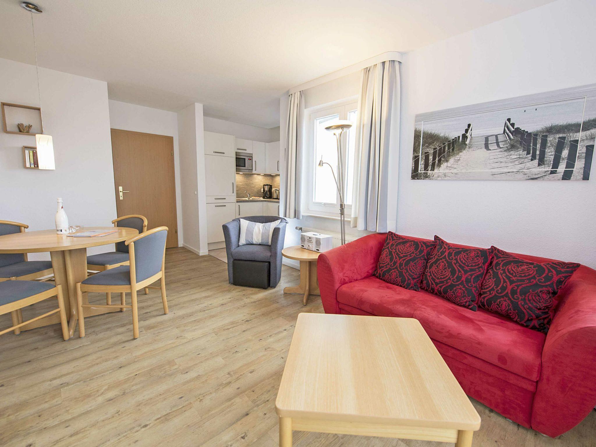 Der Wohnraum verfügt über einen Esstisch, einen Sessel und eine Schlafcouch, die als Aufbettung für 1 Person genutzt werden kann, eine Mini-Stereoanlage mit CD-Player, einen Flachbild-TV und eine im Wohnbereich harmonisch integrierte Küchenzeile. Diese ist ausgestattet mit einem Kühlschrank mit Gefrierfach, einer Mikrowelle, einem Cerankochfeld, Wasserkocher, Kaffeemaschine, Toaster und diversem Kleininventar, das die Küchenausstattung komplettiert.