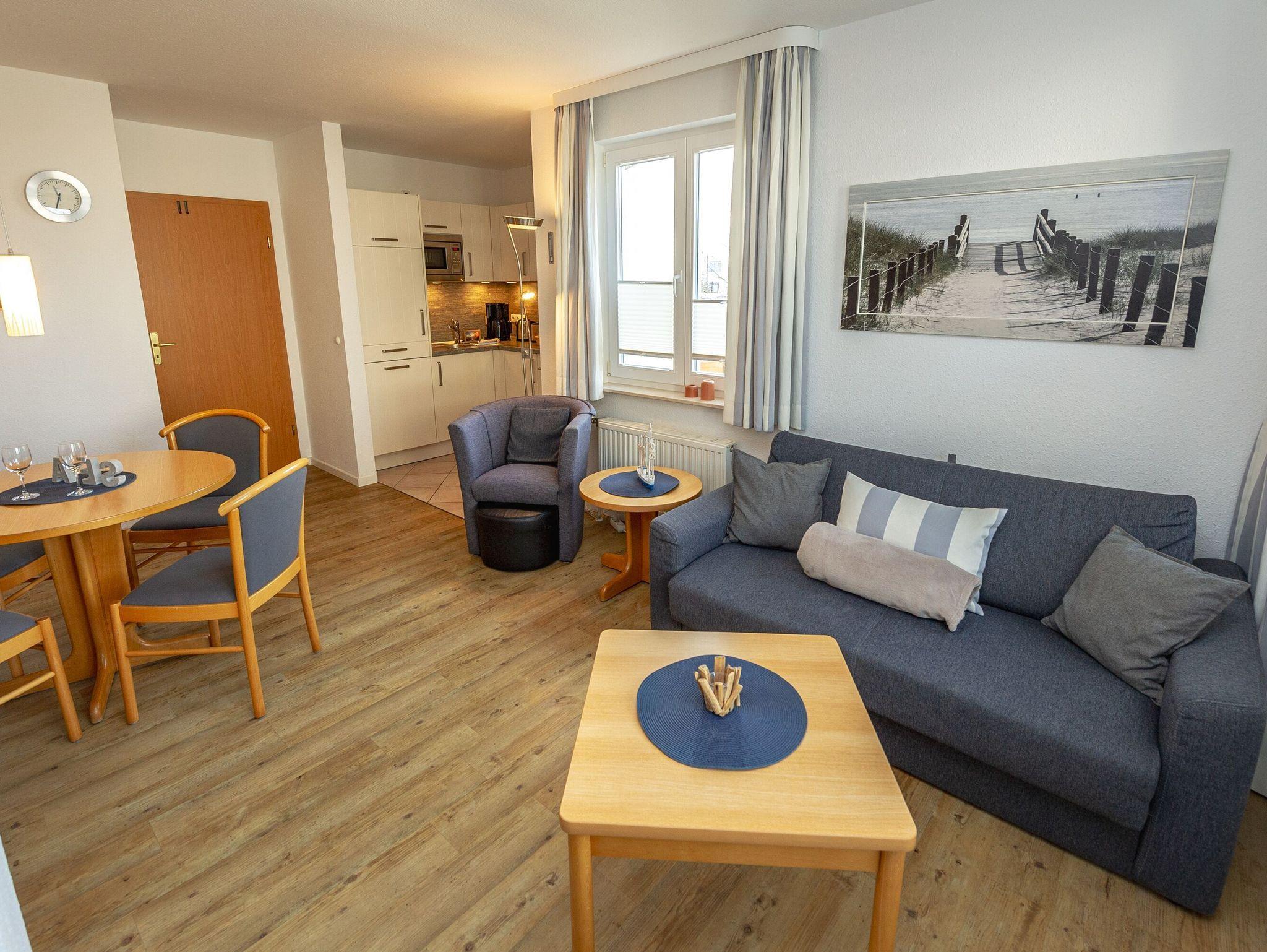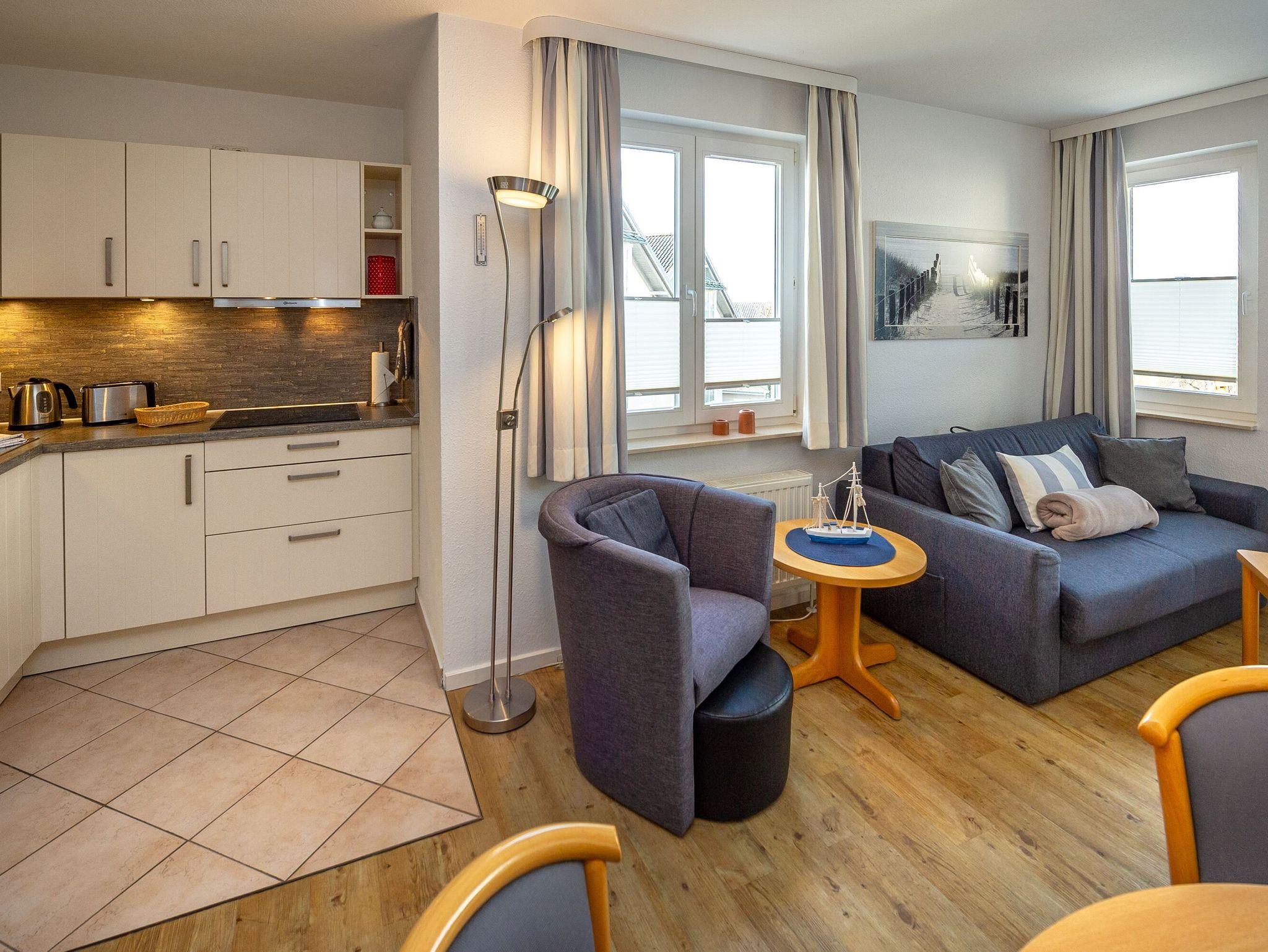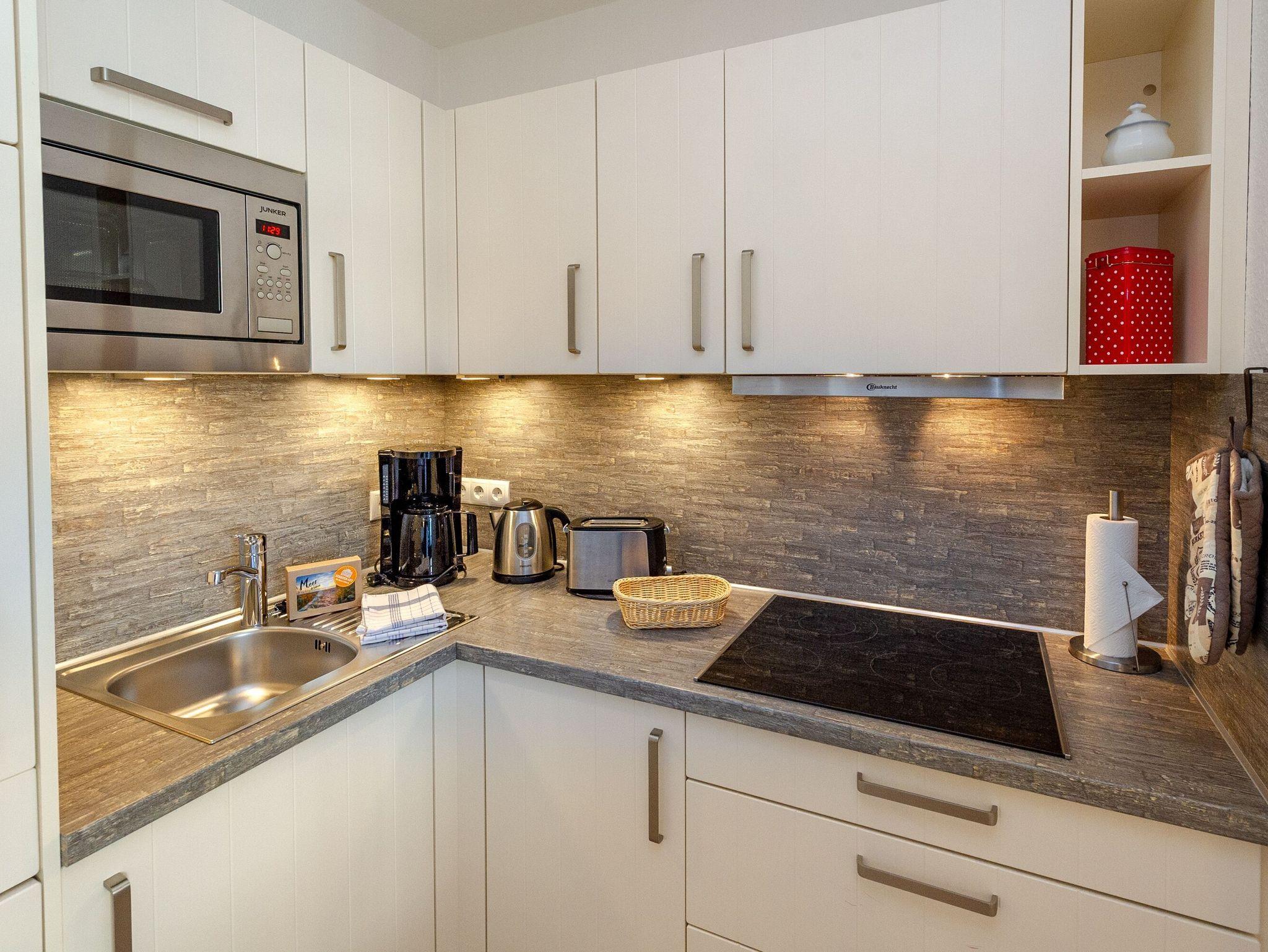 Das kombinierte Wohn-/Esszimmer ist gelungen in seine verschiedenen Funktionsbereiche unterteilt. Sie finden hier einen Esstisch, einen Sessel und eine bequeme Couch (Aufbettungsmöglichkeit für 1 Person), eine Mini-Stereoanlage mit CD-Player, einen Flachbild-TV und eine kleine Buchauswahl. Die moderne Küchenzeile bietet Ihnen u.a. einen geräumigen Kühlschrank mit Gefrierfach, ein 4-Zonen-Cerankochfeld, eine Mikrowelle sowie Wasserkocher, Kaffeemaschine, Toaster und diverses Kleininventar, das die Küchenausstattung komplettiert.