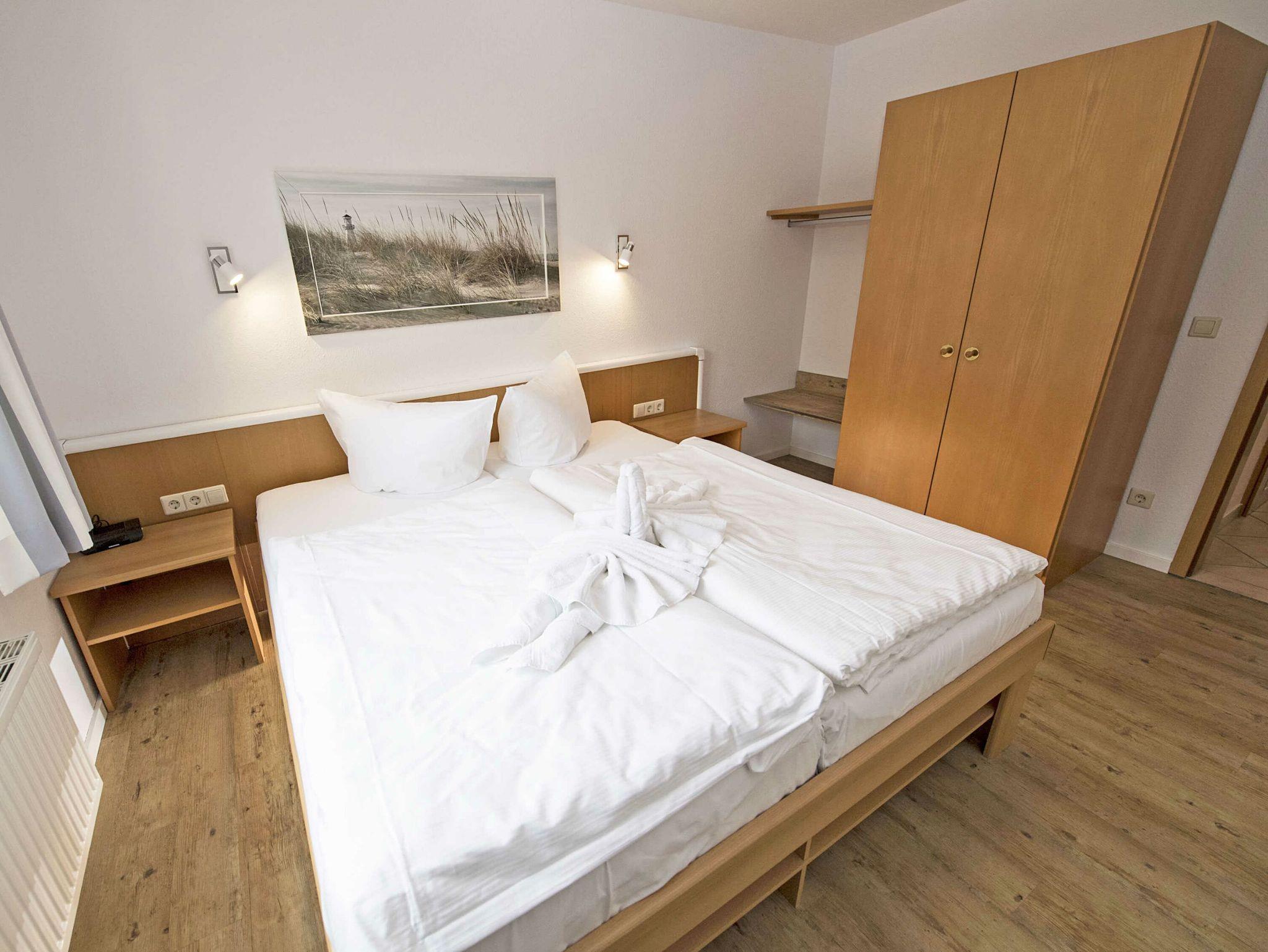 Weiterhin gibt es ein Schlafzimmer mit einem Doppelbett und ausreichend Platz für Ihre Garderobe sowie ein Bad mit Dusche/WC und einem Haartrockner.
