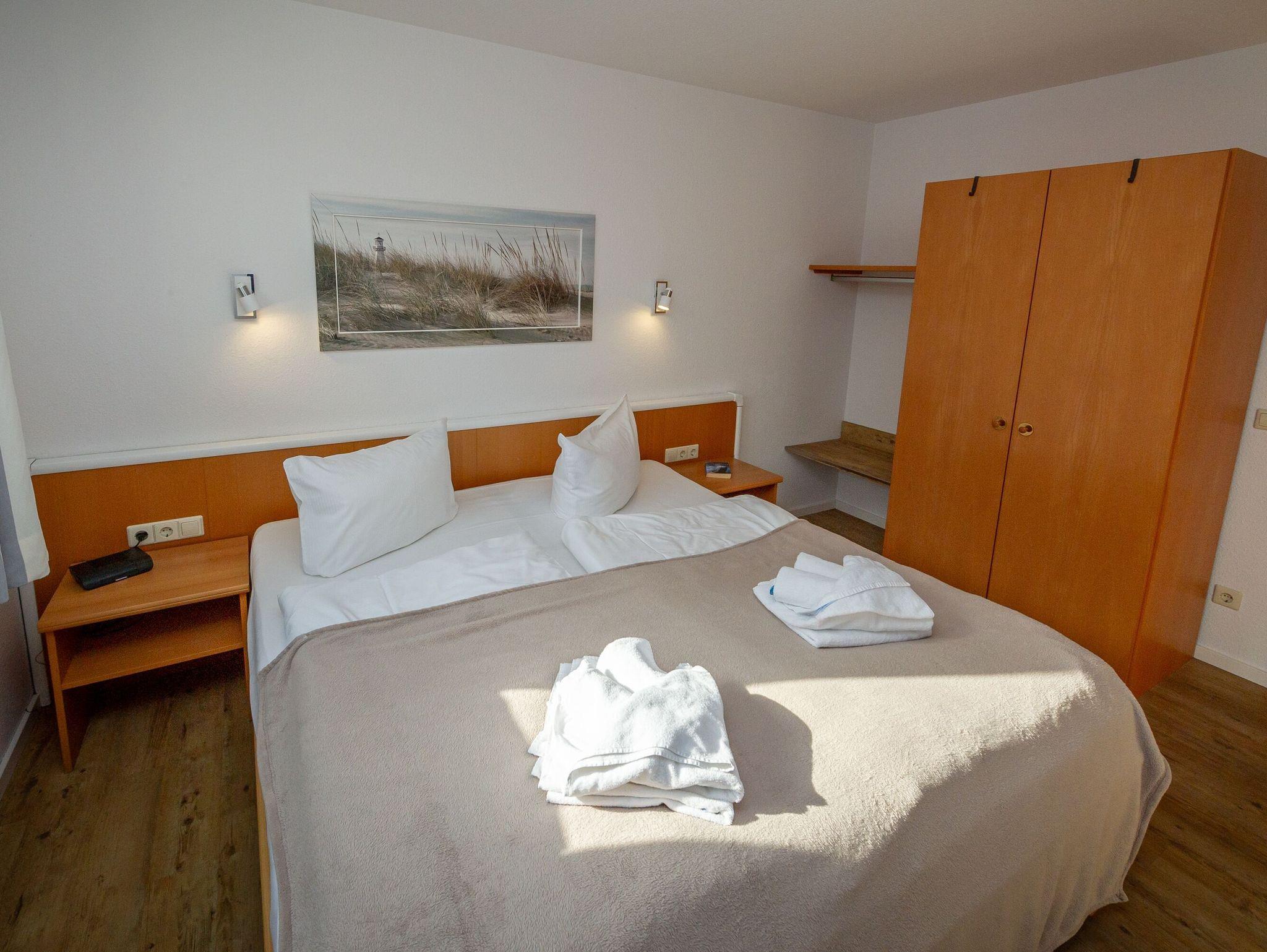 Weiterhin gibt es ein Schlafzimmer mit einem Doppelbett und einem Kleiderschrank für Ihre Urlaubsgarderobe sowie ein Tageslicht-Bad mit Dusche/WC, Waschtisch, Spiegel und Haartrockner.