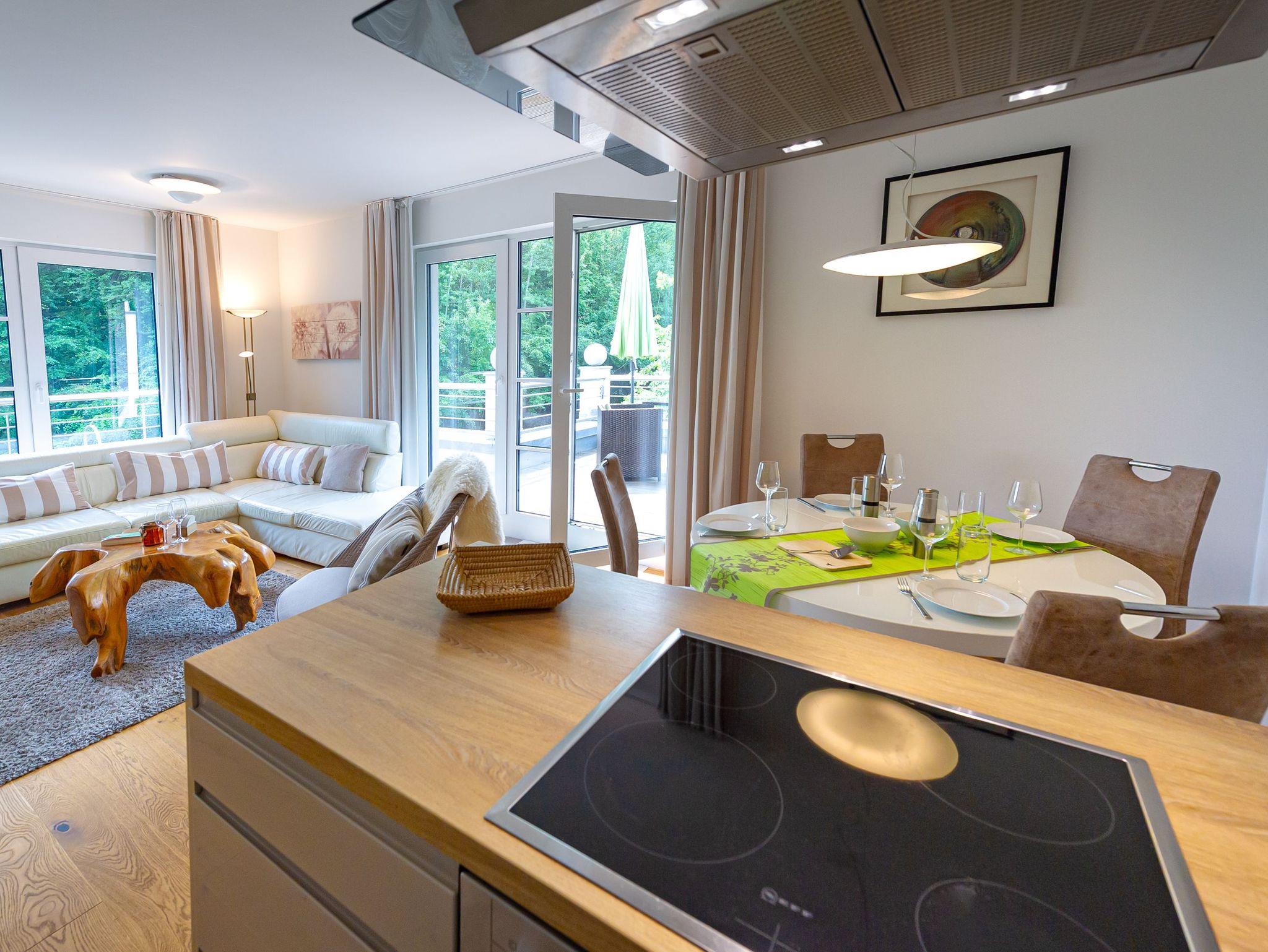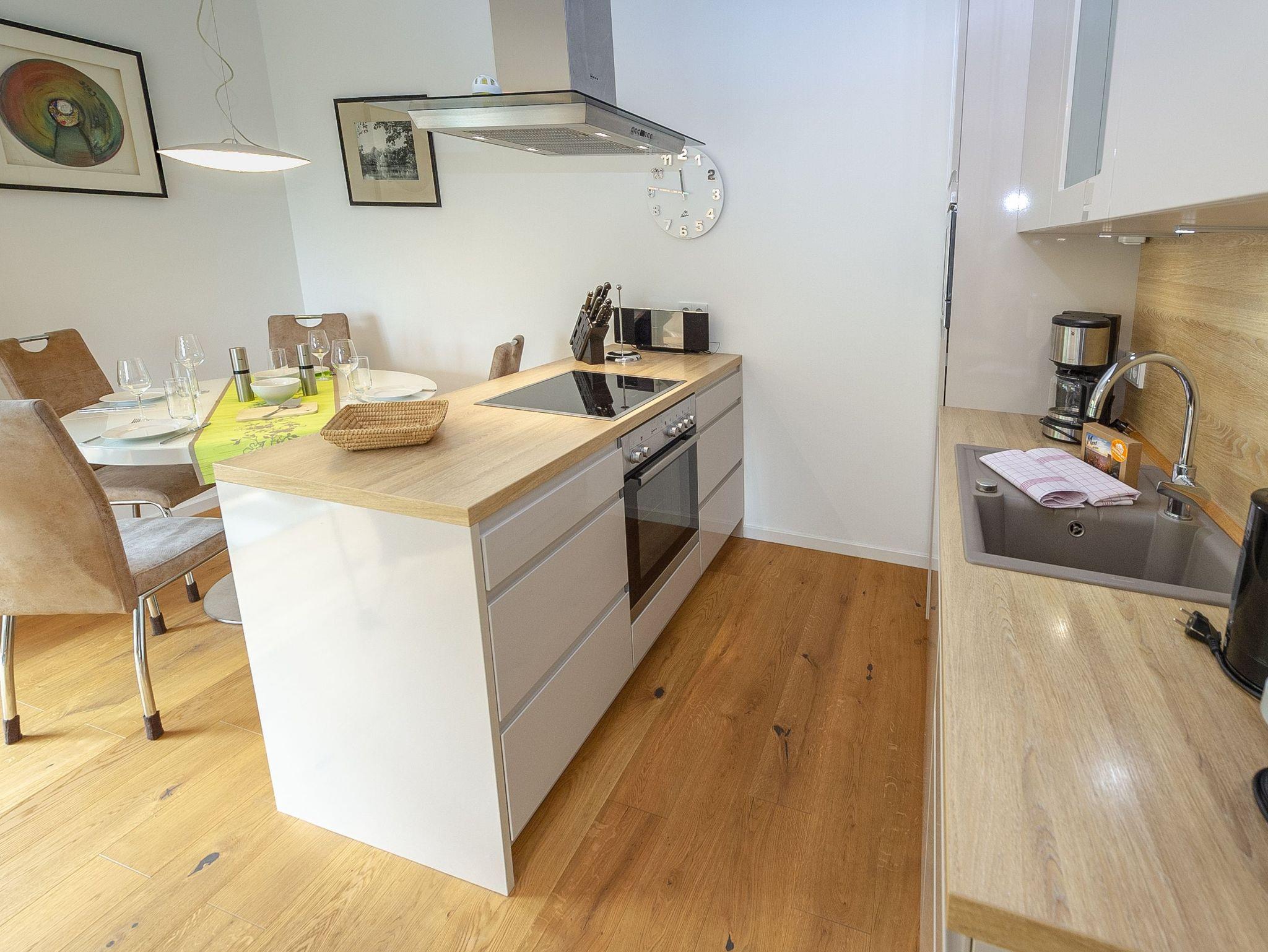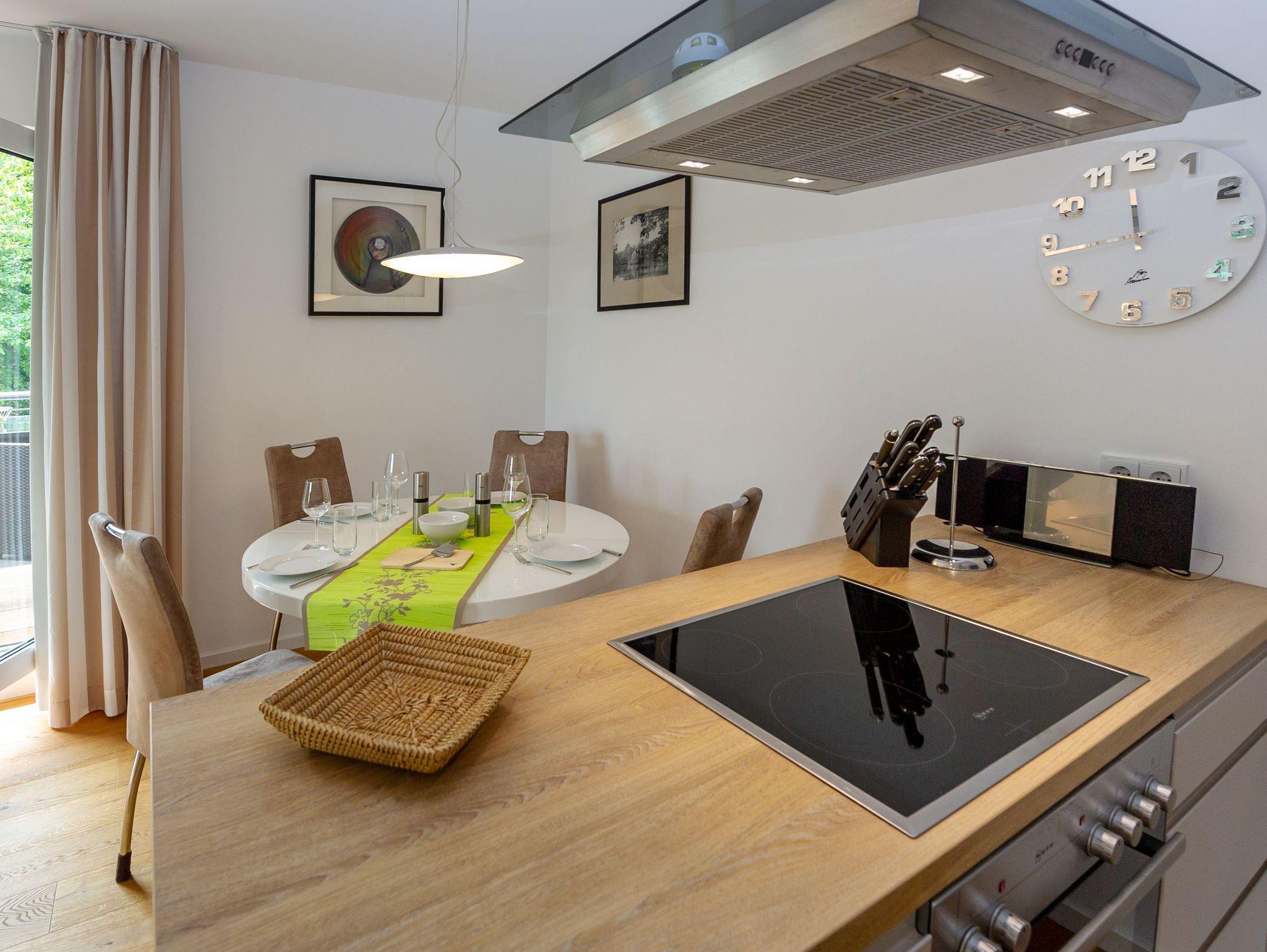 Wunderbar lichtdurchflutet lädt das großzügige Wohn- und Esszimmer zu erholsamen Stunden mit der ganzen Familie ein. Die integrierte Küchenzeile verfügt u.a. über einen 4-Zonen-Herd, einen Backofen, eine Mikrowelle, einen Kühlschrank, einen Geschirrspüler, eine Filterkaffee- und eine Espresso-Maschine sowie Wasserkocher und Toaster. Speisen können Sie wahlweise am Esstisch drinnen oder aber in der frischen Ostseeluft auf der Terrasse.