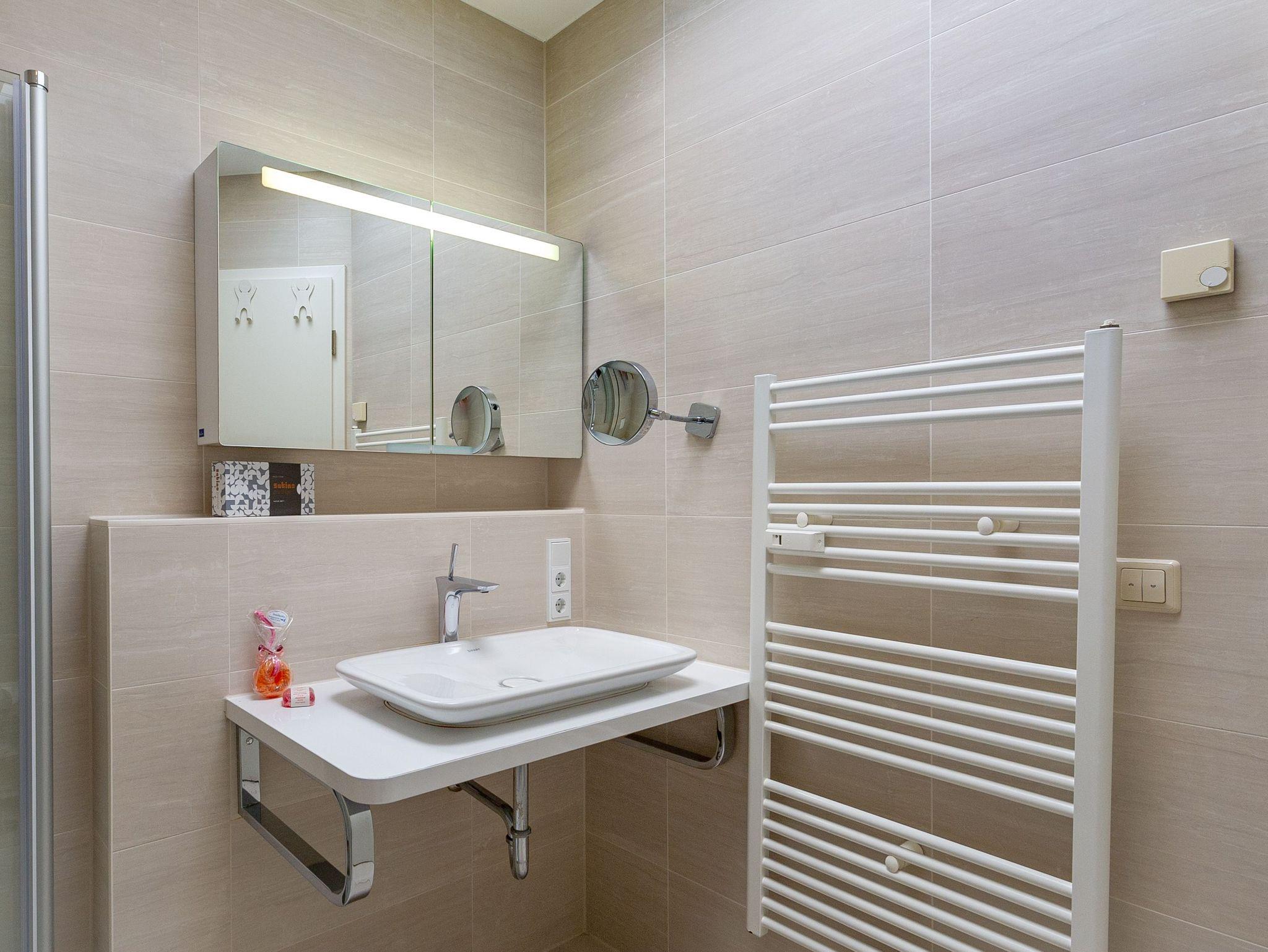 Das elegant geflieste Badezimmer mit Fußbodenheizung und Dachfenster überzeugt mit einer ebenerdigen Dusche, WC, Waschbecken, Handtuchwärmer, Kosmetikspiegel und Fön.