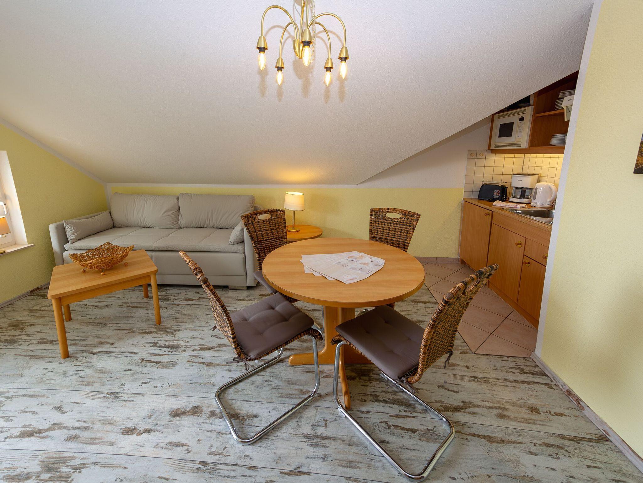 Der helle, freundliche Wohnraum verfügt über einen Esstisch, einen Sessel und eine Schlafcouch, die als Aufbettung für zwei Personen genutzt werden kann, eine Mini-Stereoanlage mit Radio/CD-Player, einen Flachbild-TV und eine im Wohnbereich harmonisch integrierte Küchenzeile. Diese ist ausgestattet mit einem Kühlschrank mit Gefrierfach, einer Mikrowelle, einem 2-Platten-Herd sowie Wasserkocher, Kaffeemaschine, Toaster und diversem Kleininventar, das die Küchenausstattung komplettiert.