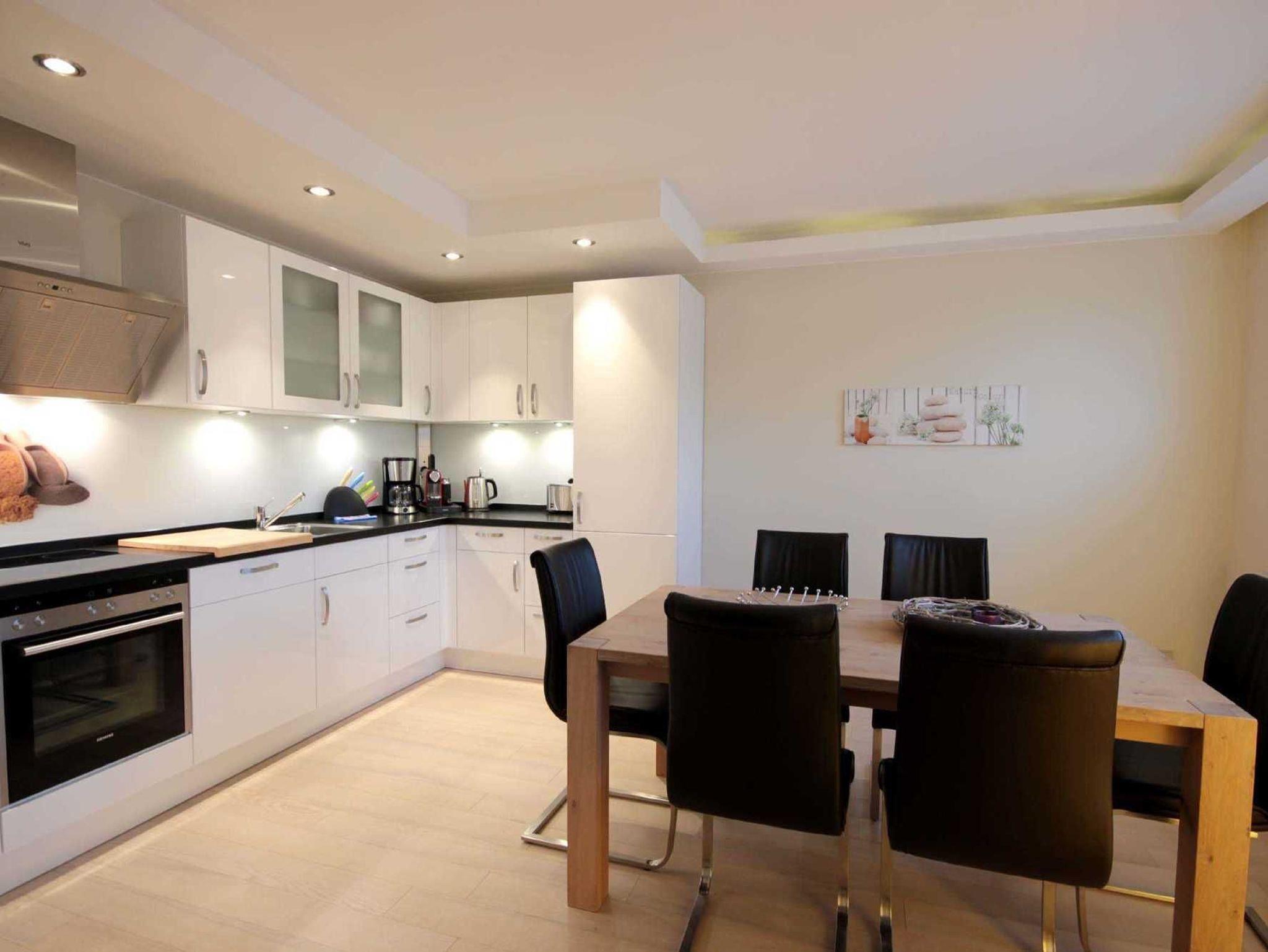 Im großzügigen Wohnbereich erwartet Sie eine bequeme Ledersitzgruppe zum gemeinsamen Verweilen, ein Flachbild-TV, Blue-ray/DVD-Player sowie ein kostenfreier WLAN-Zugang. Die offen gestaltete Winkelküche mit Marken-Einbaugeräten, u.a. mit Geschirrspüler, Backofen, Cerankochfeld, Kühlschrank sowie Kaffeemaschine, Nespressomaschine, Wasserkocher, Toaster bietet Ihnen zudem einen großen Esstisch mit Freischwinger-Stühlen.