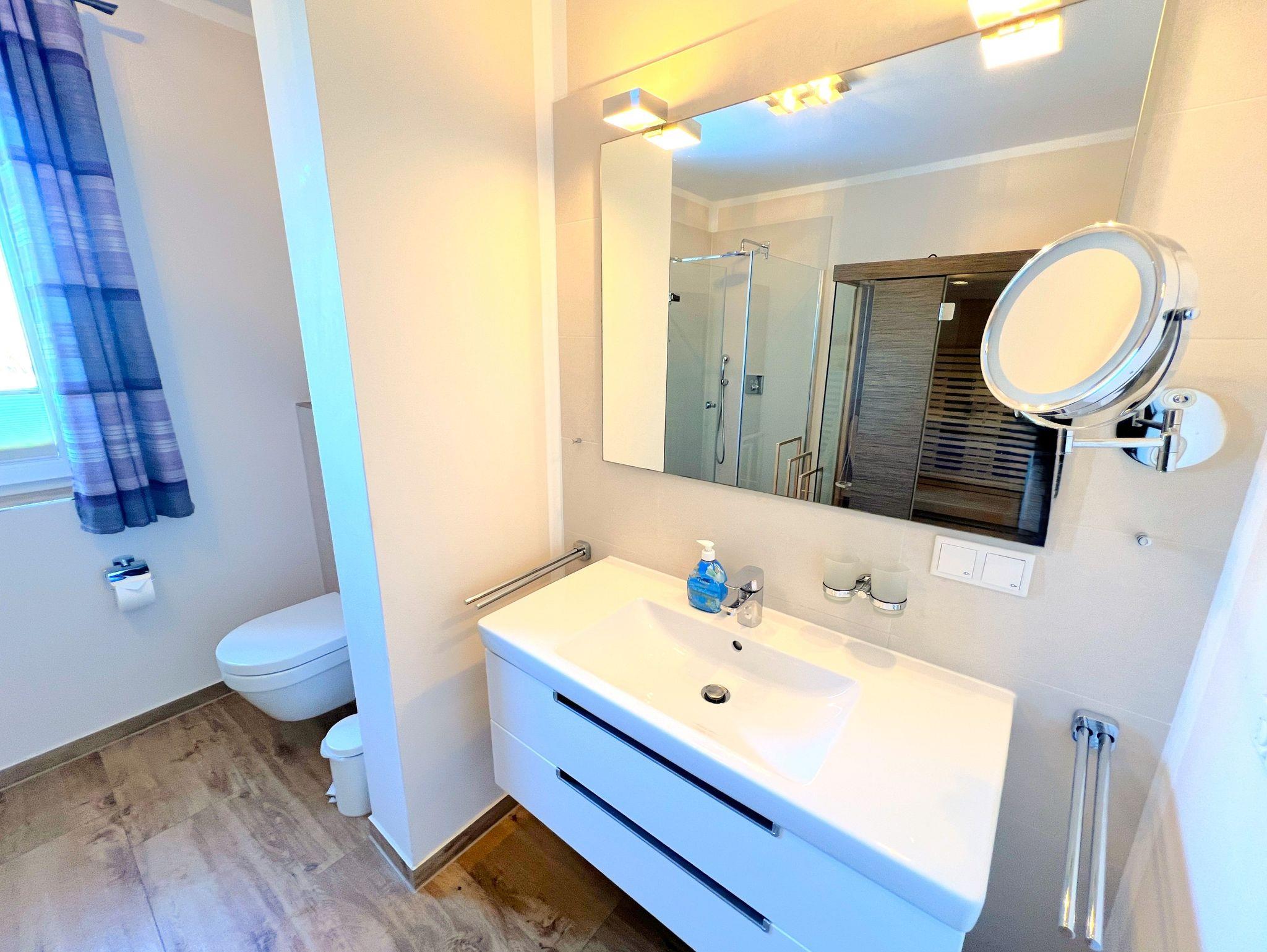 Erstklassige 5-Sterne-Ferienwohnung an der Ostsee. Verbringen Sie mit bis zu 4 Personen einen wundervollen Ostseeurlaub in der 77m² großen 3-Raum-Ferienwohnung in der Residenz Seeterrassen im Ostseebad Binz. Zu den Highlights der vollständig eingerichteten Ferienwohnung gehören hochwertige Hülsta-Möbel und Boxspringbetten, die Infrarot-Wärmekabine, Verdunkelungsplissees in den Schlafzimmern, Philips Ambilight Fernseher, PS4, ein großräumiger, überdachter Balkon mit Blick auf den Schmachter See und Fermob-Möbeln, sowie der kostenlos nutzbare Strandkorb am Ostseestrand (Mai bis September). Über den Aufzug im Haus ist die Wohnung barrierefrei erreichbar. Zwei eigene Pkw-Stellplätze sowie ein eigener Keller für E-Bikes runden den Urlaubskomfort ab.