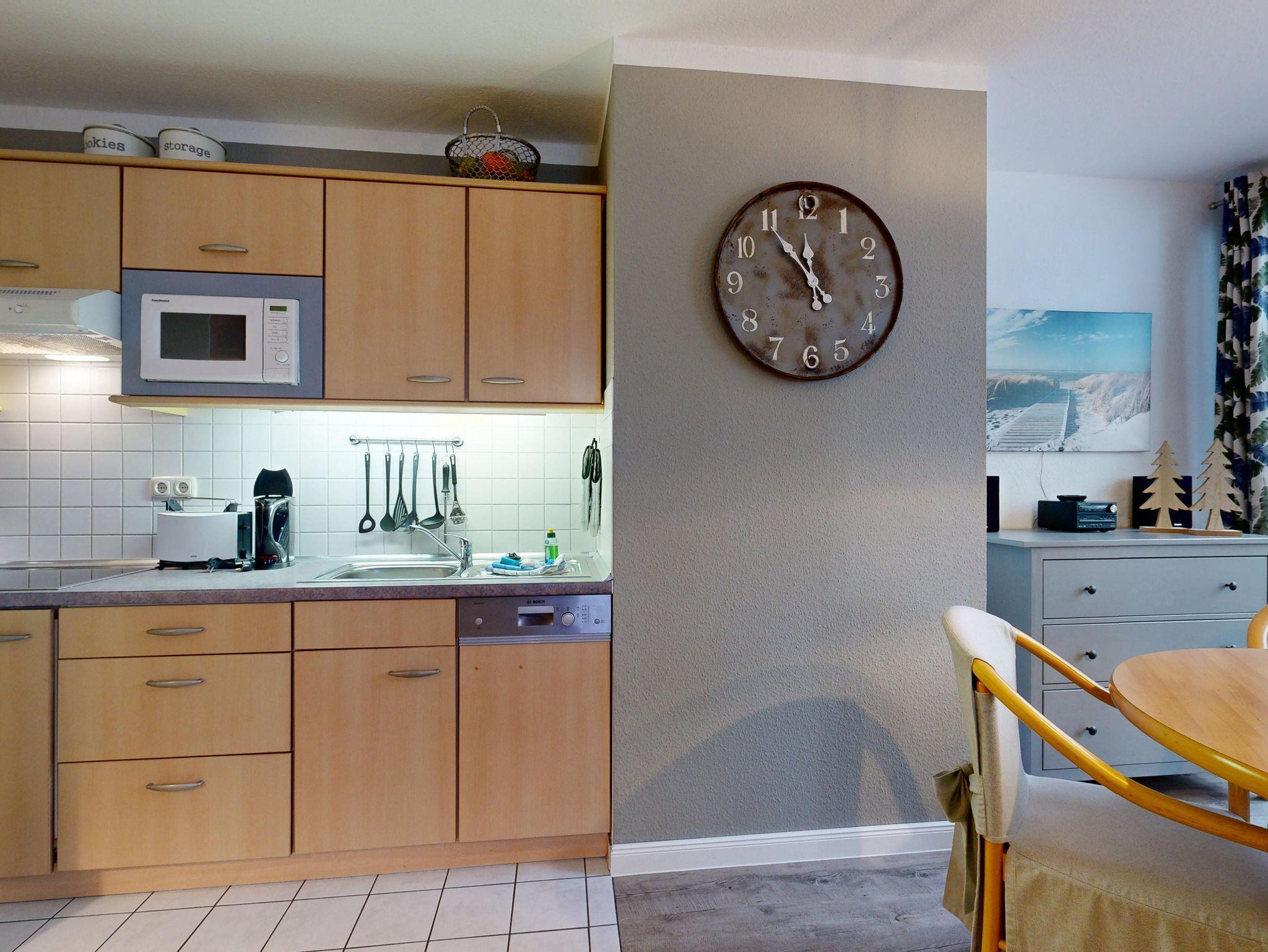 Küchenzeile mit Spülmaschine, Ceranfeld, Mikrowelle, Kaffeemaschine, Toaster und Kühlschrank mit Gefrierfach