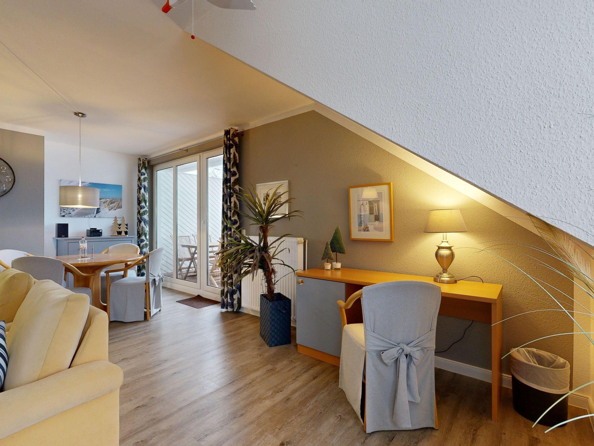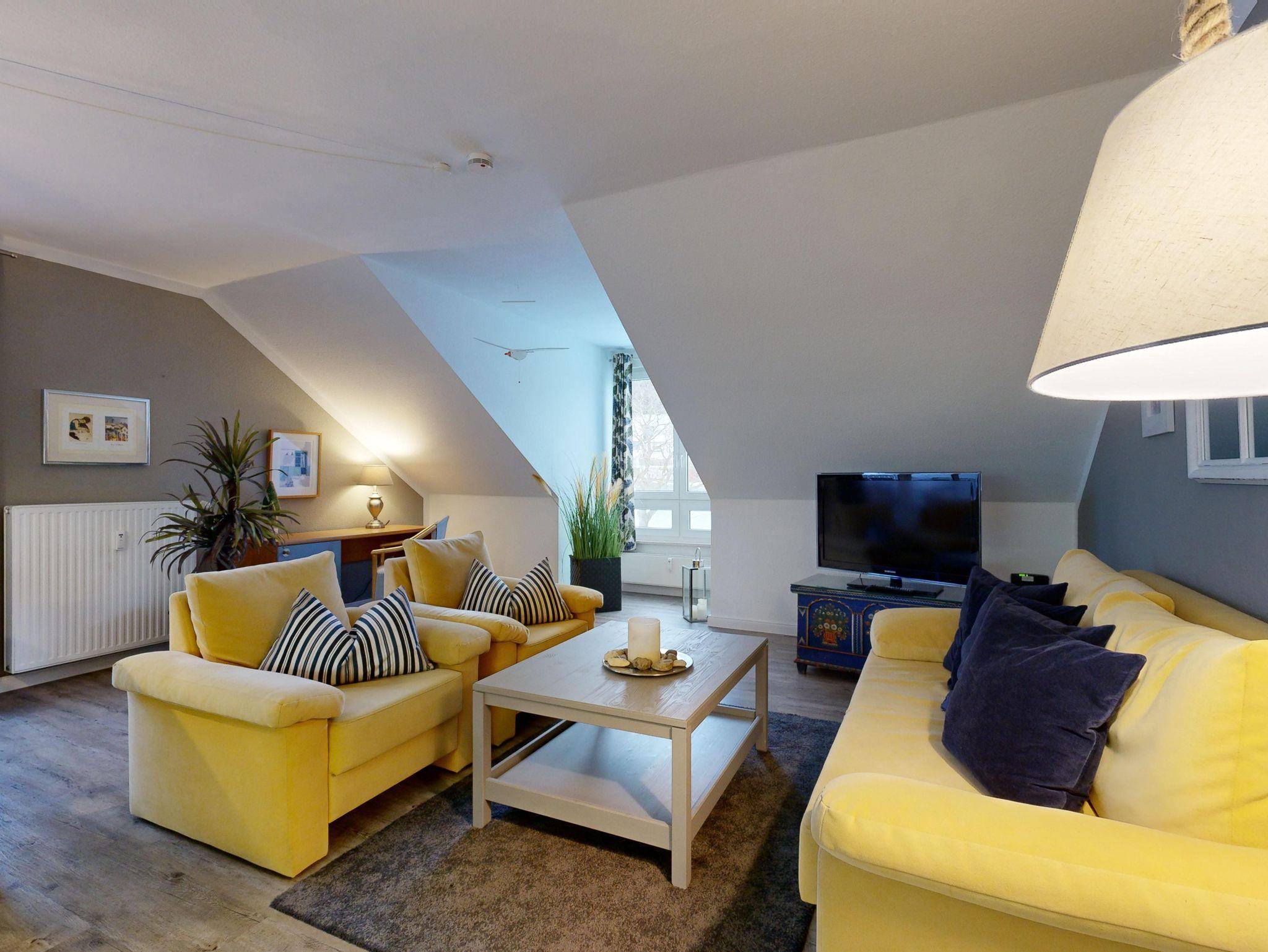 Wohnzimmer: Couchgarnitur (Schlafgelegenheit für 2 Personen), 2 Sessel, Kabel-TV, Stereoanlage, Internetanschluss (WLAN), Esstisch und Schreibtisch