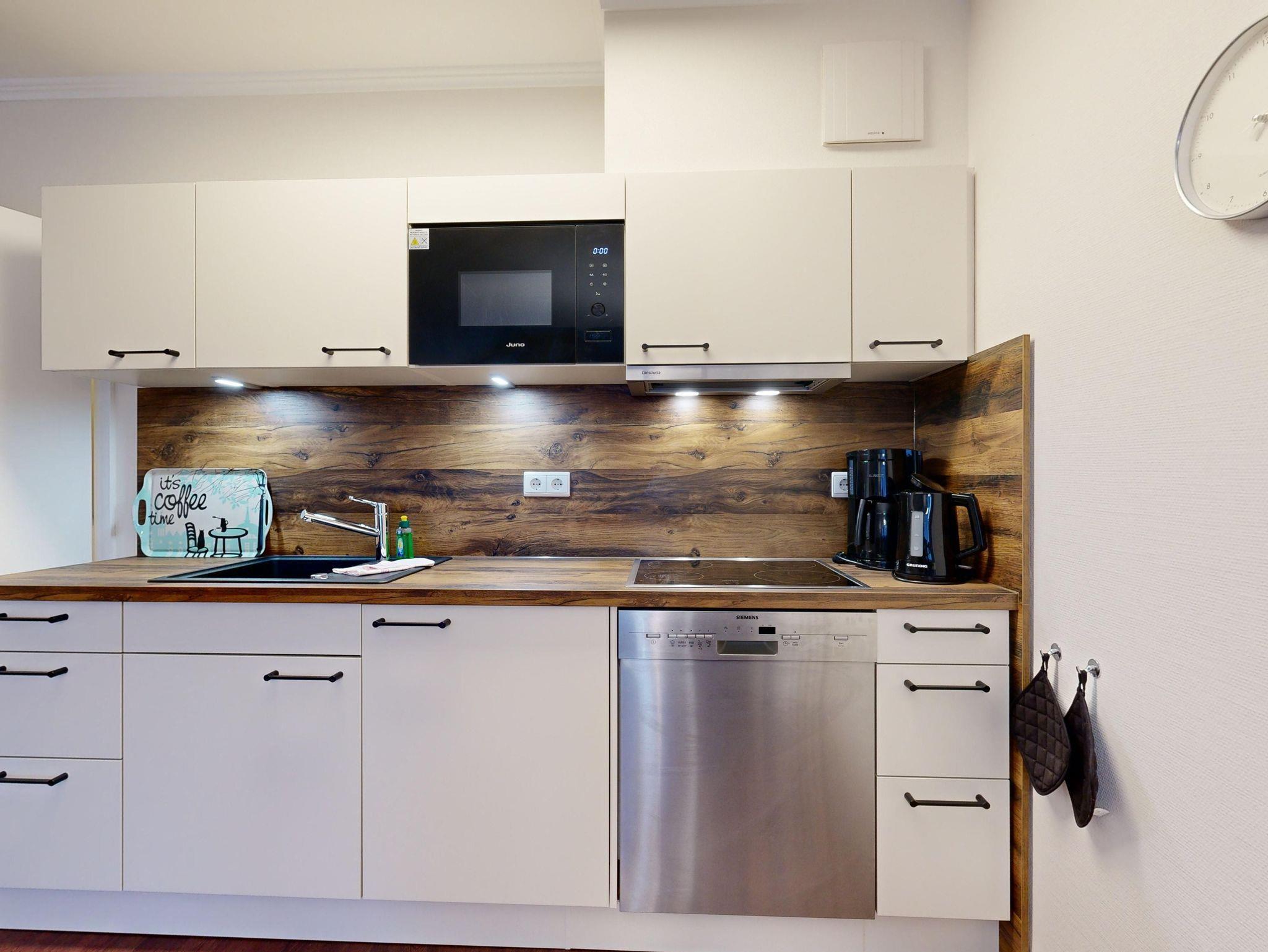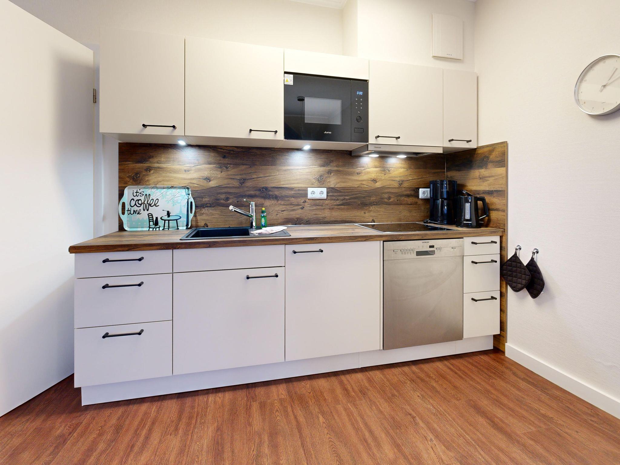 Küche: Küchenzeile, Ceran-Kochfeld, Spülmaschine, Kühlschrank mit Gefrierfach, Mikrowelle mit Backfunktion, Kaffeemaschine, Toaster und Wasserkocher
