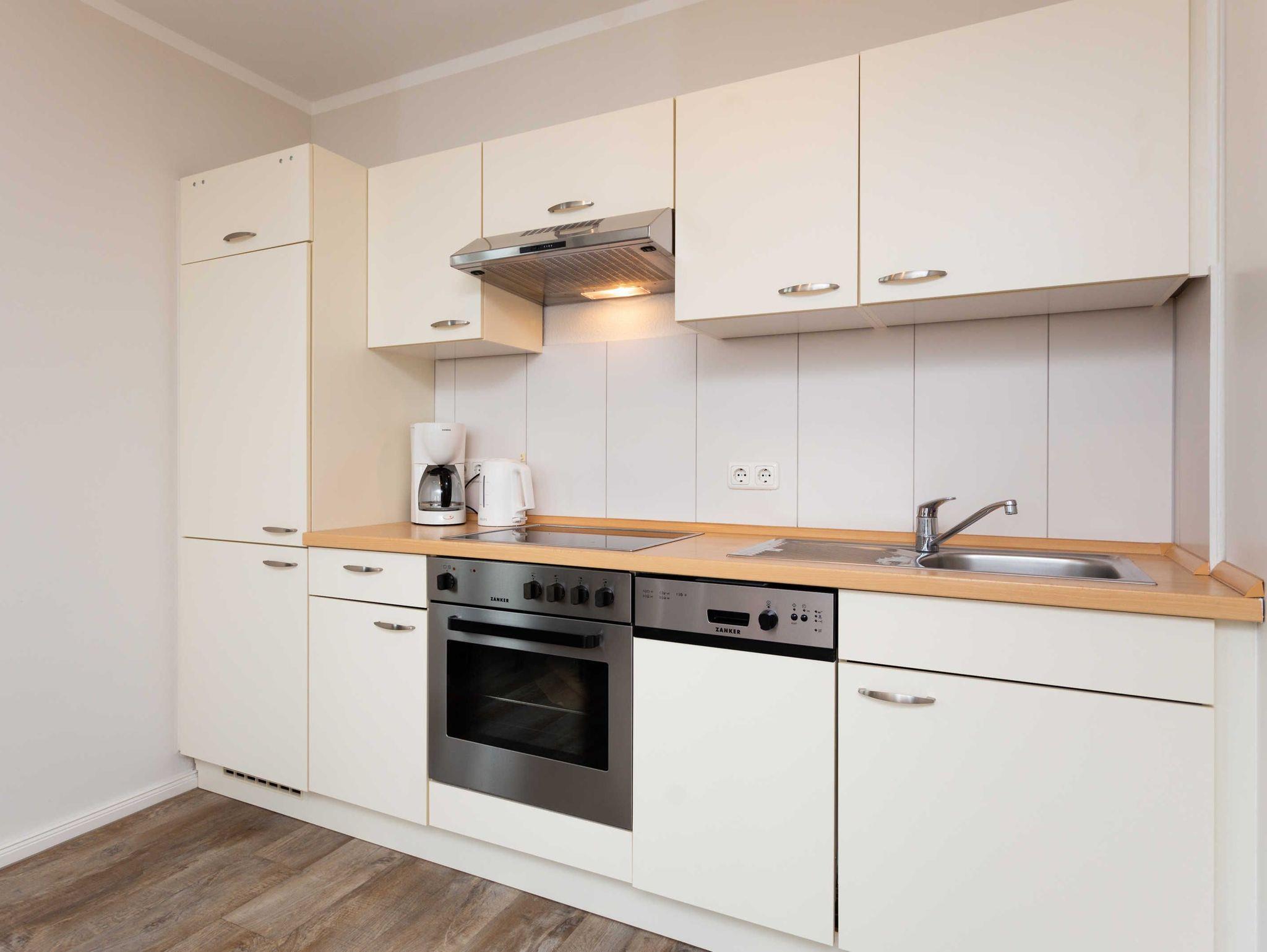 Küche mit Ceranfeld, Kühlschrank mit Gefrierfach, Backofen, Spülmaschine, Toaster, Wasserkocher, Kaffeemaschine