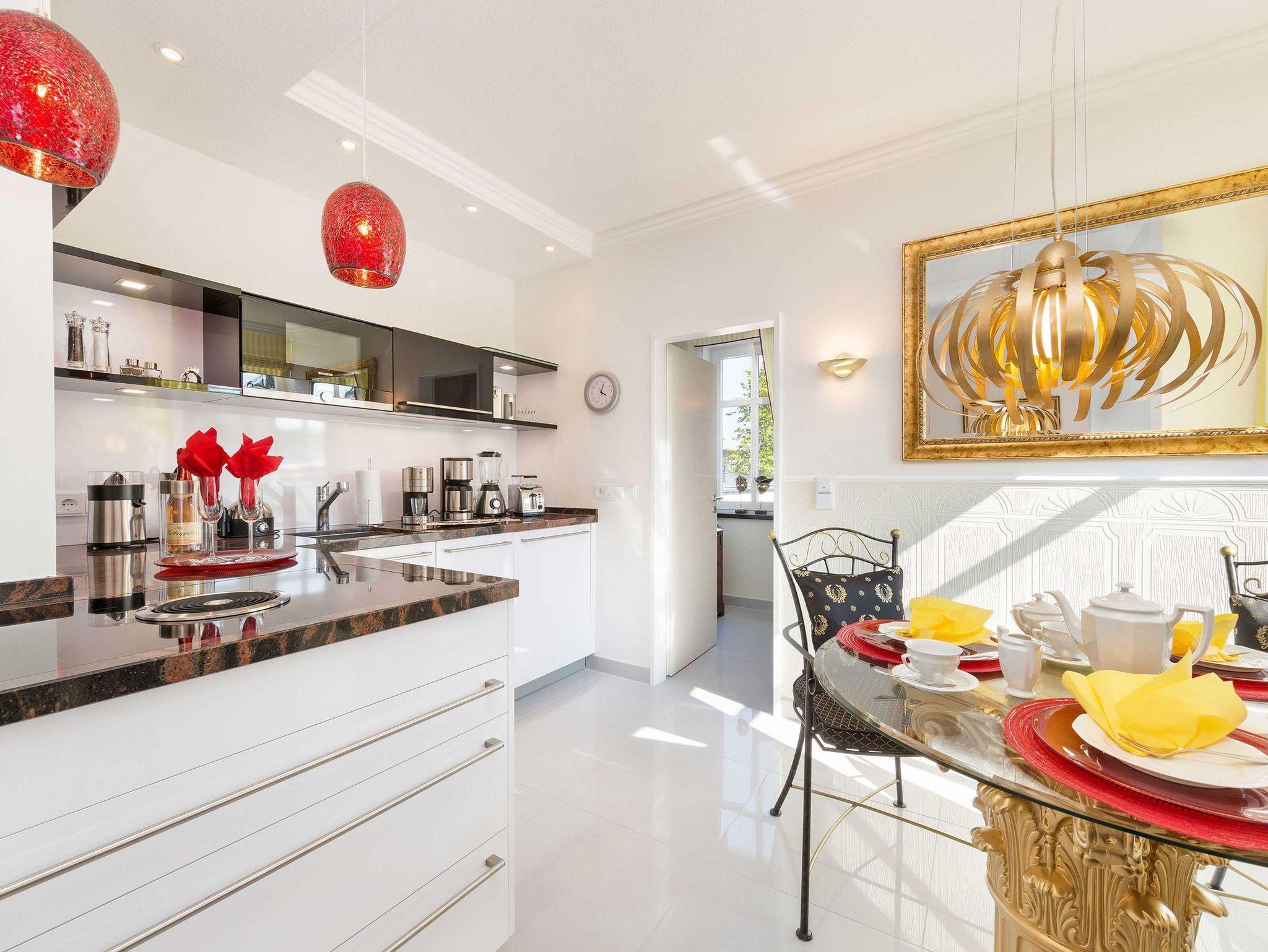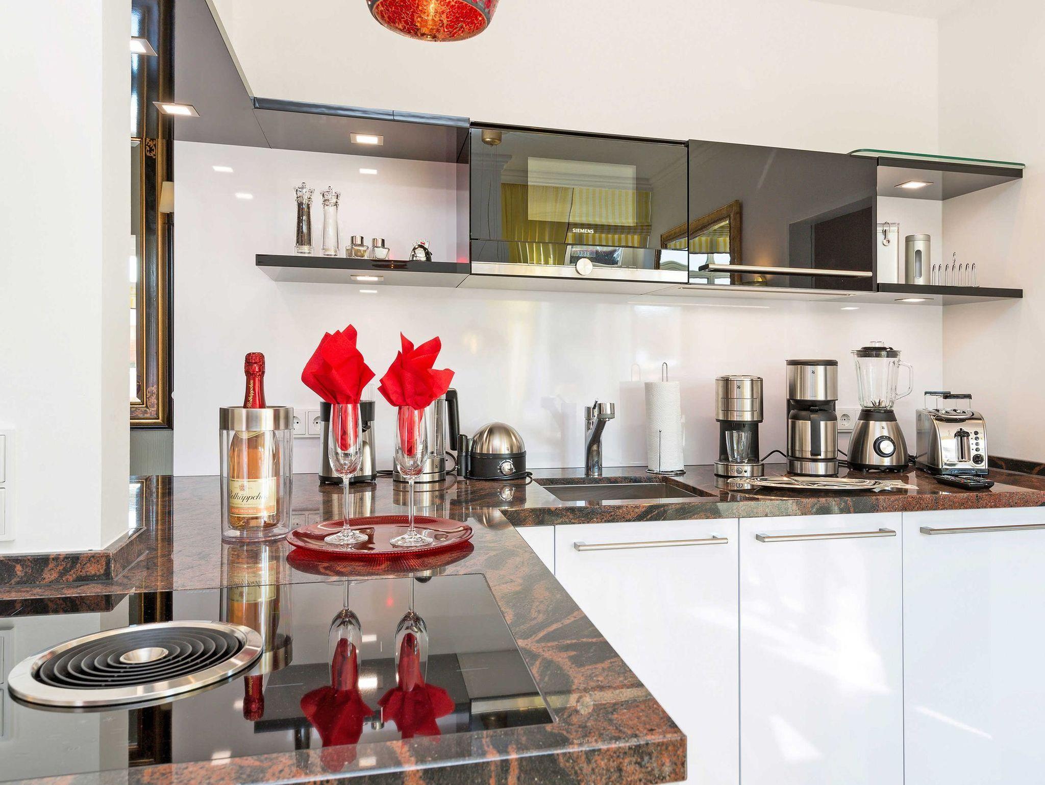 Die hochwertige LEICHT-Einbauküche ist in elegantem Weiß und Schwarz gehalten und mit einer roten Granit-Arbeitsplatte versehen. Sie verfügt über einen kleinen Weinkühlschrank, einen Kühlschrank mit Gefrierfach, einen Backofen, ein BORA 4-Zonen-Cerankochfeld mit Induktion und Dunstabzug nach unten, eine Spülmaschine, eine Mikrowelle und diverses Kleininventar, das die Küchenausstattung komplettiert. Dank Kaffeemaschine, Cafe-Espresso-Pads-Automat, Toaster, Wasserkocher, Eierkocher, Standmixer und elektr. Zitronenpresse etc. müssen Sie auf keinen Komfort verzichten. Und in dem großzügig und beleuchteten Glas-Hochschrank ist all das schöne Porzellan Maria Weiß von Rosenthal wie auch schöne Gläser zu finden. Am exquisiten Säulen-Glastisch können Sie bequem auf geschmiedeten Armlehnstühlen mit angepassten Sitzauflagen und Kissen Platz nehmen.
