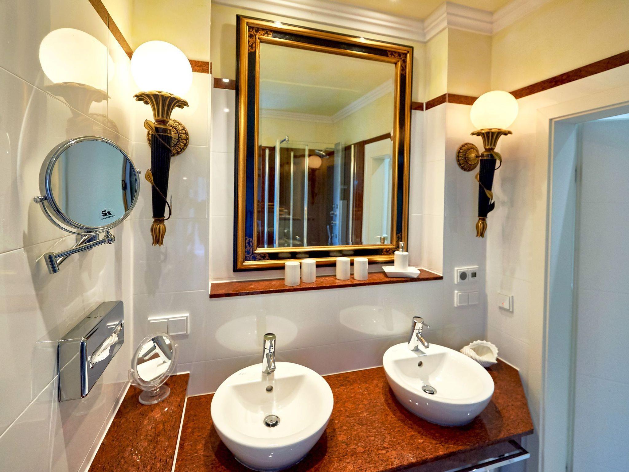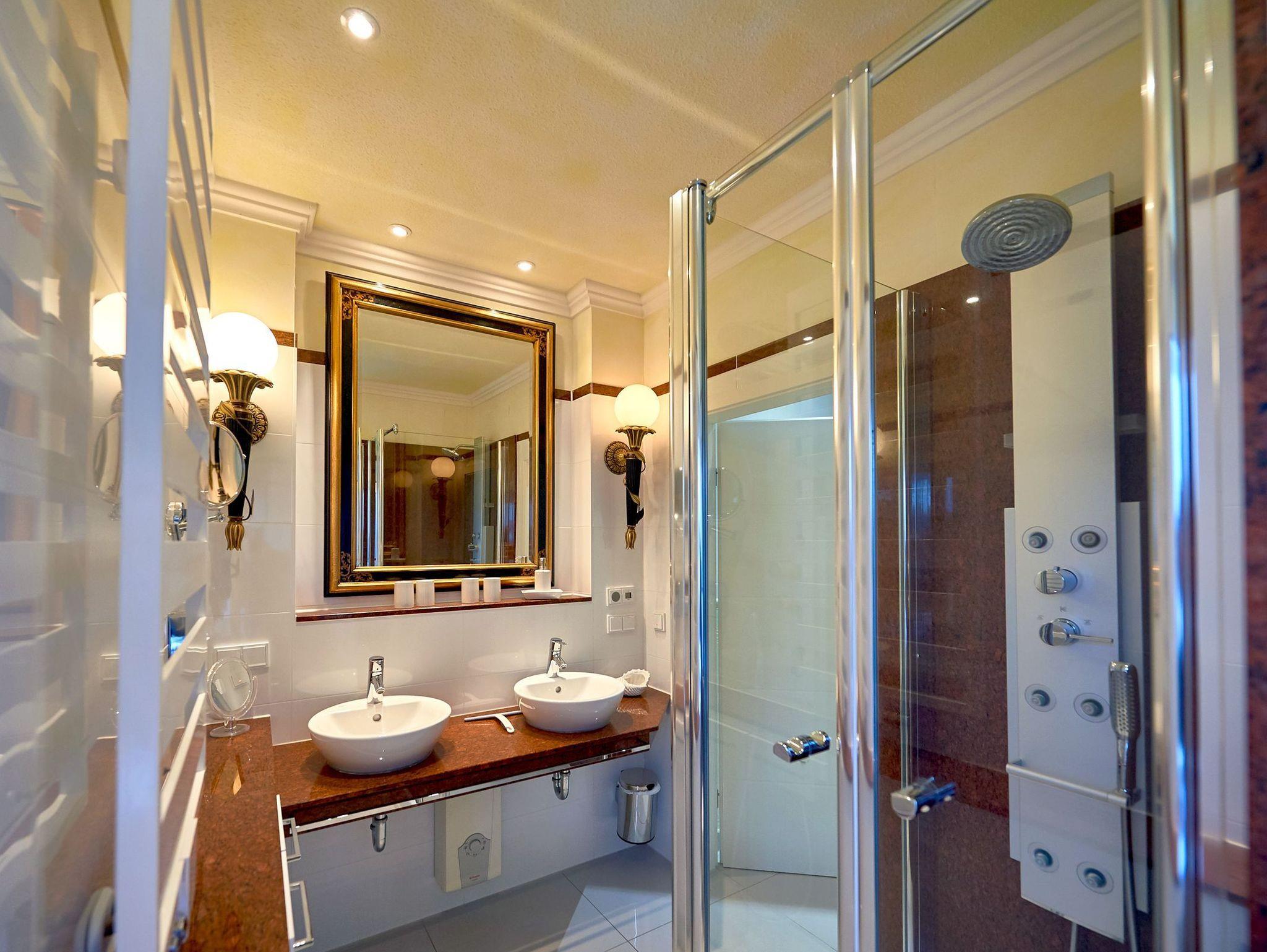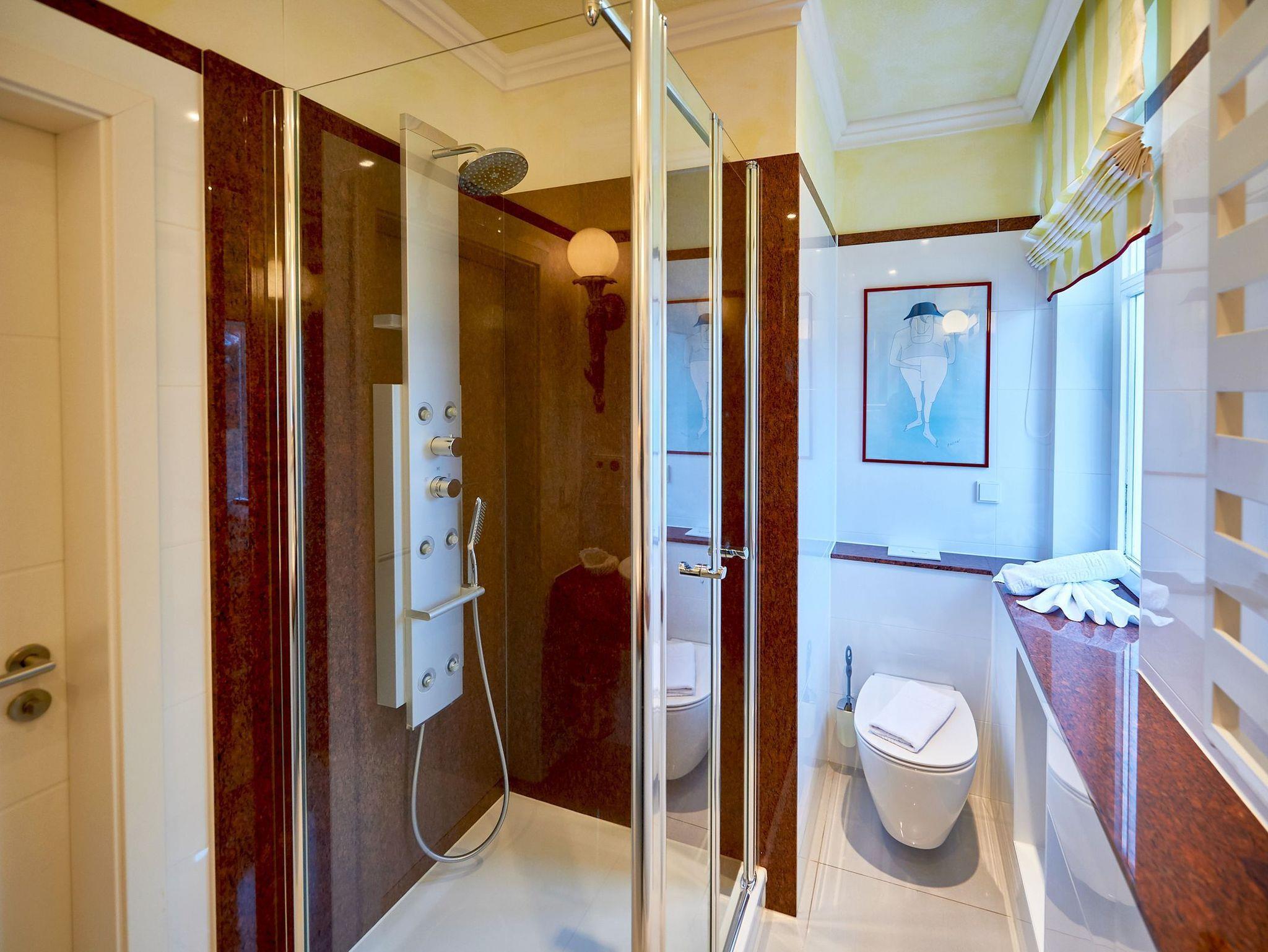 Das in exklusivem weißem und rotem Granit gehaltene Badezimmer mit Fenster überzeugt mit einem Hansgrohe-Duschpaneel inklusive Massagedüsen und Tellerdusche, zwei Aufsatzwaschbecken und randlosem WC. Ein prächtiger Spiegel mit Wandfackeln, genügend Ablageflächen, ein Fön und ein Kosmetikspiegel sowie ein integriertes Radio im Steckdosen/Schaltersystem runden den stimmigen Gesamteindruck der Wohnung ab.
