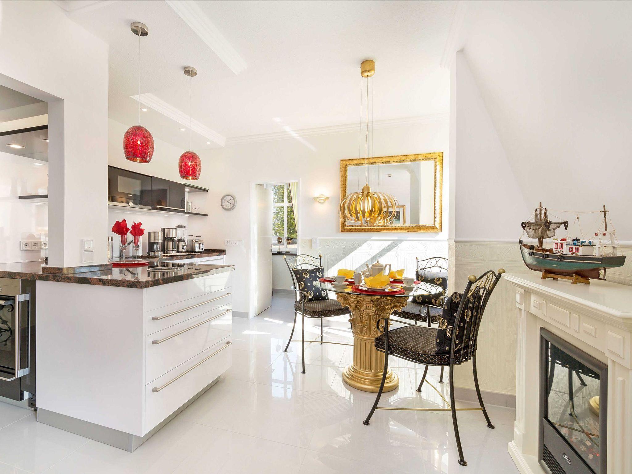 Die hochwertige LEICHT-Einbauküche ist in elegantem Weiß und Schwarz gehalten und mit einer roten Granit-Arbeitsplatte versehen. Sie verfügt über einen kleinen Weinkühlschrank, einen Kühlschrank mit Gefrierfach, einen Backofen, ein BORA 4-Zonen-Cerankochfeld mit Induktion und Dunstabzug nach unten, eine Spülmaschine, eine Mikrowelle und diverses Kleininventar, das die Küchenausstattung komplettiert. Dank Kaffeemaschine, Cafe-Espresso-Pads-Automat, Toaster, Wasserkocher, Eierkocher, Standmixer und elektr. Zitronenpresse etc. müssen Sie auf keinen Komfort verzichten. Und in dem großzügig und beleuchteten Glas-Hochschrank ist all das schöne Porzellan „Maria Weiß“ von Rosenthal wie auch schöne Gläser zu finden. Am exquisiten Säulen-Glastisch können Sie bequem auf geschmiedeten Armlehnstühlen mit angepassten Sitzauflagen und Kissen Platz nehmen.
