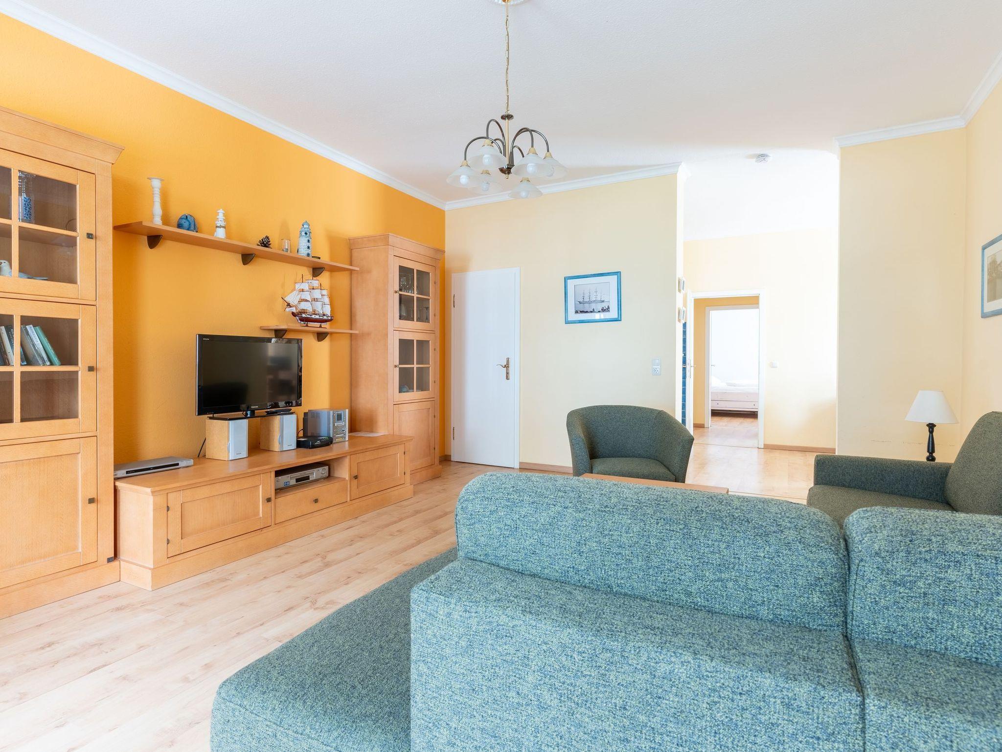 Vom Wohnzimmer aus erreichen Sie die beiden möblierten Balkone mit traumhaften Blick auf die Ostsee. Die Couch im Wohnbereich lässt sich mit wenigen Handgriffen zu einem Schlafplatz für 2 Personen ausklappen. Auf der Couch können Sie entspannt eine Urlaubstag vor dem Flat TV ausklingen lassen.