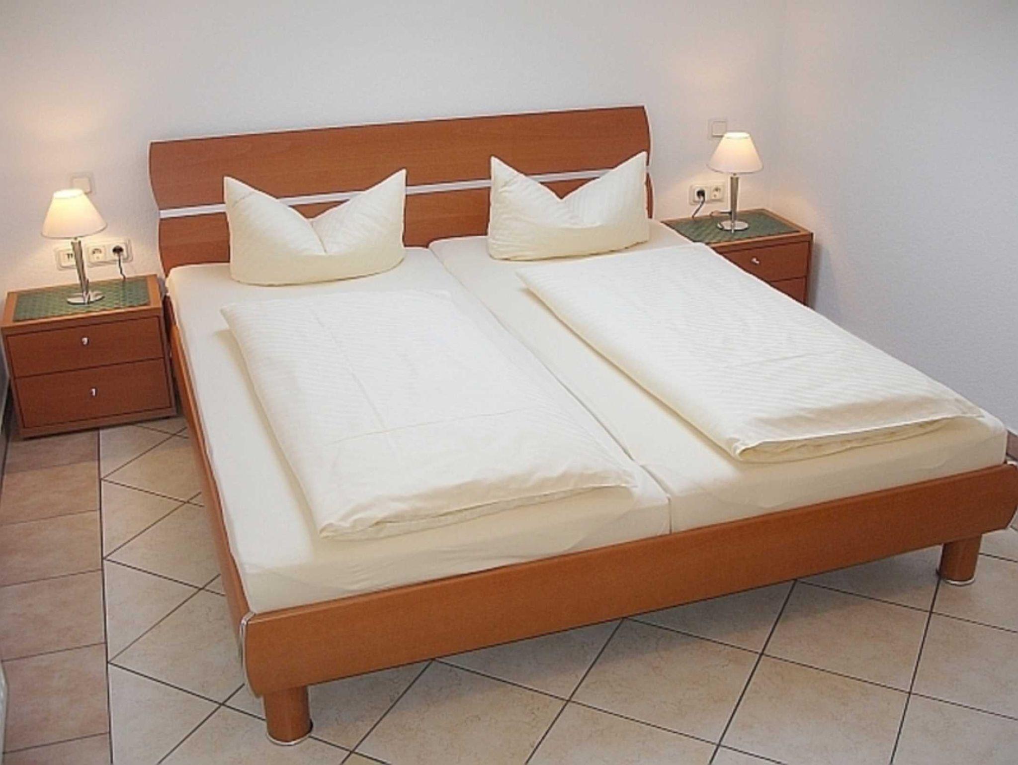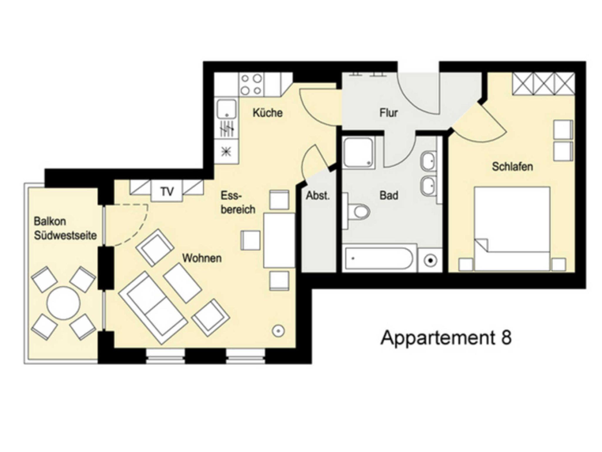 Appartement 8, 2.OG, (ca. 54 qm, max. 4 Personen) 1 separates Schlafzimmer, 1 Wohn- Schlafzimmer mit Wohnküche und Essbereich, Bad (Dusche + Badewanne), Abstellraum, Balkon Südwestseite, Telefon, Flat-TV, Waschmaschine, Fön, W-LAN
