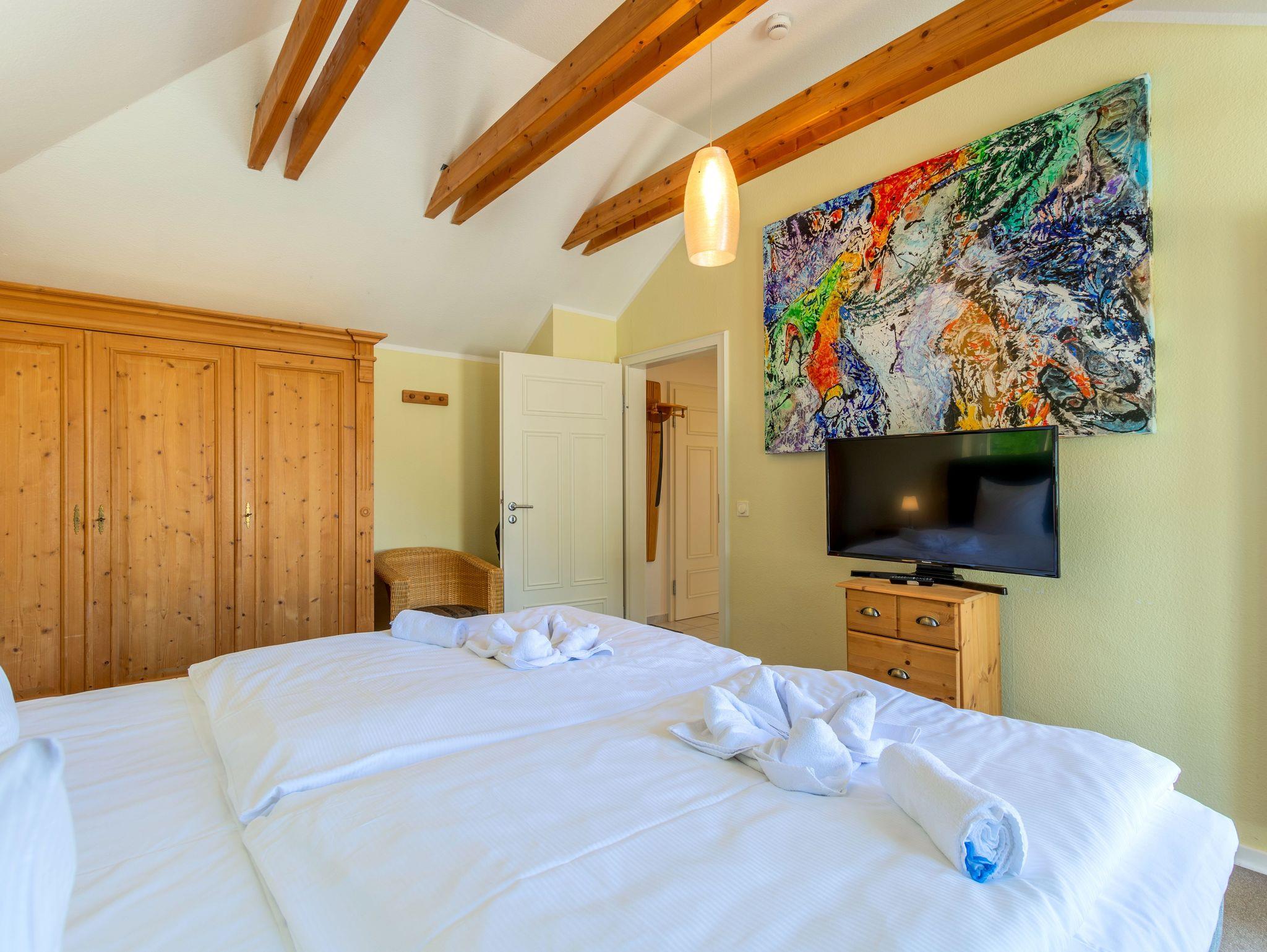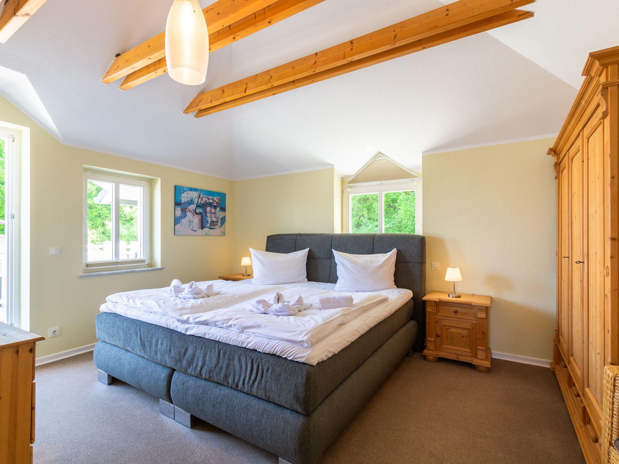 Das großzügige Wohn- und Esszimmer ist lichtdurchflutet und mit einer gemütlichen Sitzecke, einem Schlafsofa sowie einer komplett ausgestatteten Küchenzeile (inkl. E-Herd mit Ceranfeld) eingerichtet. Das separate Schlafzimmer mit komfortablem Boxspringbett ist zur ruhigen Waldseite der Granitz ausgerichtet und bietet Zugang zu einem seitlichen Balkon ? hier genießen Sie traumhaften Ostseeblick und die warme Mittagssonne.