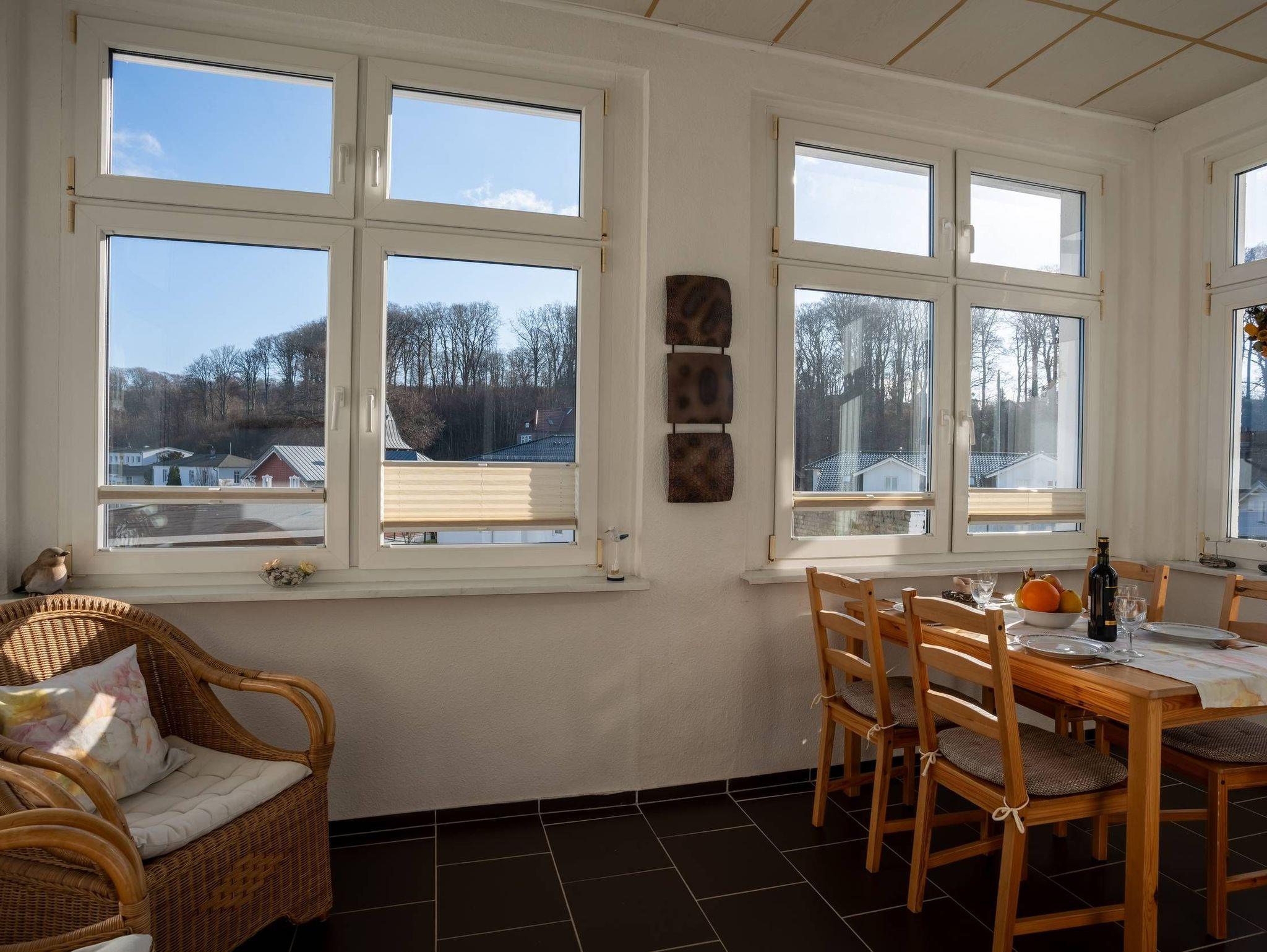 Im Wohnbereich befindet sich ein komplett ausgestattete Küchenzeile, TV, Radio sowie eine gemütliche Couchecke. In der angerenzenden Veranda können Sie entspannt ihre Mahlzeiten geniessen und gemütliche Spieleabende mit Ihrer Familie verbringen. Vom Wintergarten und vom Flur aus erreichen Sie auch das riesige Badezimmer mit Badewanne und Dusche, Das große Schlafzimmer verfügt über ein Doppelbett sowie Balkon, von dem Sie auch die Seebrücke und die Ostsee sehen können. (Seitlcher Blick). Im kleinen Schlafzimmer befinden sich 2 Einzelbetten.