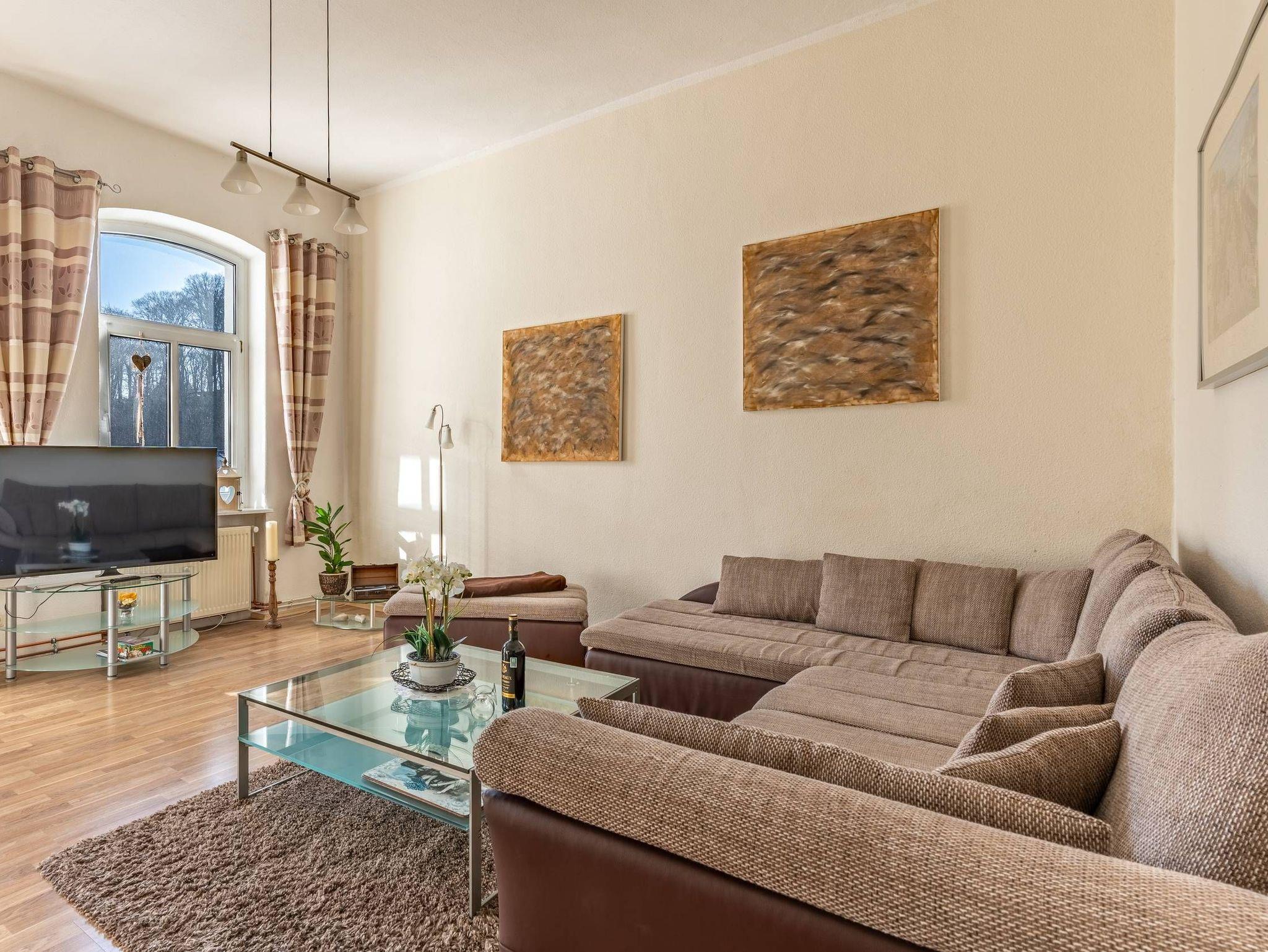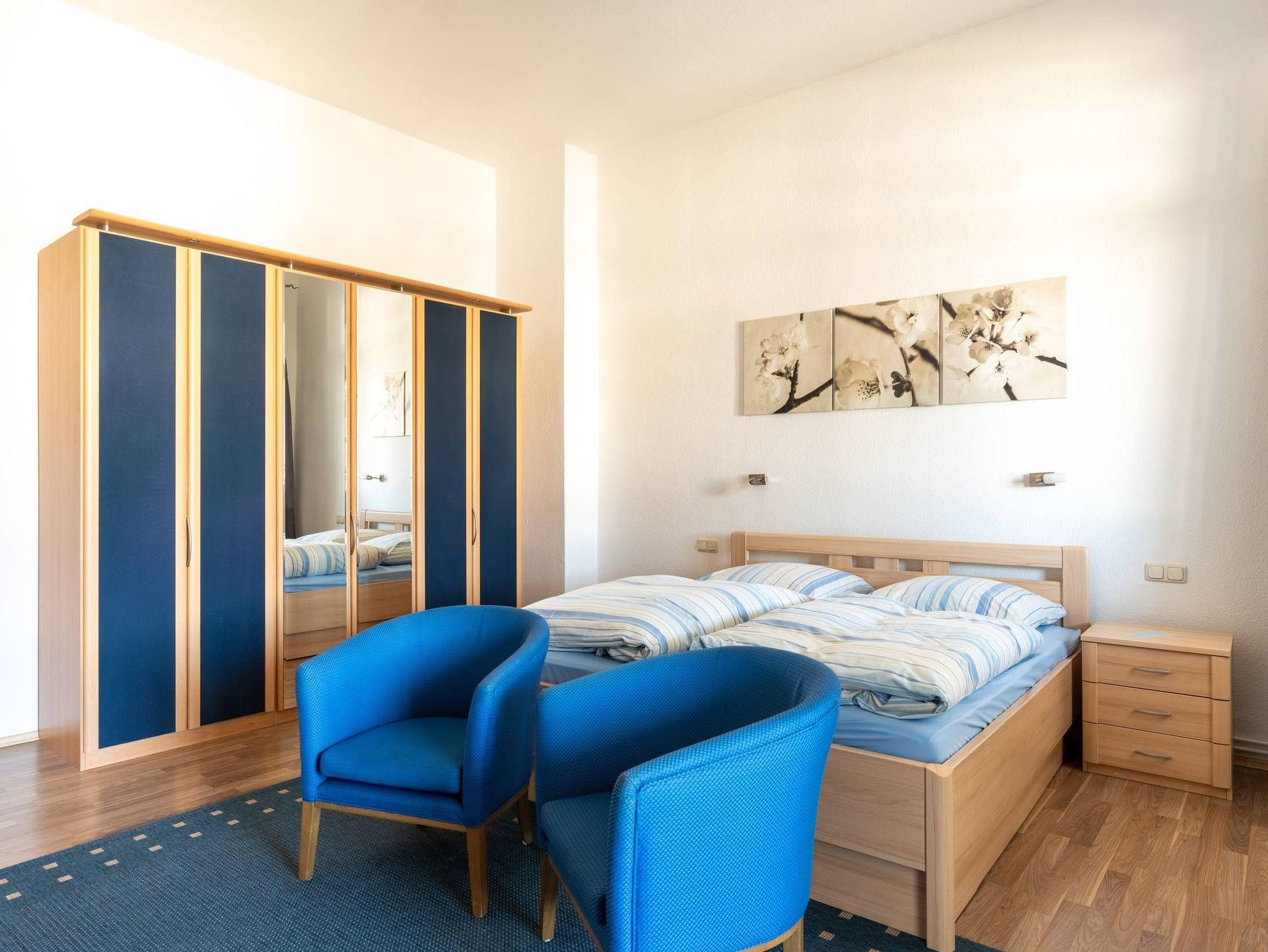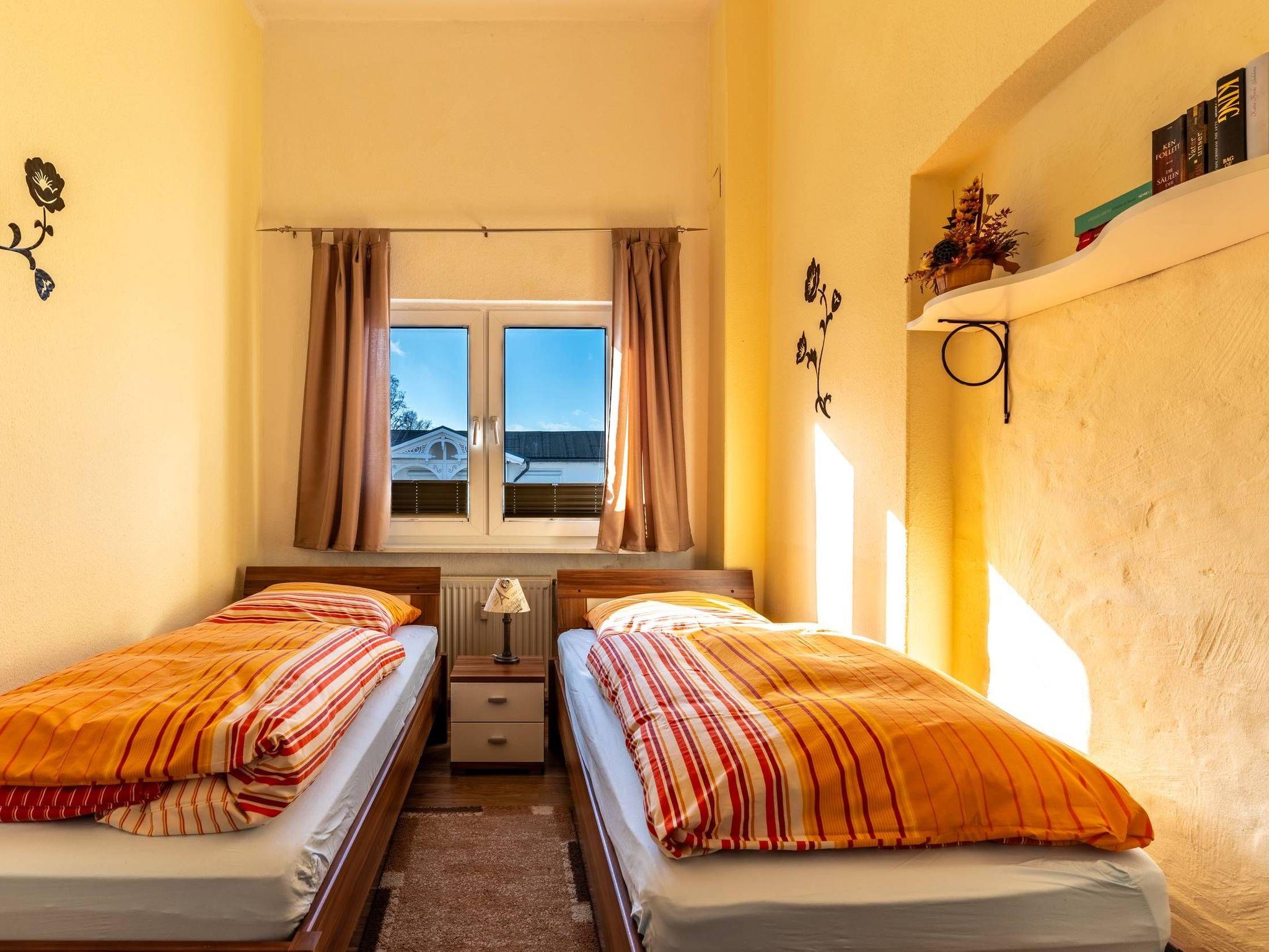 Die Wohnung 5 befindet sich im Haupthaus der Villa Seiler im zweiten Stock und hat eine Größe von ca. 80 qm. Sie ist komplett eingerichtet und bietet Platz für 4 Personen. Eine weitere Person (bis 14 Jahre) könnte auch auf der Couch im Wohnbereich übernachten (keine Schlafcouch).