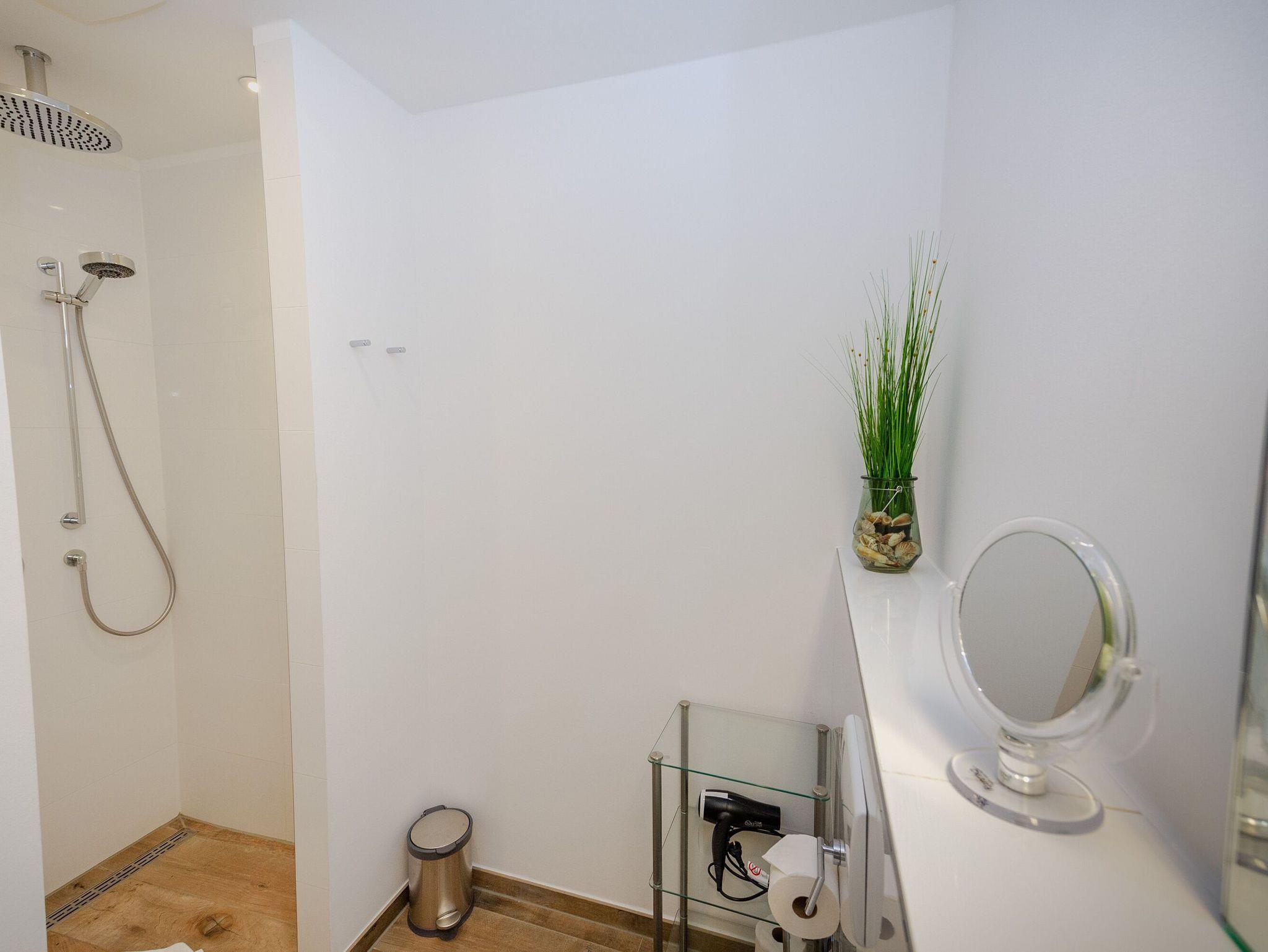 Das Badezimmer ist mit einer ebenerdigen Regendusche, WC, Waschbecken, Spiegel, Kosmetikspiegel, Fön und einem beheizbaren Handtuchtrockner bestens ausgestattet. Auch an genügend Ablageflächen und Haken für Ihre persönlichen Utensilien wurde gedacht.