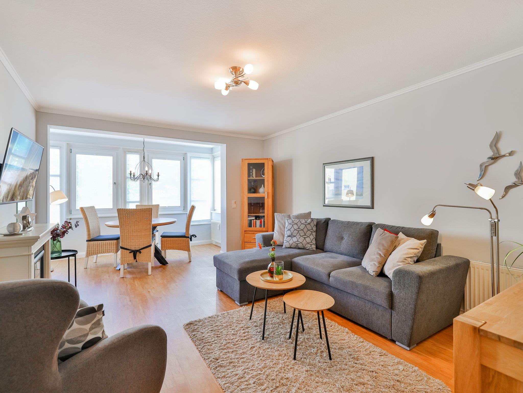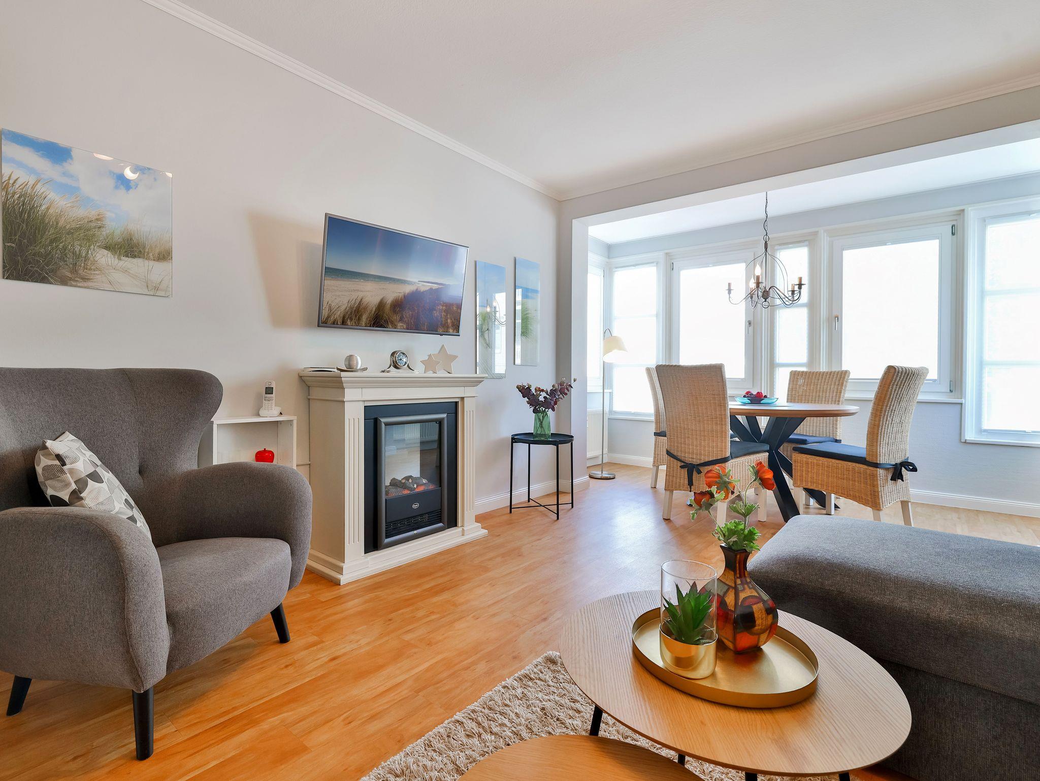 Moderne Ferienwohnung in Binz mit Strandkorb, Parkplatz und Elektrokamin, ideal für erholsame Tage an der Ostsee.
