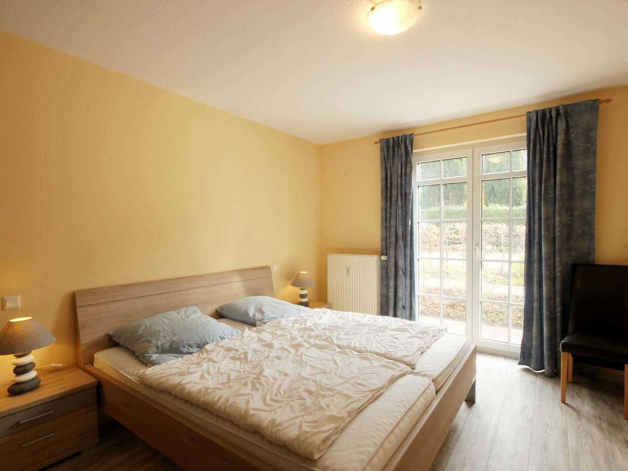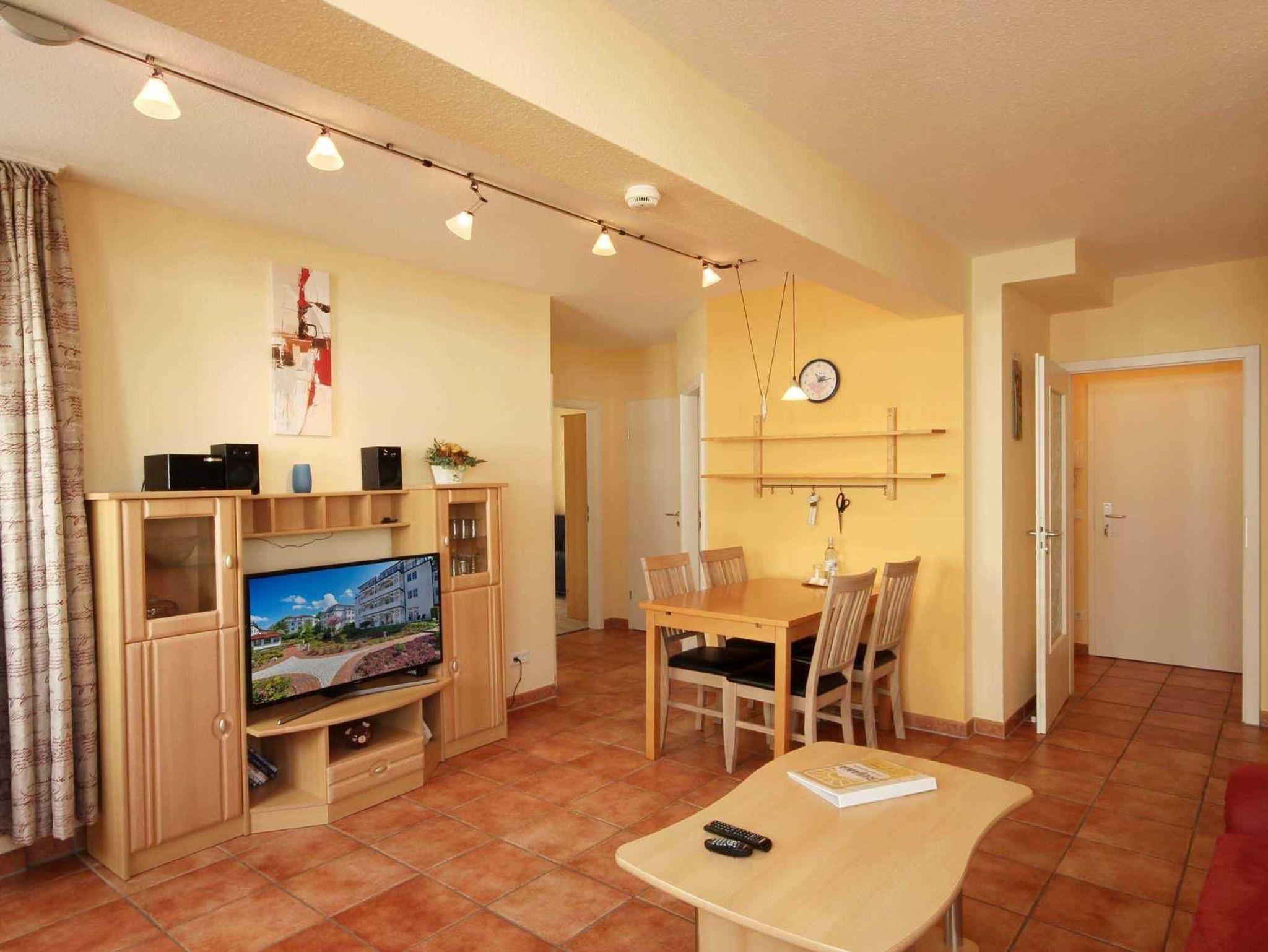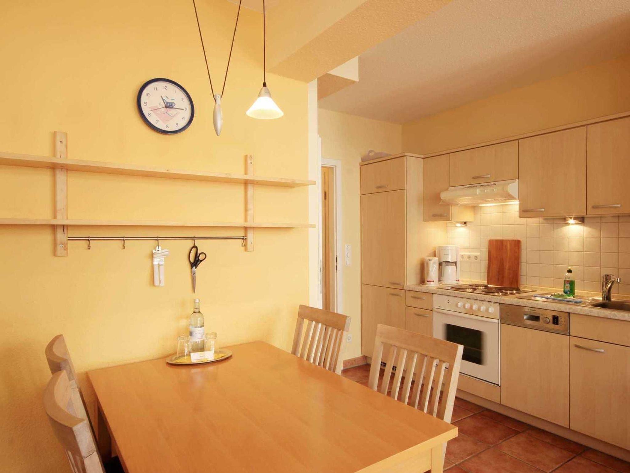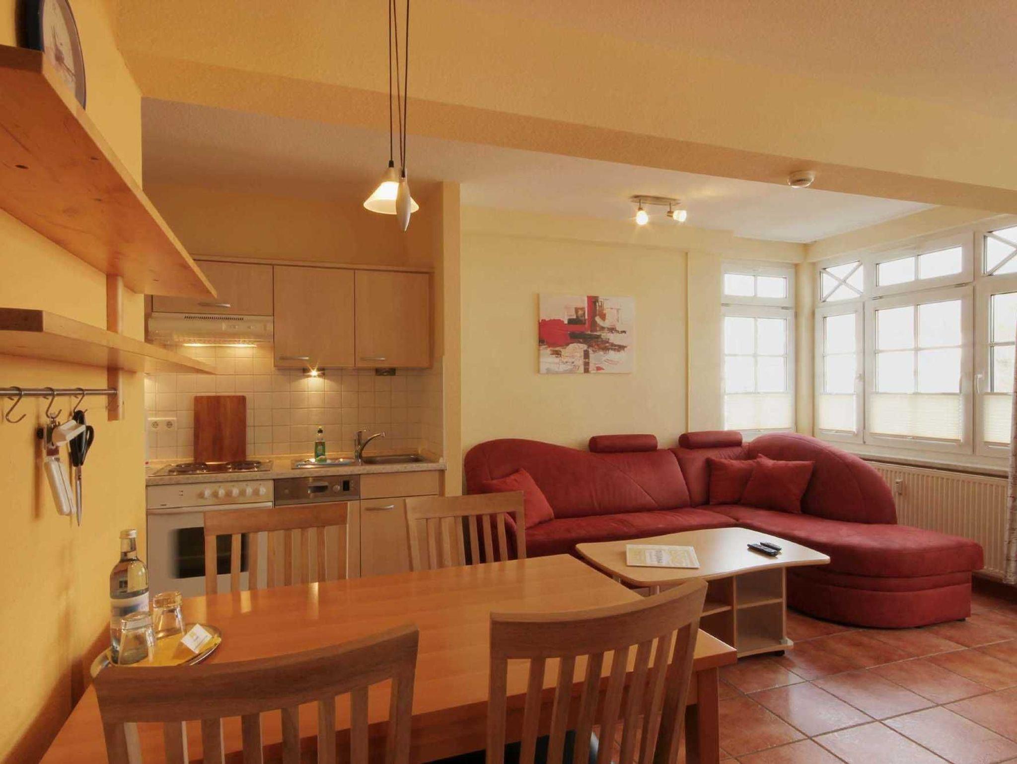 Die Wohnung 9RB33 befindet sich im Erdgeschoss der Villa Bernstein am Klünderberg 33. Die 3-Zimmer-Wohnung hat eine Größe von 56 m² und ist mit bis zu 6 Personen belegbar. Neben dem Wohnzimmer mit offener Küche gibt es 2 Schlafzimmer und ein Duschbad mit Waschtisch und WC. Ein Schlafraum ist mit einem Doppelbett und Kleiderschrank ausgestattet. Das 2. Schlafzimmer verfügt über eine Schlafcouch. Das Wohnzimmer verfügt ebenfalls über eine Schlafcouch, einen Esstisch, Flachbildfernseher, WLAN und Radio. Vom Wohnzimmer aus gelangen Sie auf die kleine Südterrasse. Die Küchenzeile ist mit Backofen, E-Herd mit 4 Kochplatten, Geschirrspüler, Kaffeemaschine, Wasserkocher und Toaster perfekt ausgestattet.