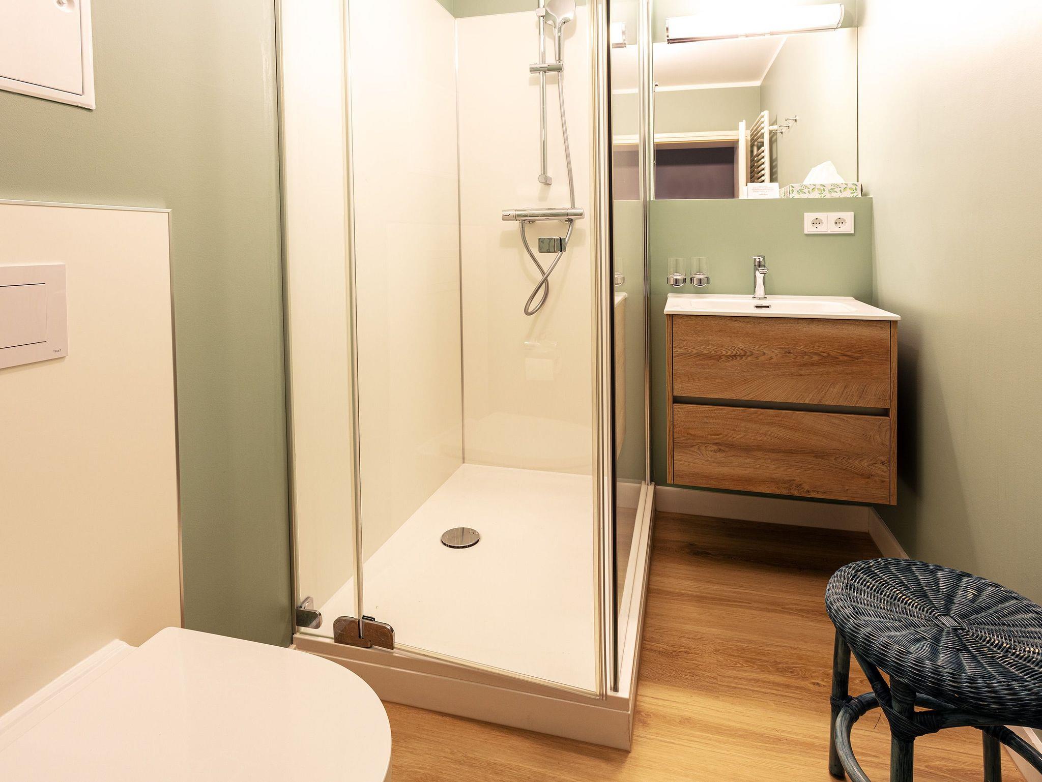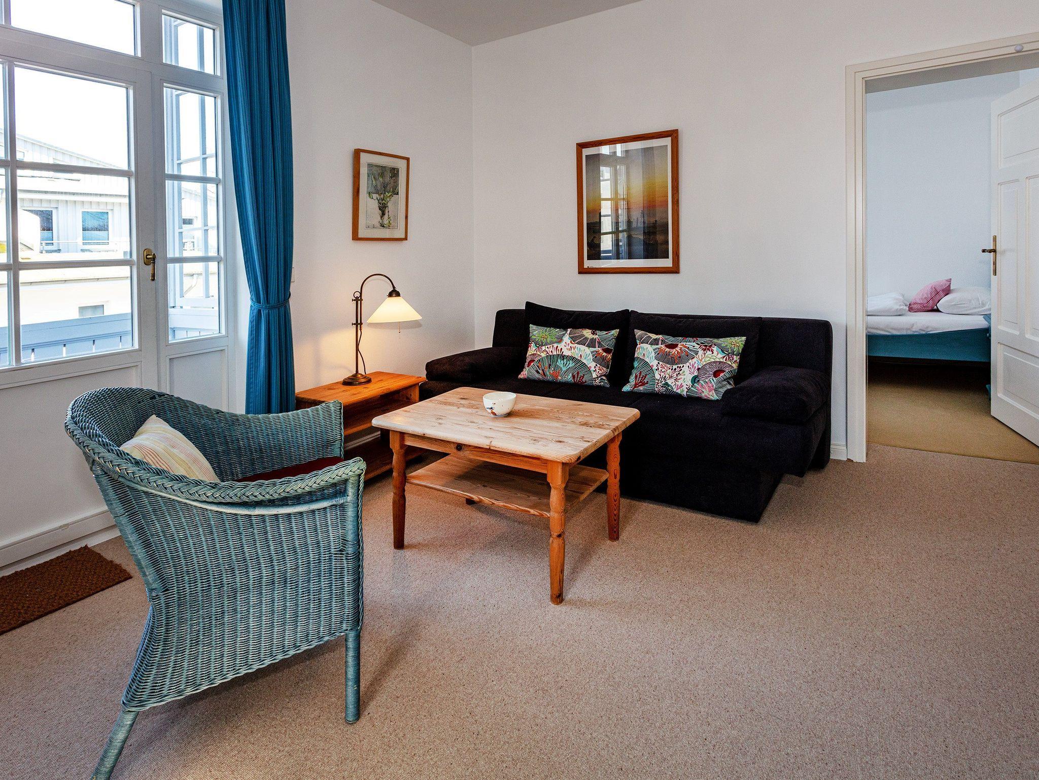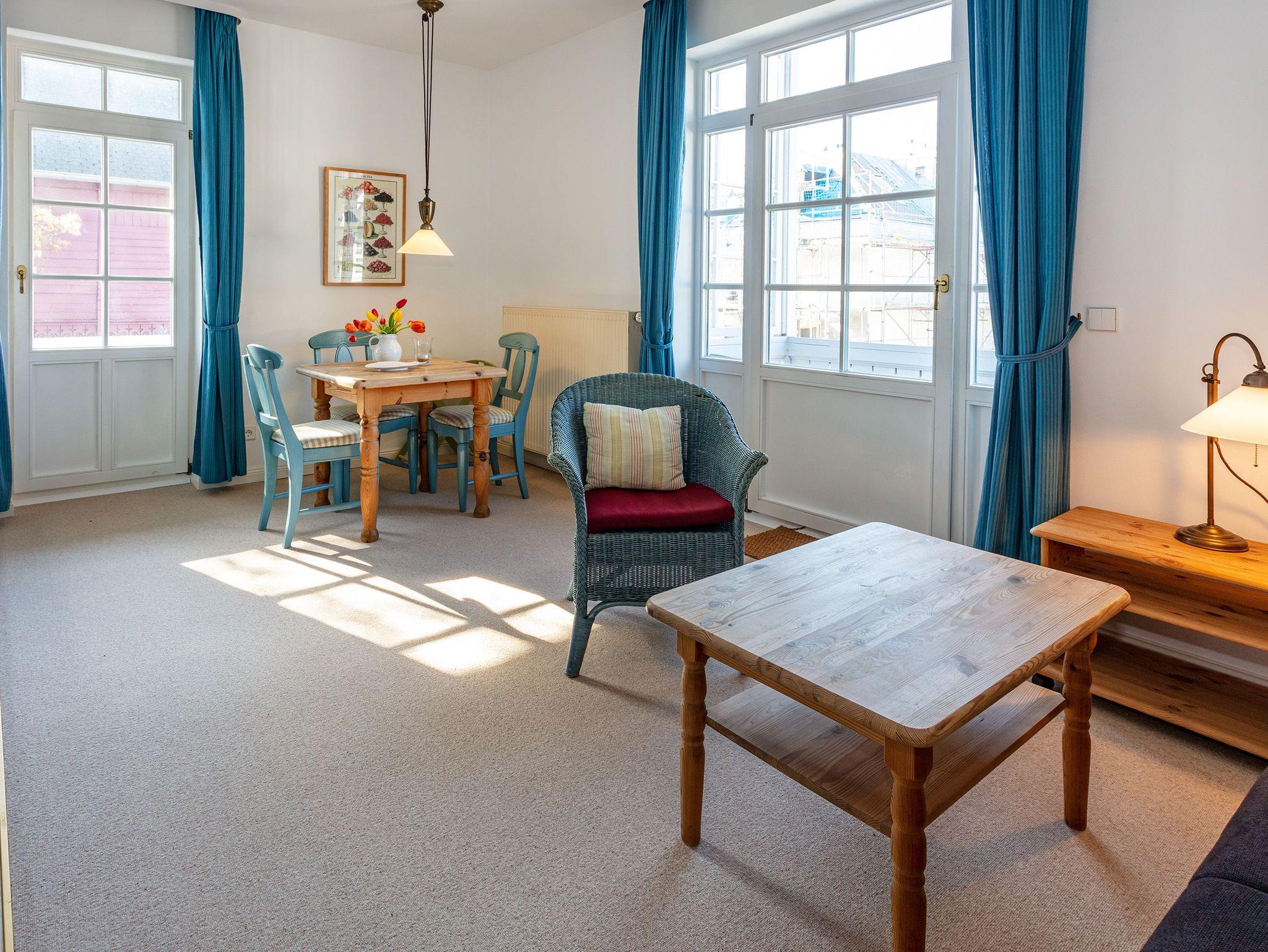 Die 60 m² große Wohnung 12 mit einem hellen Teppichboden bietet Platz für drei Personen und hat die Möglichkeit zur Aufbettung (Schlafsofa 1,40 m x 2,00 m) für einen weiteren Gast.