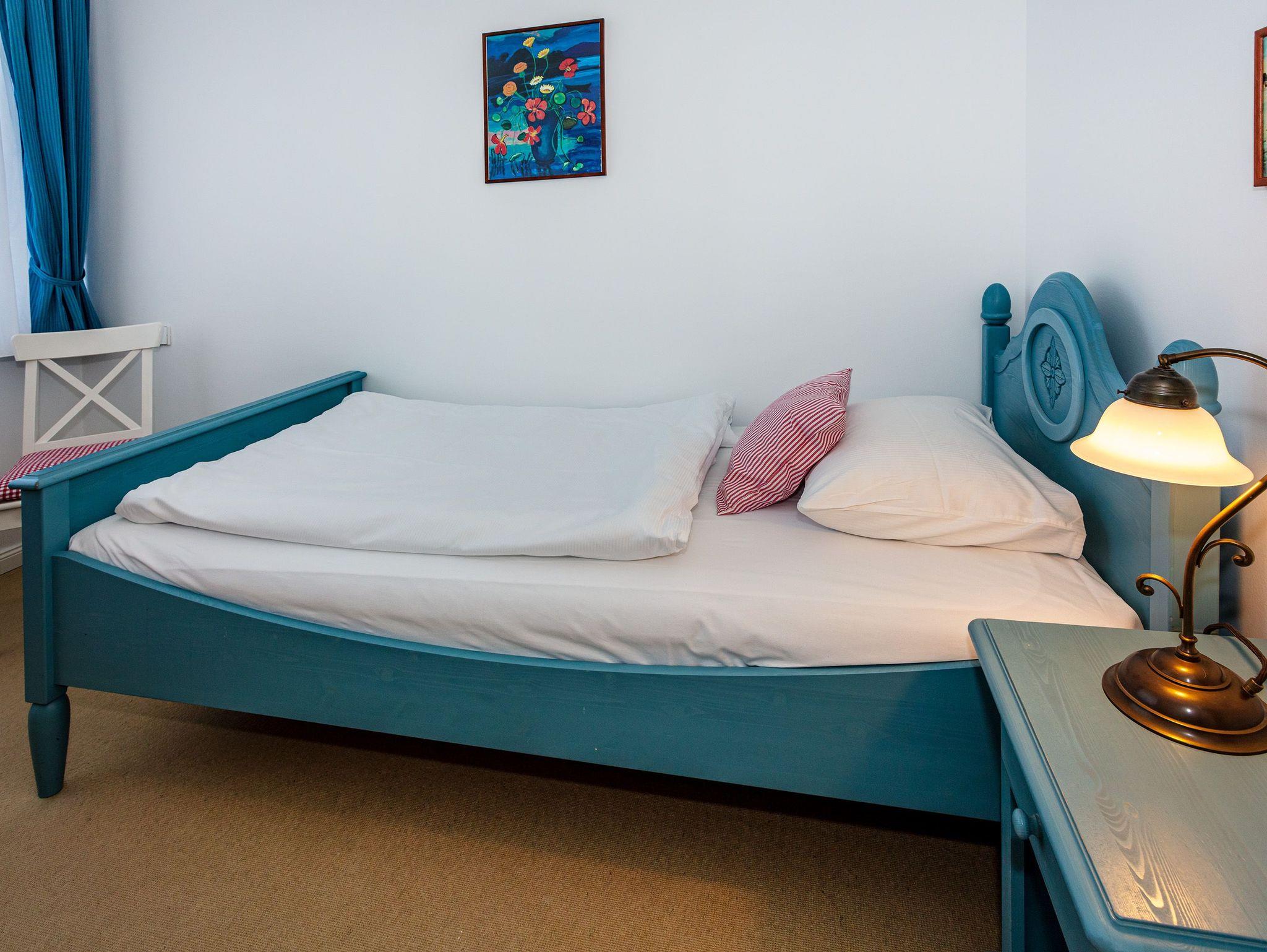 Die 3-Zimmer-Wohnung mit einem hellen Teppichboden hat Platz für drei Personen und bietet die Möglichkeit zur Aufbettung (Schlafsofa) für einen weiteren Gast. Die Wohnung verfügt über einen geräumigen Wohnraum mit Küchenzeile, ein Schlafzimmer mit Doppelbett und einen Schlafraum mit Einzelbett.