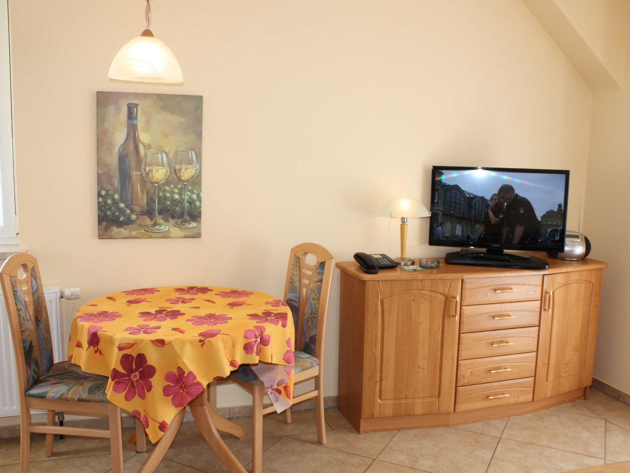 Die schöne und modern eingerichtete 2-Zimmerwohnung Nr. 15 befindet sich in der 1. Etage des Hauses und verfügt über einen großen Südwestbalkon, von welchem Sie die Sonne zum gemeinsamen Verweilen oder zum Ausklingen eines tollen Strand- oder erlebnisreichen Ausflugstag nutzen können. Die Nichtraucherwohnung verfügt über eine Größe von ca. 40 qm und ist mit bis zu 2 Personen belegbar. Die helle Wohnung verfügt über einen vorgelagerten Flur mit einer Garderobe, einem gemütlichen Wohnbereich mit Wohnküche sowie einen Essplatz, ein Schlafzimmer und ein Tageslichtbad. Im Wohnbereich erwartet Sie eine bequeme Sitzecke. Zudem gelangen Sie vom Wohnzimmer aus auf den möblierten Balkon. Die technische Einrichtung umfasst einen Flachbildfernseher, ein Radio mit CD-Player sowie einen gebührenfreien WLAN-Zugang. In der Küchenzeile erwartet Sie unter anderem ein Backofen, Mikrowelle, Cerankochfeld, Kühlschrank, Kaffeemaschine, Toaster, Wasserkocher sowie umfangreiches Kücheninventar. Das Schlafzimmer verfügt über ein großes Doppelbett mit Nachttischen, einen Kleiderschrank mit Spiegel sowie Verdunklungsvorhänge für eine erholsame Nachtruhe. Im Bad erwartet Sie eine Dusche, Waschtisch, Kosmetikspiegel und WC. Für unsere kleinen Gäste stellen wir gern auf Anfrage ein Kinderreisebett sowie einen Hochstuhl bereit.