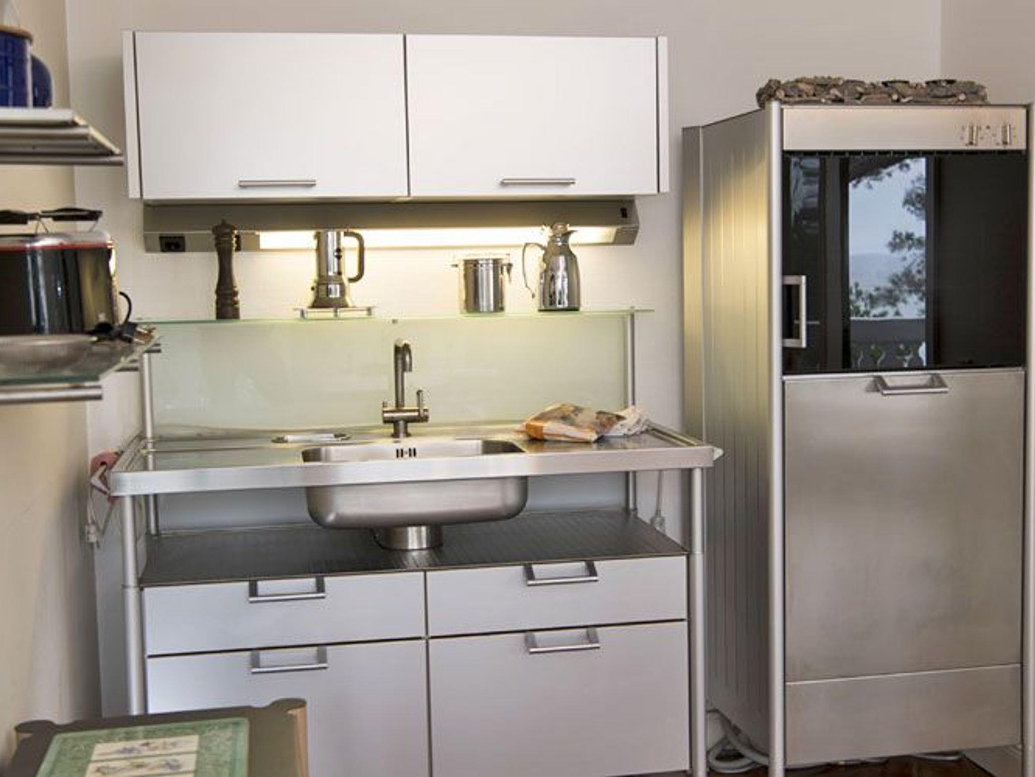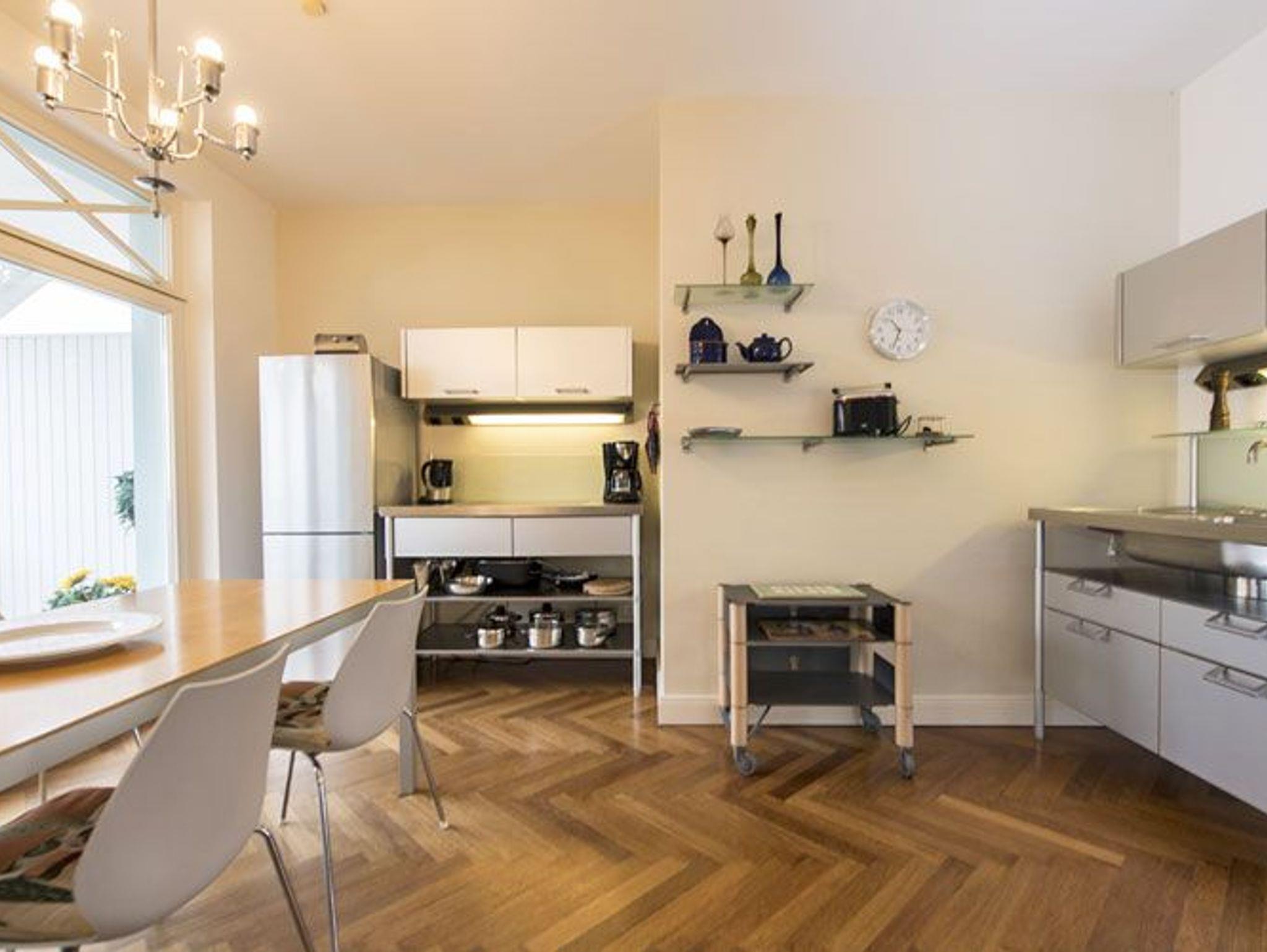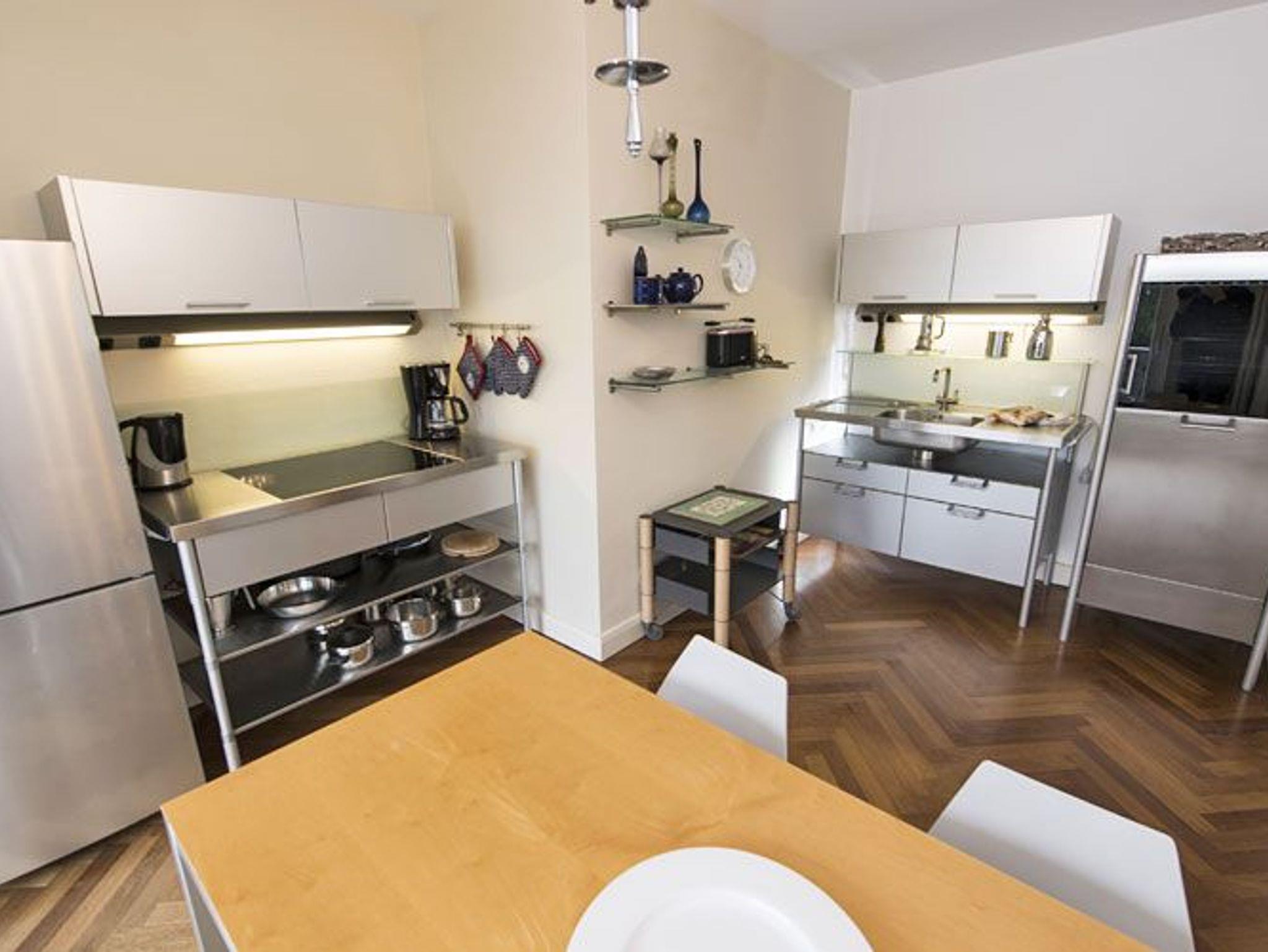 Zur Ausstattung der Küche gehört auch ein 4-Zonen-Ceran-Kochfeld, Backofen, Kühlgefrier-Schrank, Geschirrspülmaschine, Kaffeemaschine, Toaster.