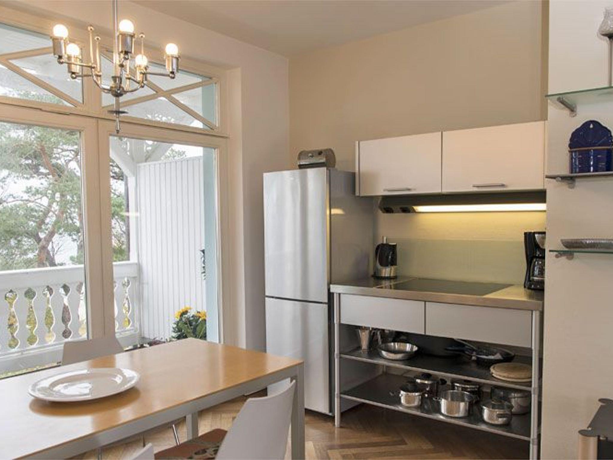 Dieses sehr schöne 3-Raum-Appartment für 1-4 Personen ist ca. 105 m² groß und befindet sich in der zweiten Etage, bequem mit dem Fahrstuhl zu erreichen. Bodentiefe Fenster im großzügigen Wohnraum und der Küche sorgen für ein helles und angenehmes Wohlbefinden. Wohnraum, Küche und Balkon - der von beiden Räumen begehbar ist - bieten einen herrlichen Blick auf die Ostsee und die Binzer Bucht.