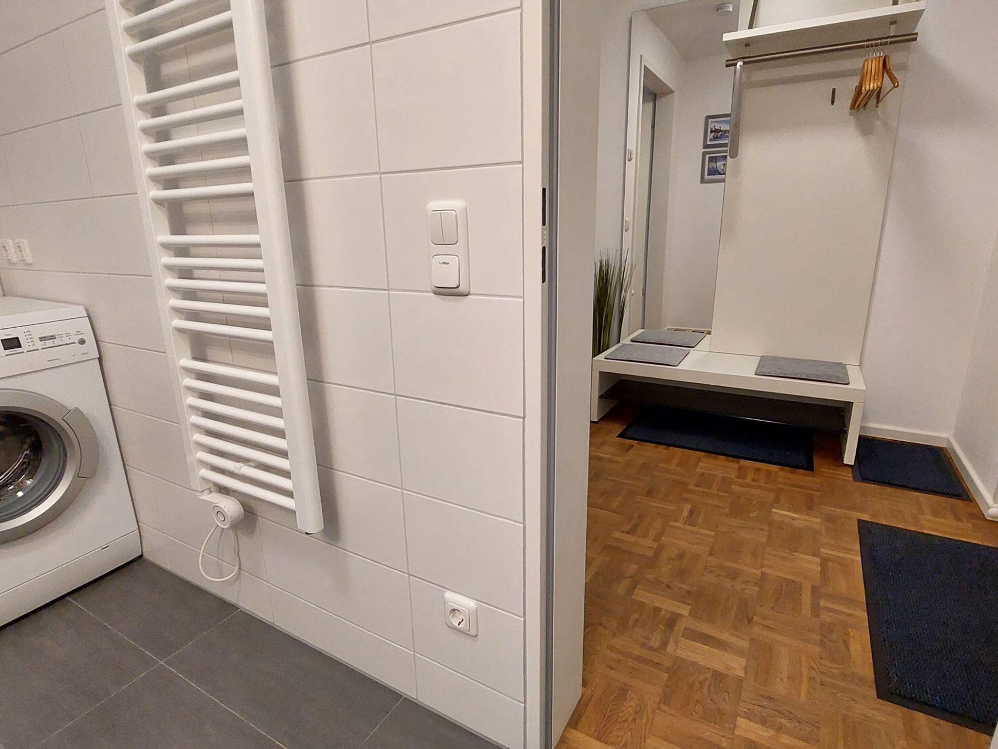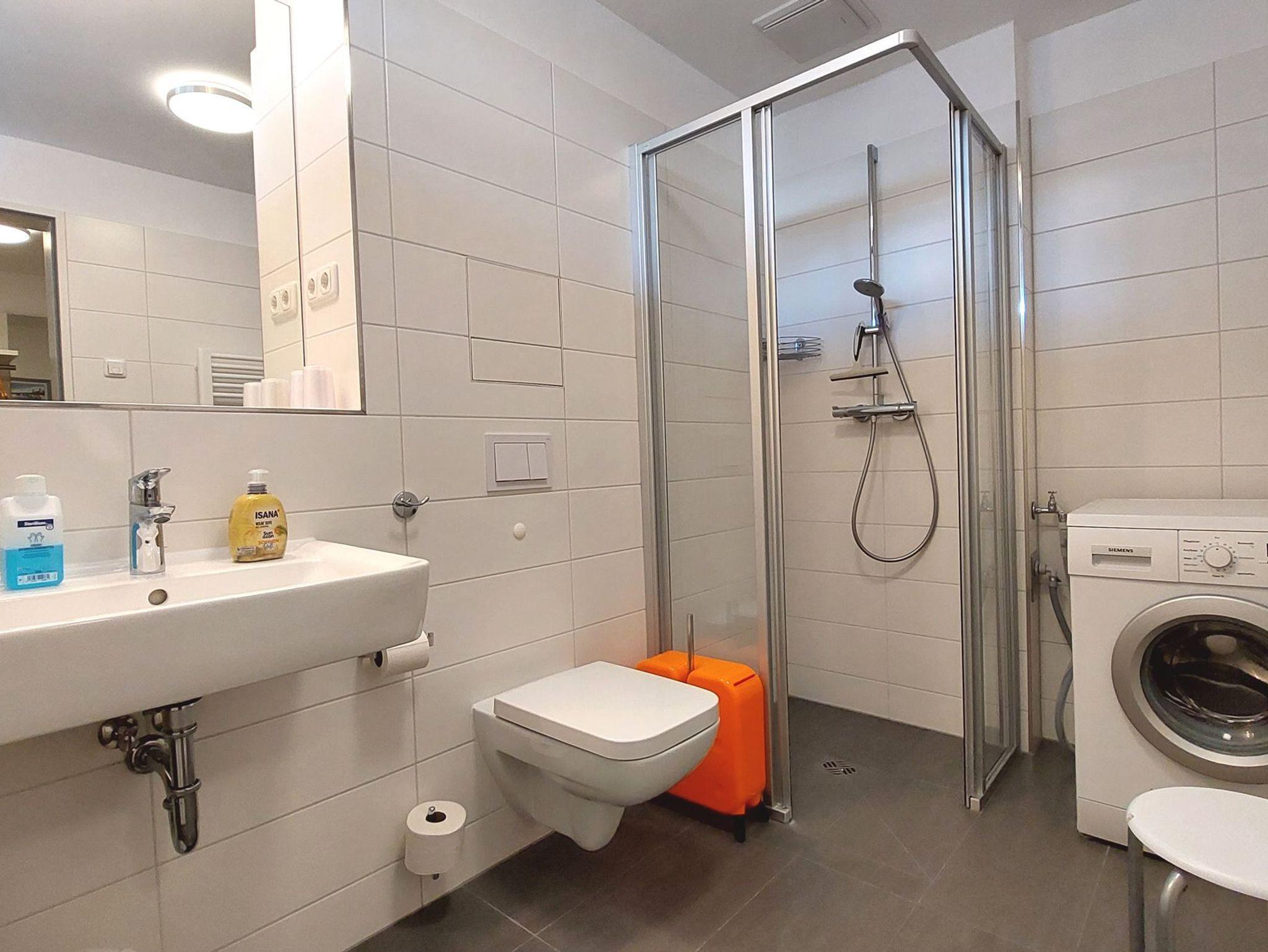Das Badezimmer verfügt über eine ebenerdige Dusche, WC und eine eigene Waschmaschine.