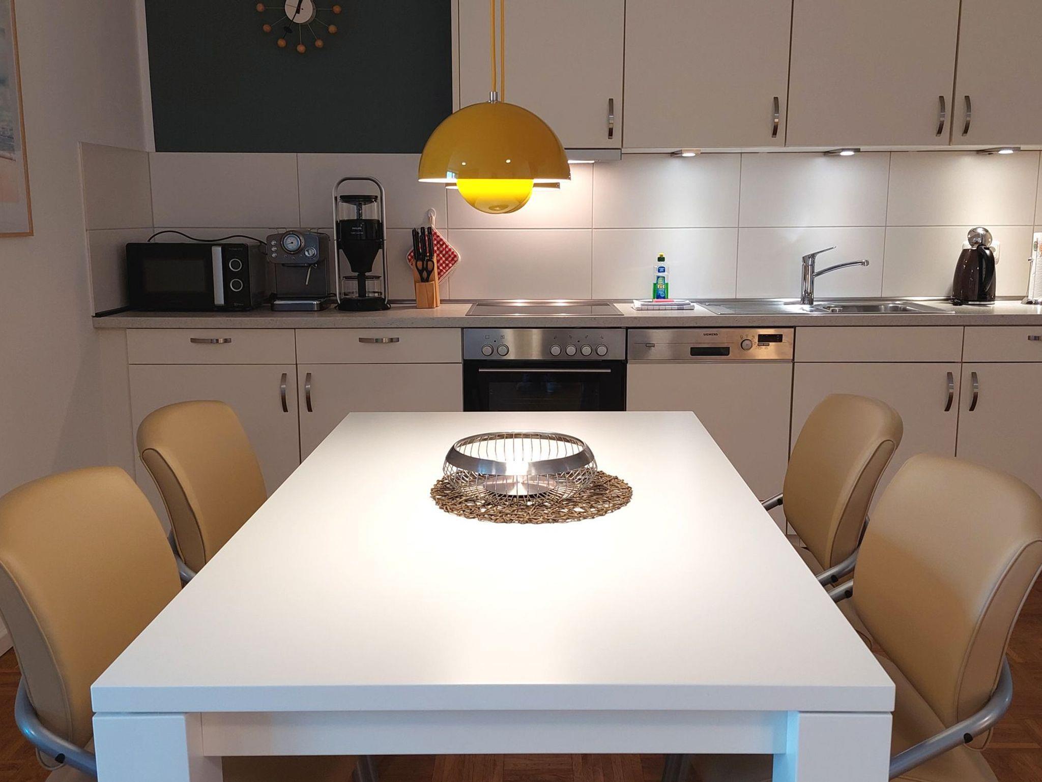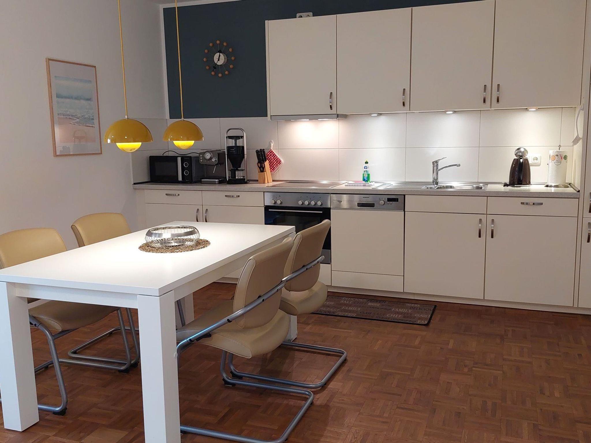 Der geräumige Küchenbereich umfasst eine modernen Kochzeile, ein Esstisch samt 4 Plätzen und bietet Zugang zur Abstellkammer mit viel Stauraum,