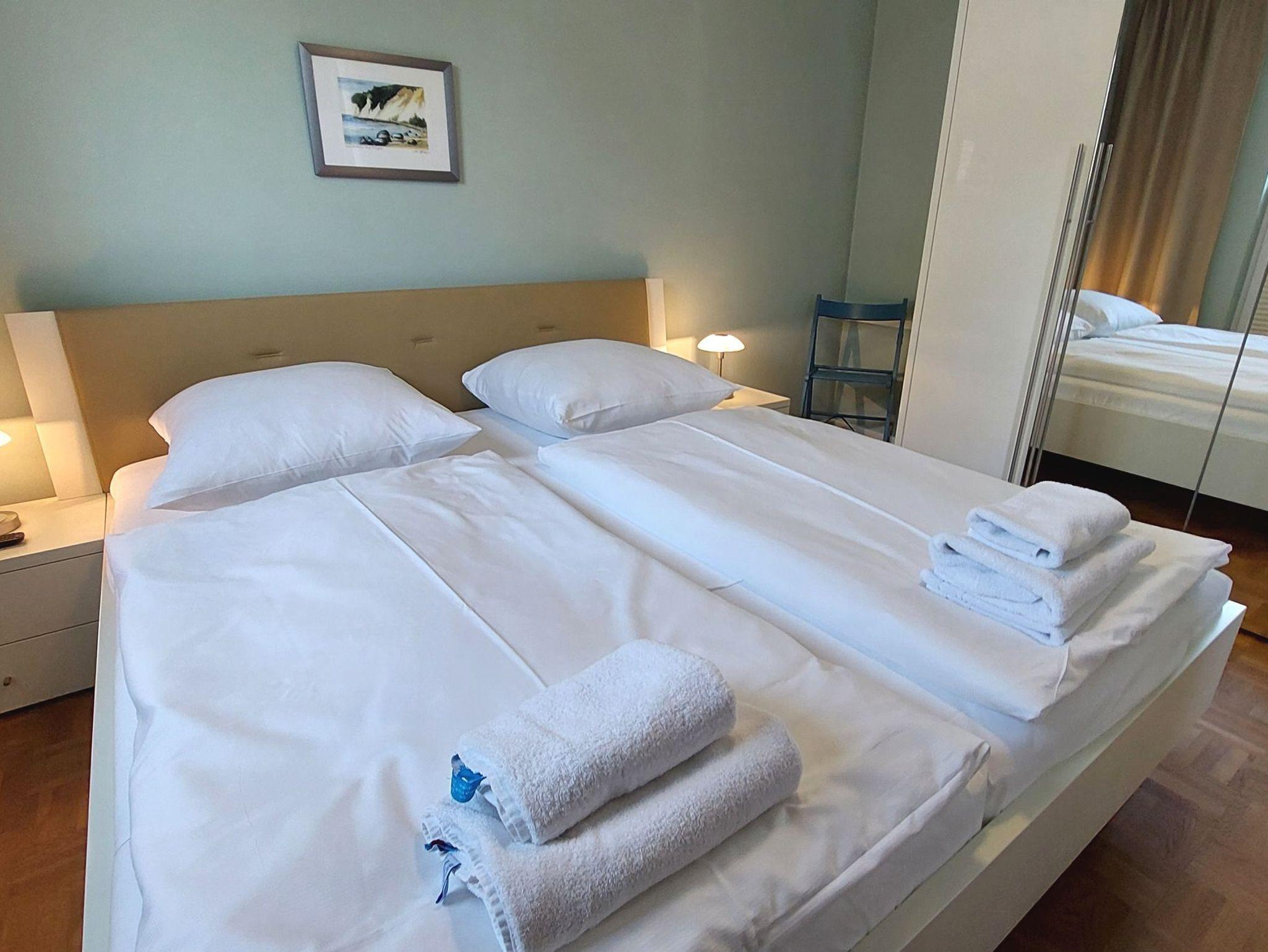Die Unterkunft umfasst zirka 65 qm, bietet Platz für bis zu 4 Personen und ist von Tiefgarage und Erdgeschoss bequem per Fahrstuhl erreichbar.
