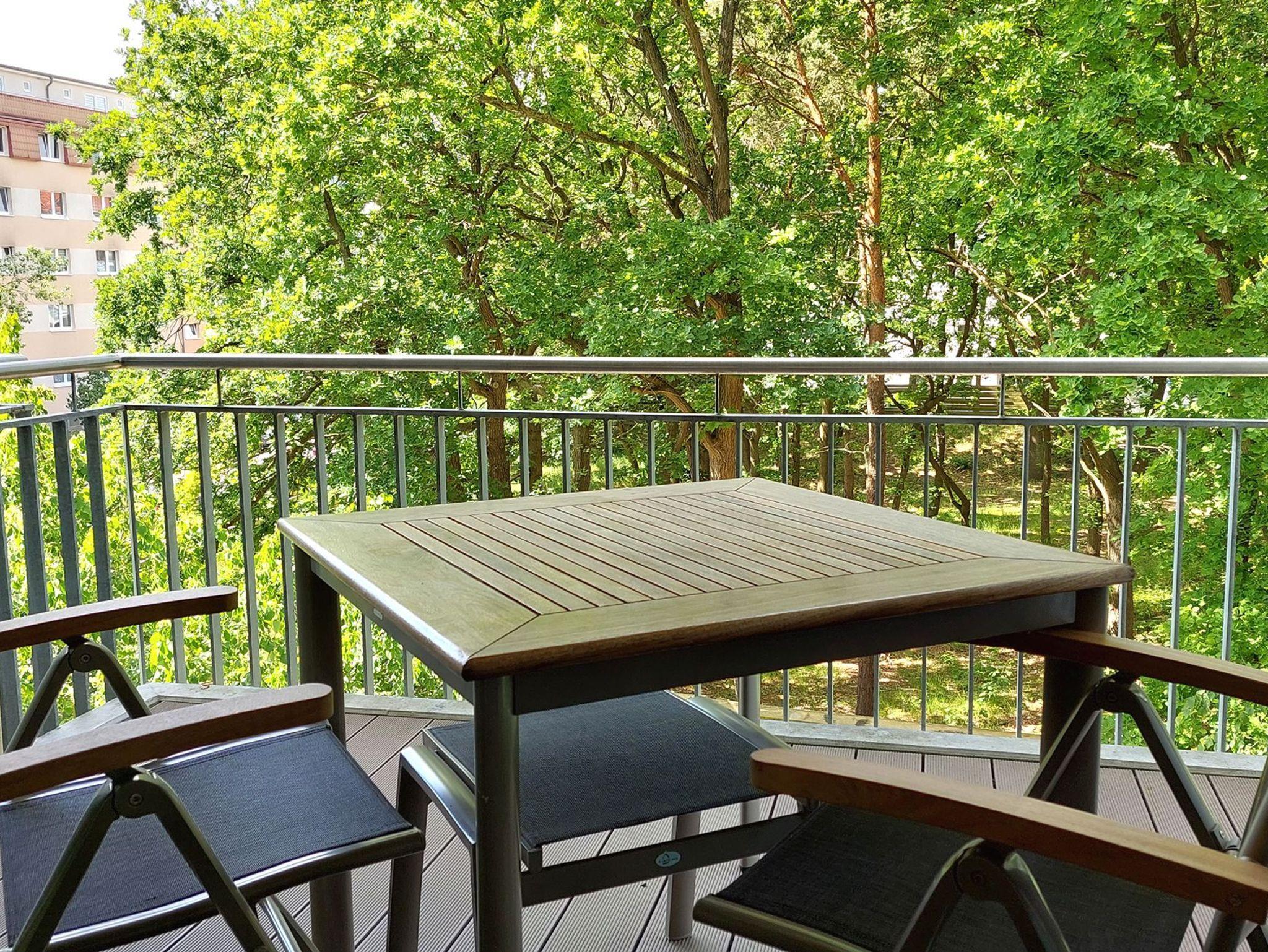 Der möblierte Balkon Richtung Nordwesten liefert einen schönen Blick ins Grüne.