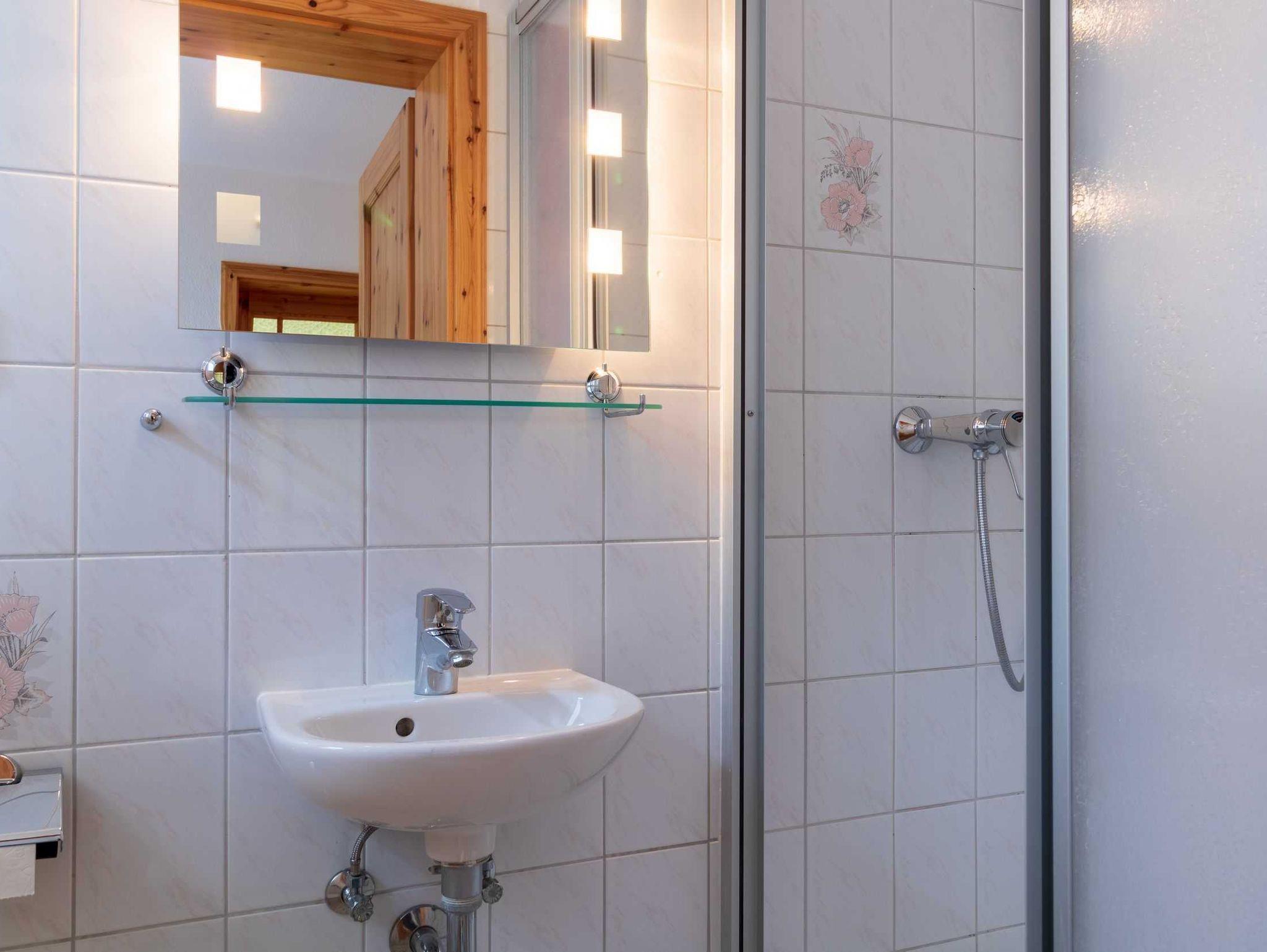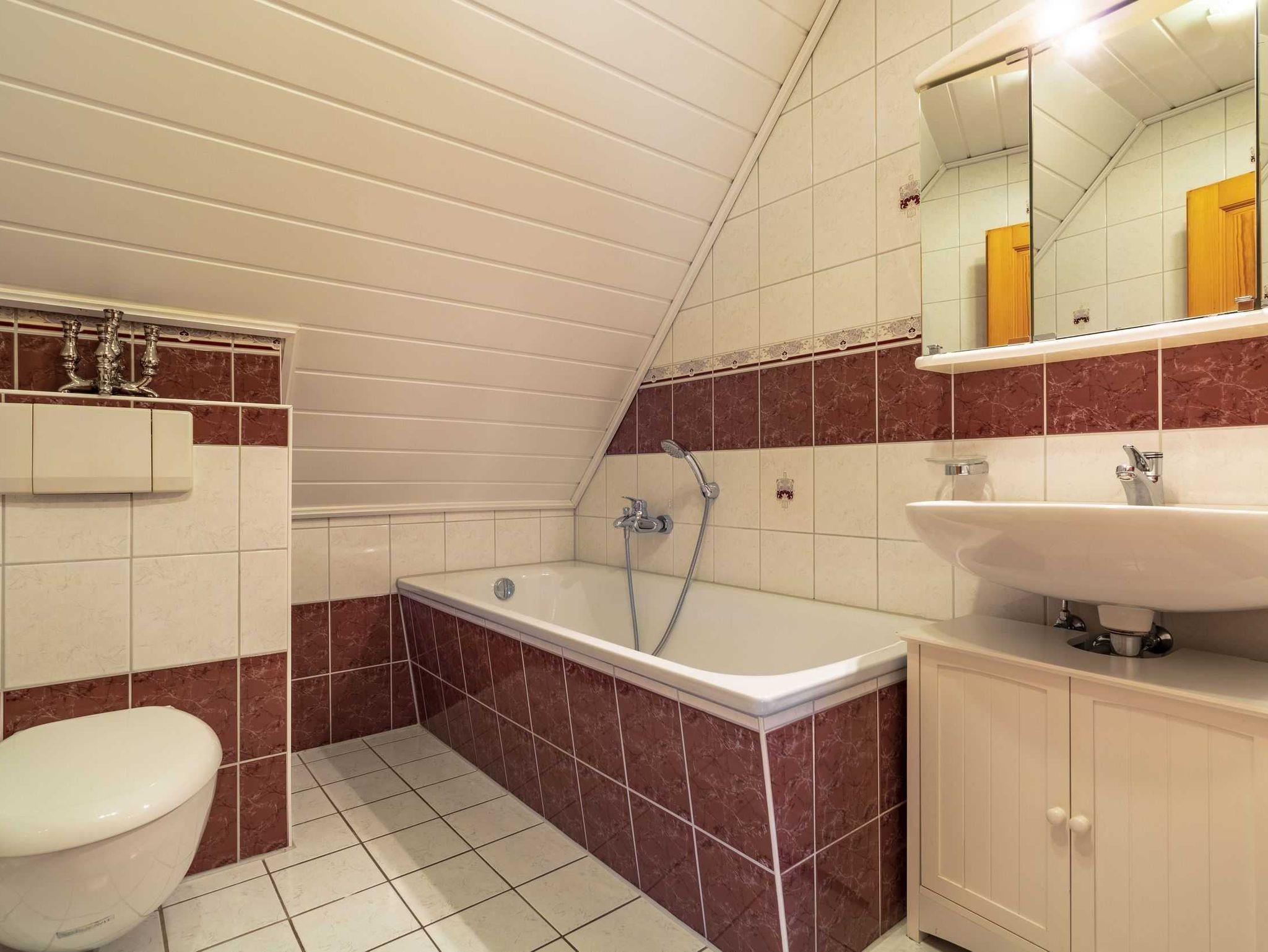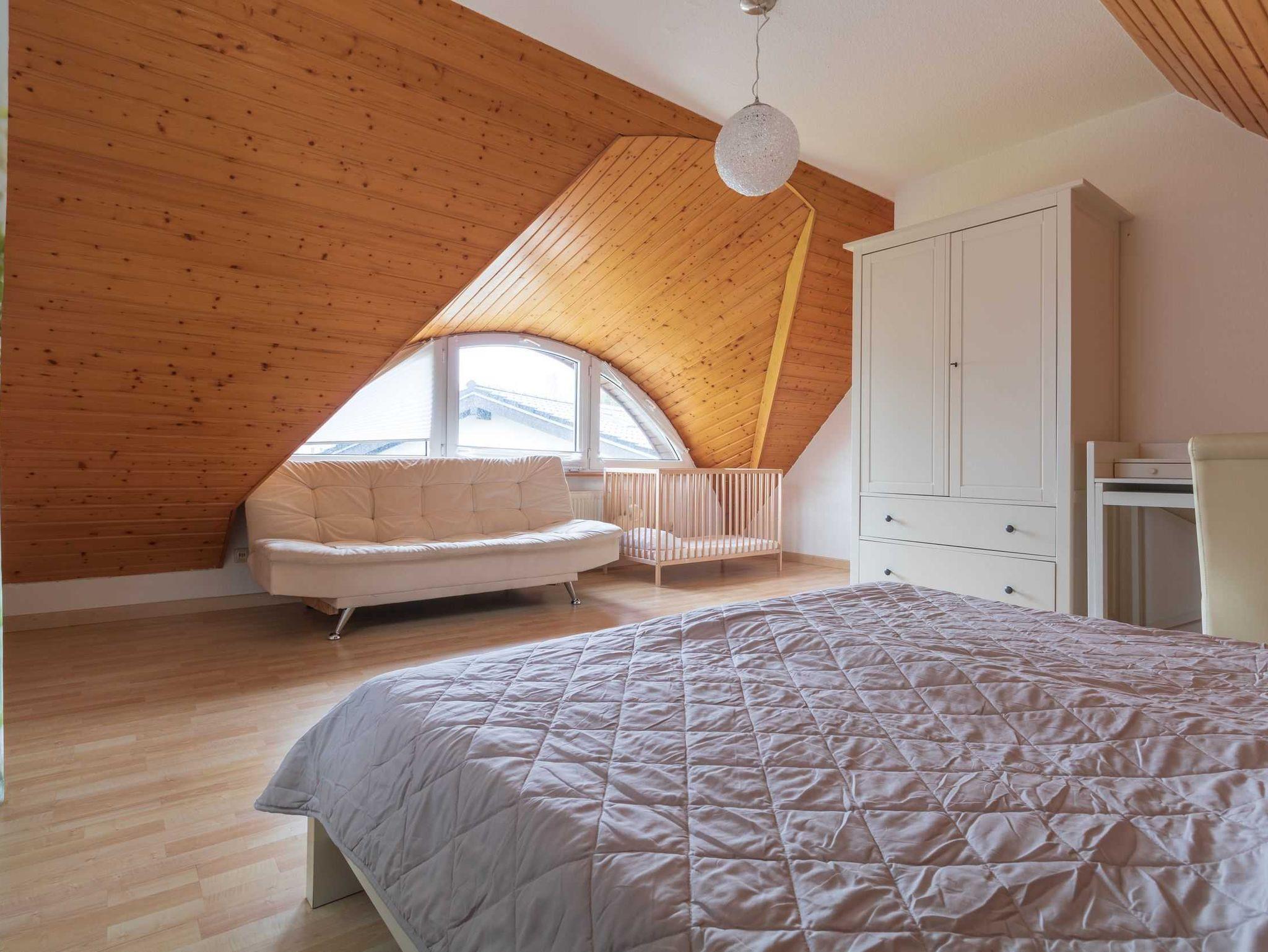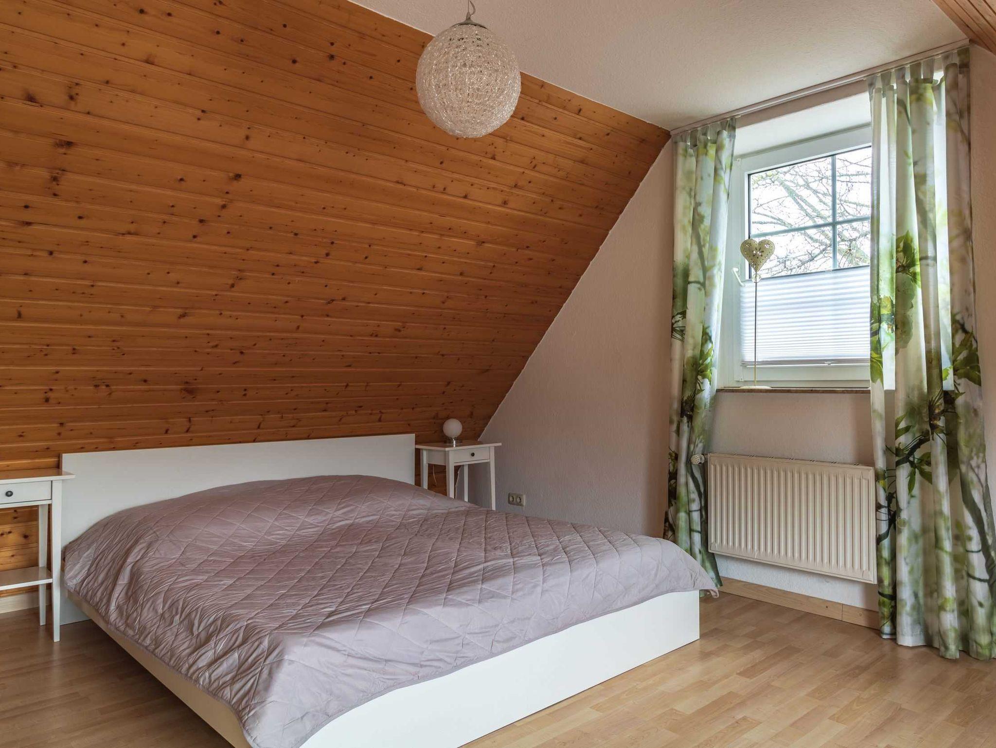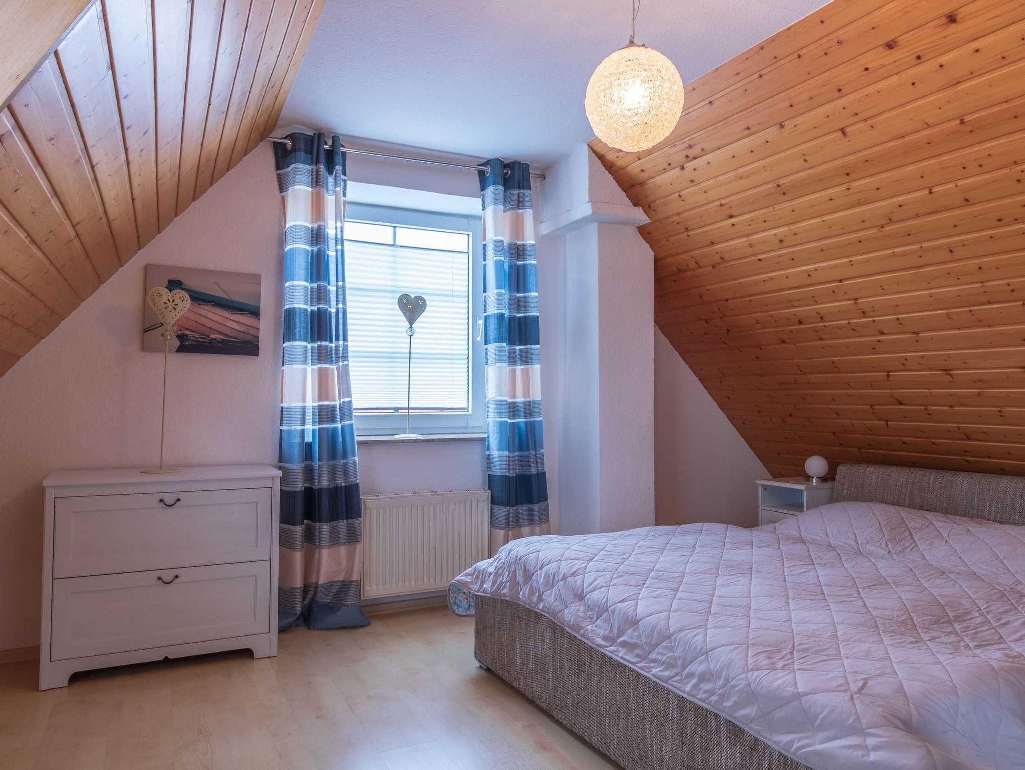 Im Obergeschoss befinden sich die 2 Schlafzimmer mit 1,80 m breiten Doppelbetten, einer kleinen Schlafcouch sowie einem Kinderbett und dem Bad mit Badewanne.