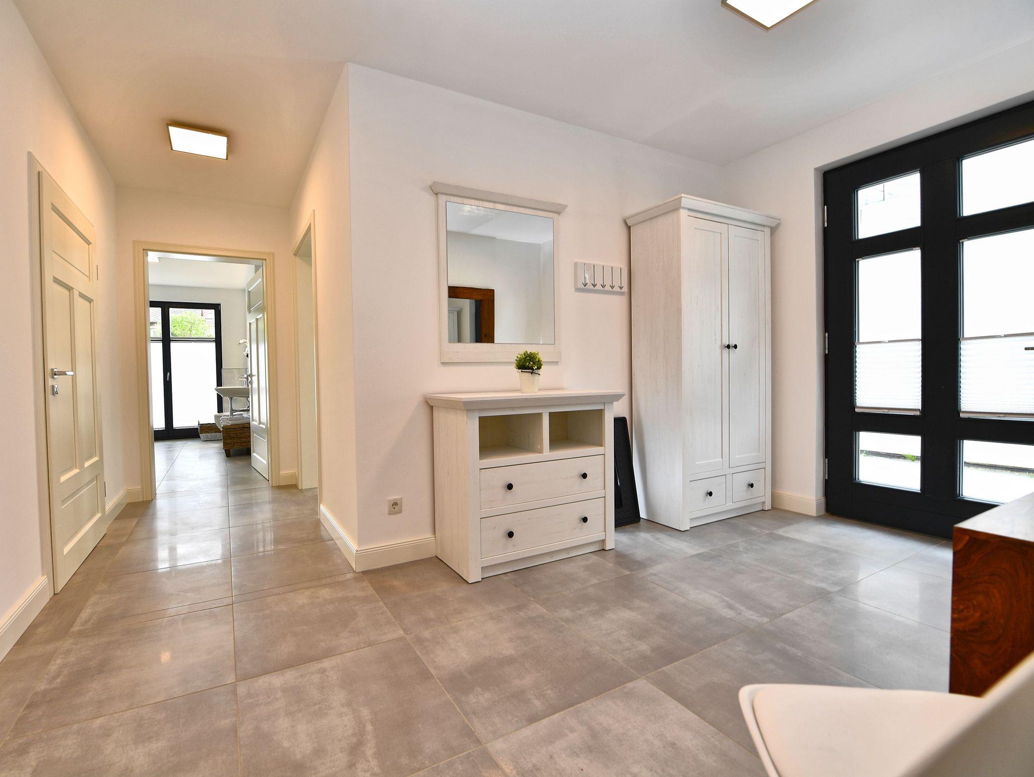 Es empfängt Sie ein repräsentativer privater Eingangsbereich mit großer Garderobe. Die Böden in der gesamten Wohnung sind mit Platten aus edlem Steinzeug in hellgrau gefliest. Darunter sorgt eine Fußbodenheizung ganzjährig für ein angenehmes Raumklima.