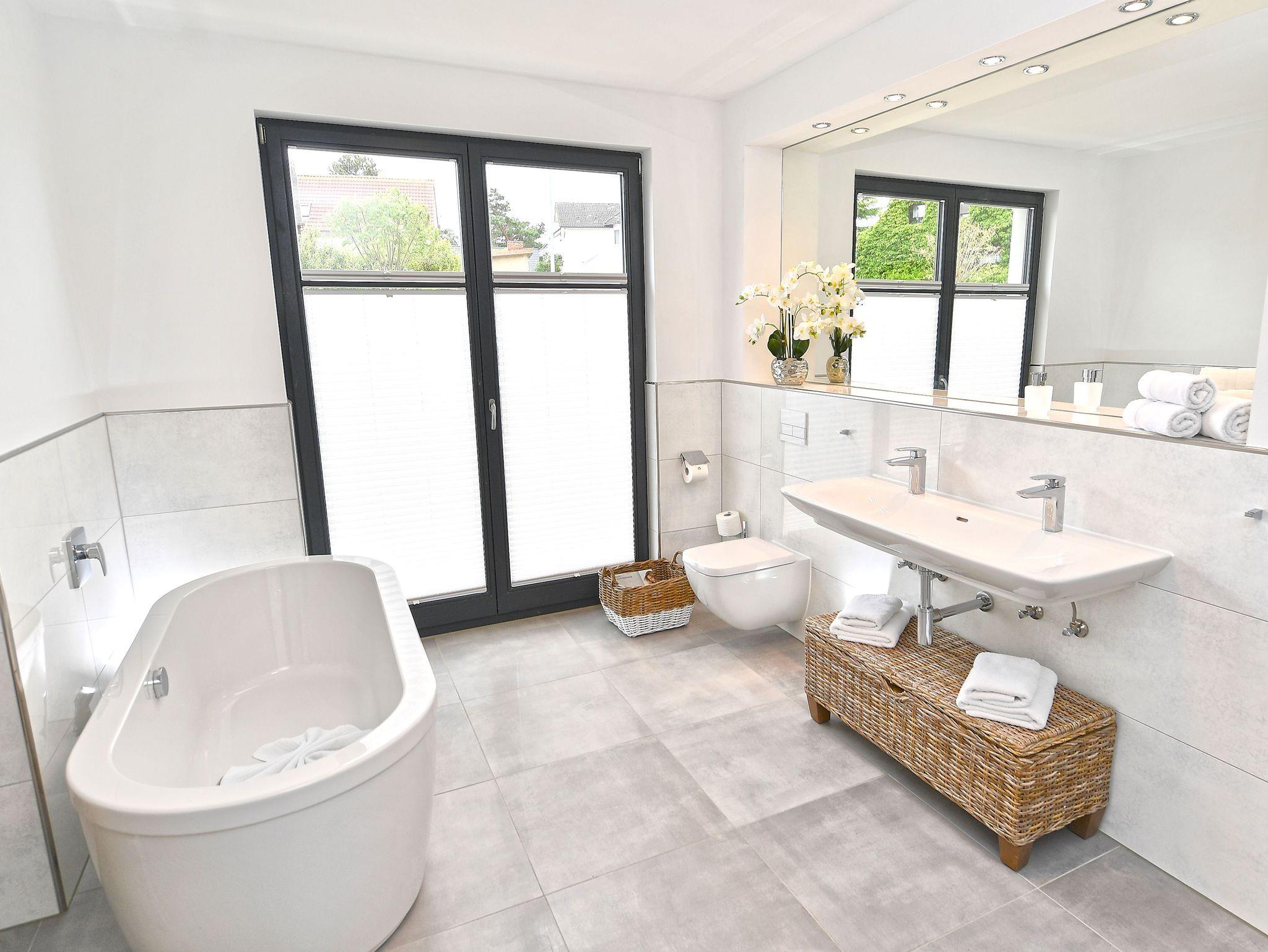 Mit jeder Menge Platz und exklusivem Wohlfühl-Komfort begeistert das Badezimmer. Ganz nach Belieben können Sie es sich hier in der freistehenden Badewanne bequem machen oder in der geräumigen Dusche abbrausen. Der beleuchtete Doppelwaschtisch mit großen Ablageflächen, der beheizbare Handtuchtrockner und natürlich Ihre ganz private Finnische Sauna sind weitere Highlights dieses Raumes, dessen Ausstattung durch WC, Fön und Kosmetikspiegel abgerundet wird.