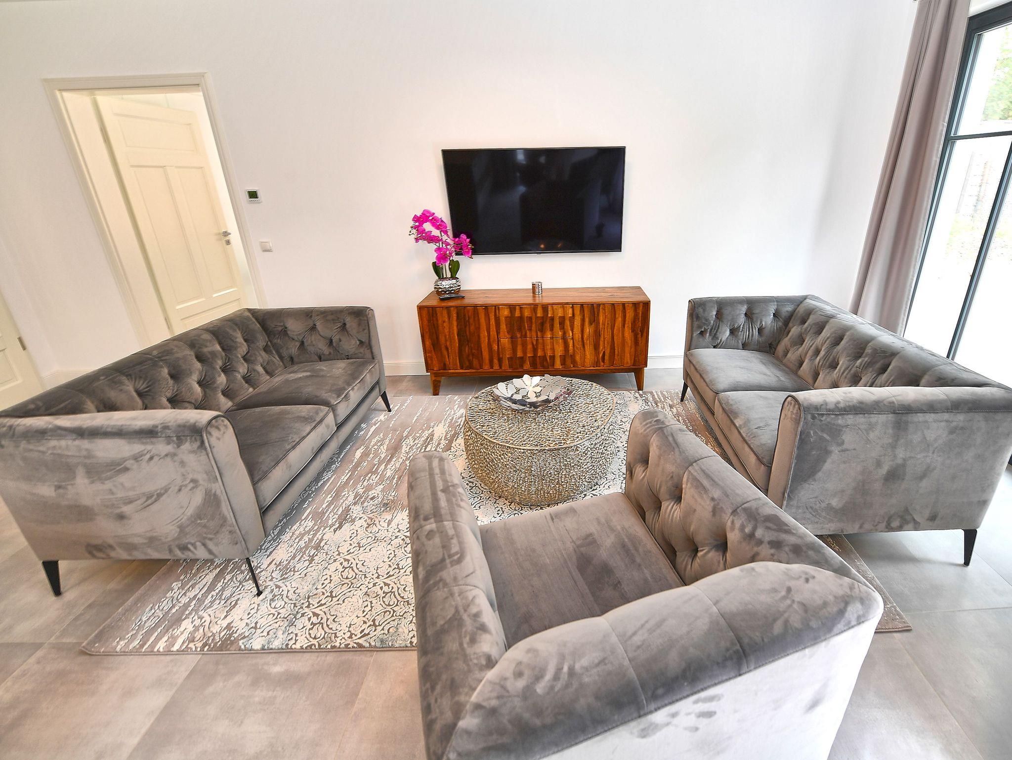 Im Wohnzimmer fühlt man sich auf Anhieb willkommen. Exklusive Sitzmöbel, modernste Unterhaltungstechnik, dezente Dekorationen, harmonische Farben und eine stimmige Beleuchtung verleihen dem Raum ein ganz besonderes Ambiente. Durch die bodentiefen Fenster fällt der Blick auf die vorgelagerte Terrasse, wo komfortable Gartenmöbel zum Frühstück in der gesunden Ostseeluft oder einfach nur zum Relaxen einladen. Auch die Rasenfläche am Haus, auf der die Kinder spielen oder Sie Ihr Sonnenbad genießen können, verdient dicke Pluspunkte. Zum besonderen Wohlgefühl gerade in der kühleren Jahreszeit trägt der Kaminofen von Scantherm bei.