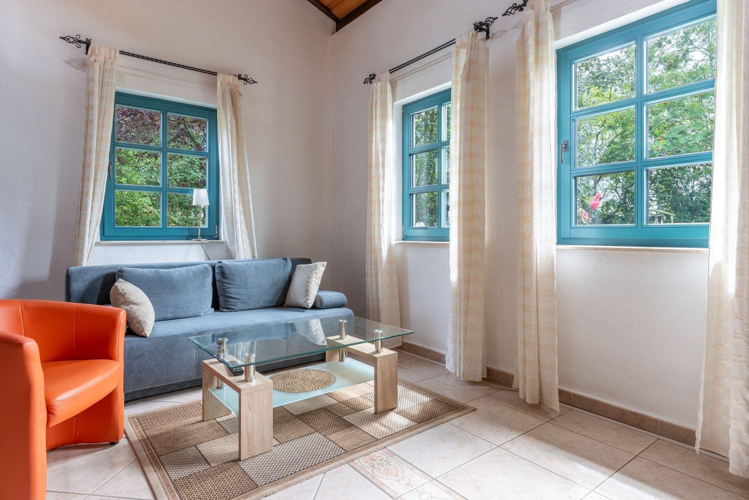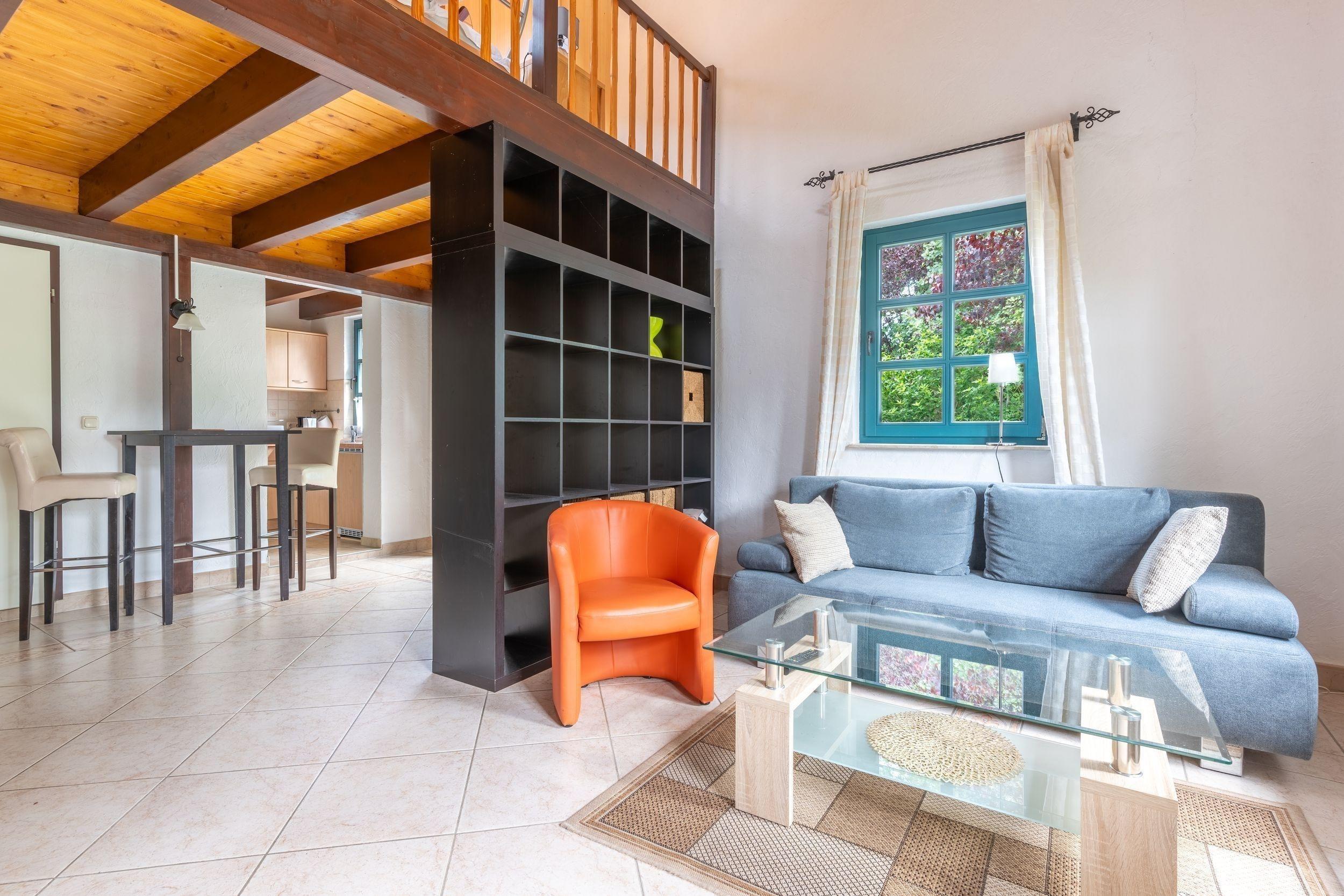 Die Ferienwohnung bietet auf 52 qm Platz für bis zu 2 Personen (Aufbettung 1 Person bis 10 Jahre möglich). Der Wohnbereich im Erdgeschoß verfügt über eine große Couch, TV und einen Essplatz. Die angrenzende Küche ist ausgestattet mit Herd, Backofen, Kühlschrank, mit Tiefkühlfach, Kaffeemaschine, Toaster, Wasserkocher.