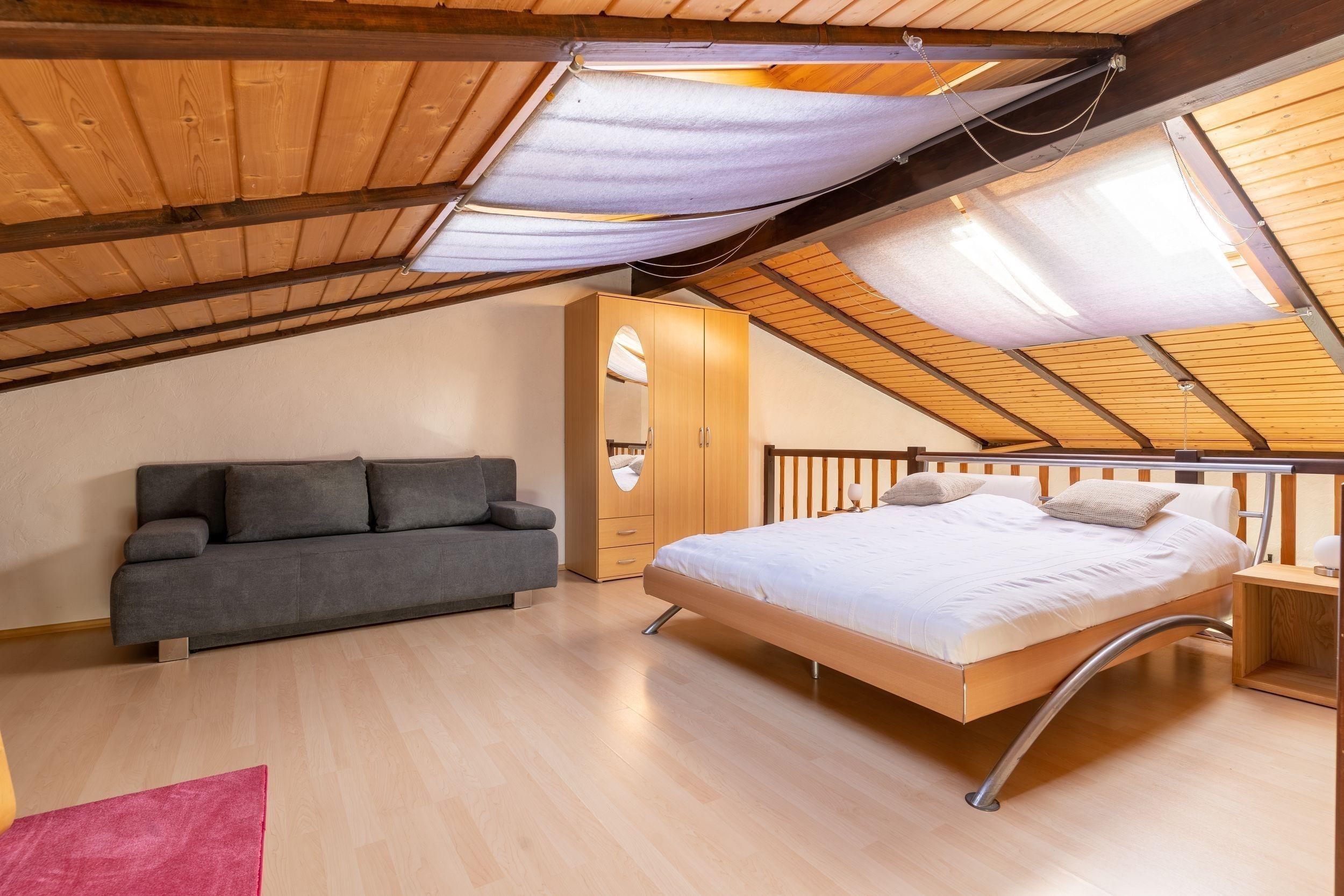Über eine Treppe kommen Sie zur offenen Schlafgalerie mit Doppelbett sowie einer kleinen Schlafcouch.