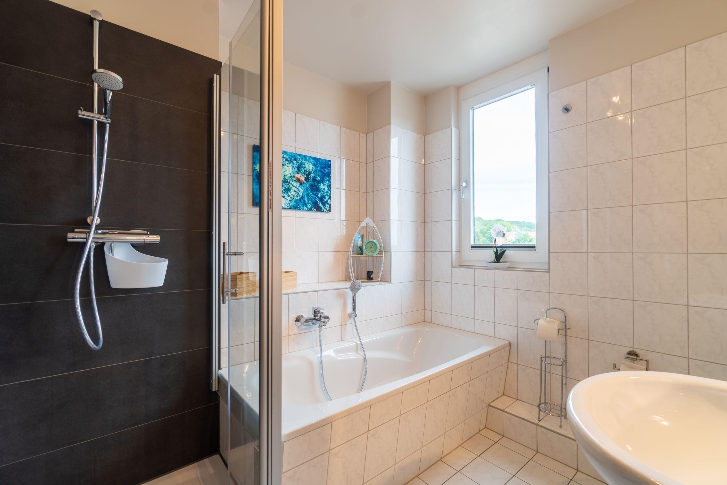 Im zweiten OG gibt es drei Schlafzimmer (jeweils mit Doppelbetten) sowie das große Badezimmer mit Dusche & Badewanne. Die hochwertige Ausstattung wird durch zwei moderne TV-Geräte sowie WLan ergänzt.