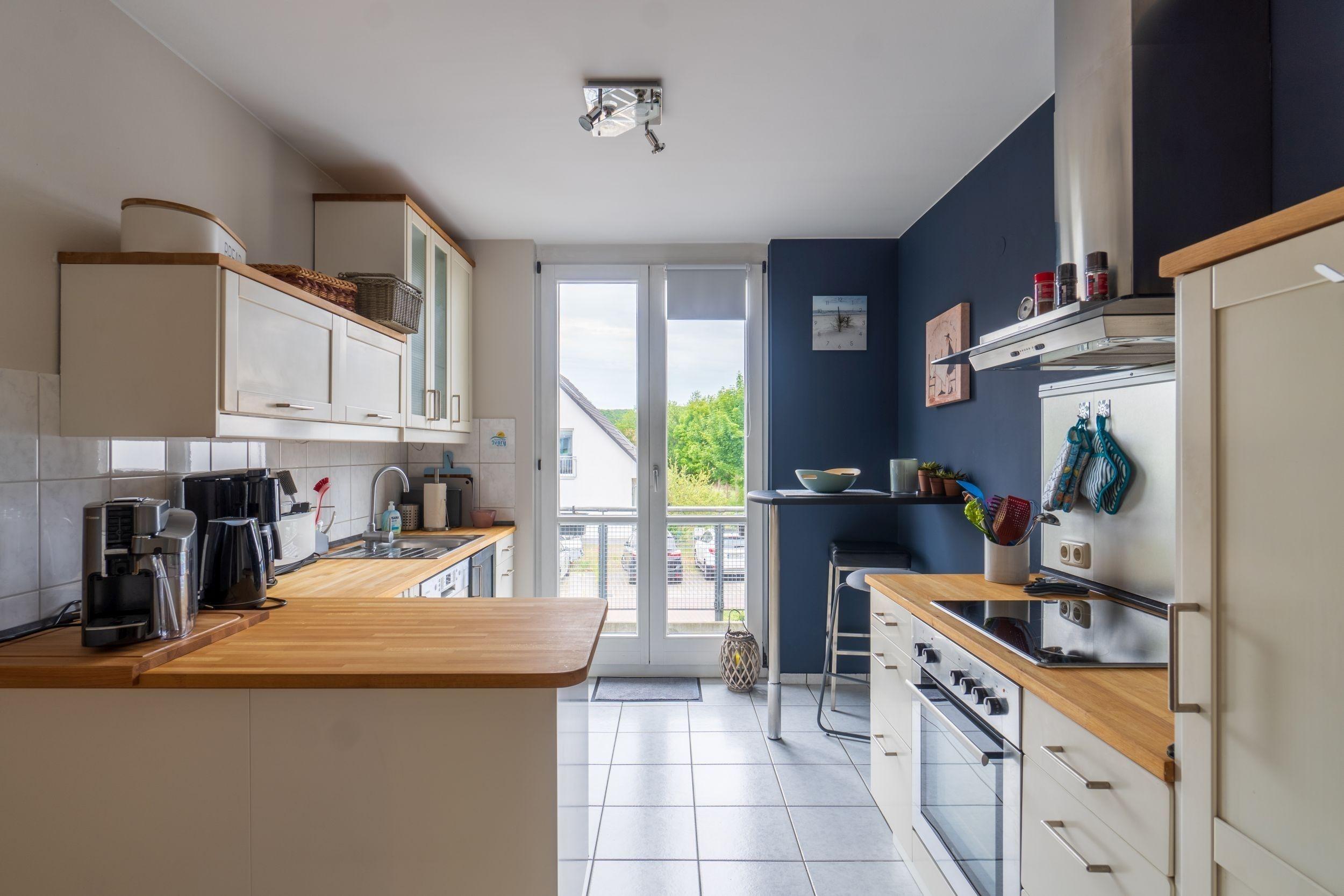 Im ersten OG befinden sich der Wohn- & Essbereich, die Küche (Ausstattung u.a.: Herd/ Backofen, Kühlschrank, Geschirrspühler, Mirkowelle, Kaffeemaschine, Kapselmaschine (Tchibo Cafissimo), Toaster), das Gäste-WC, der Balkon sowie der Zugang zur Terrasse mit dem kleinen Garten.