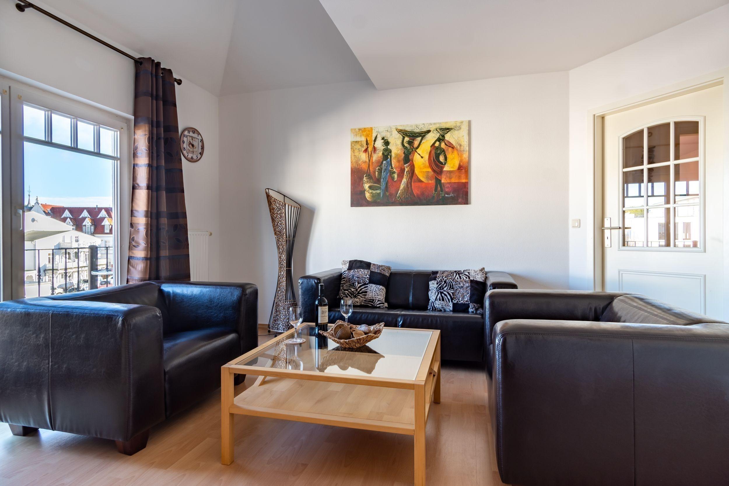 Der modern und gemütlich eingerichtete Wohnbereich lädt zum entspannen ein. Von hier kommen Sie zum Balkon, zu den Schlafzimmern und zur Küche. Der Balkon ist mit Blickrichtung zur Ostsee ausgerichtet.