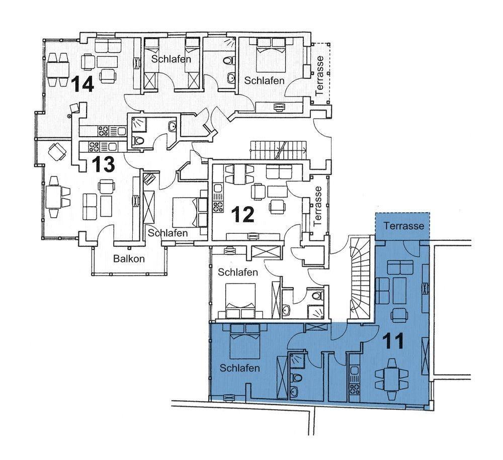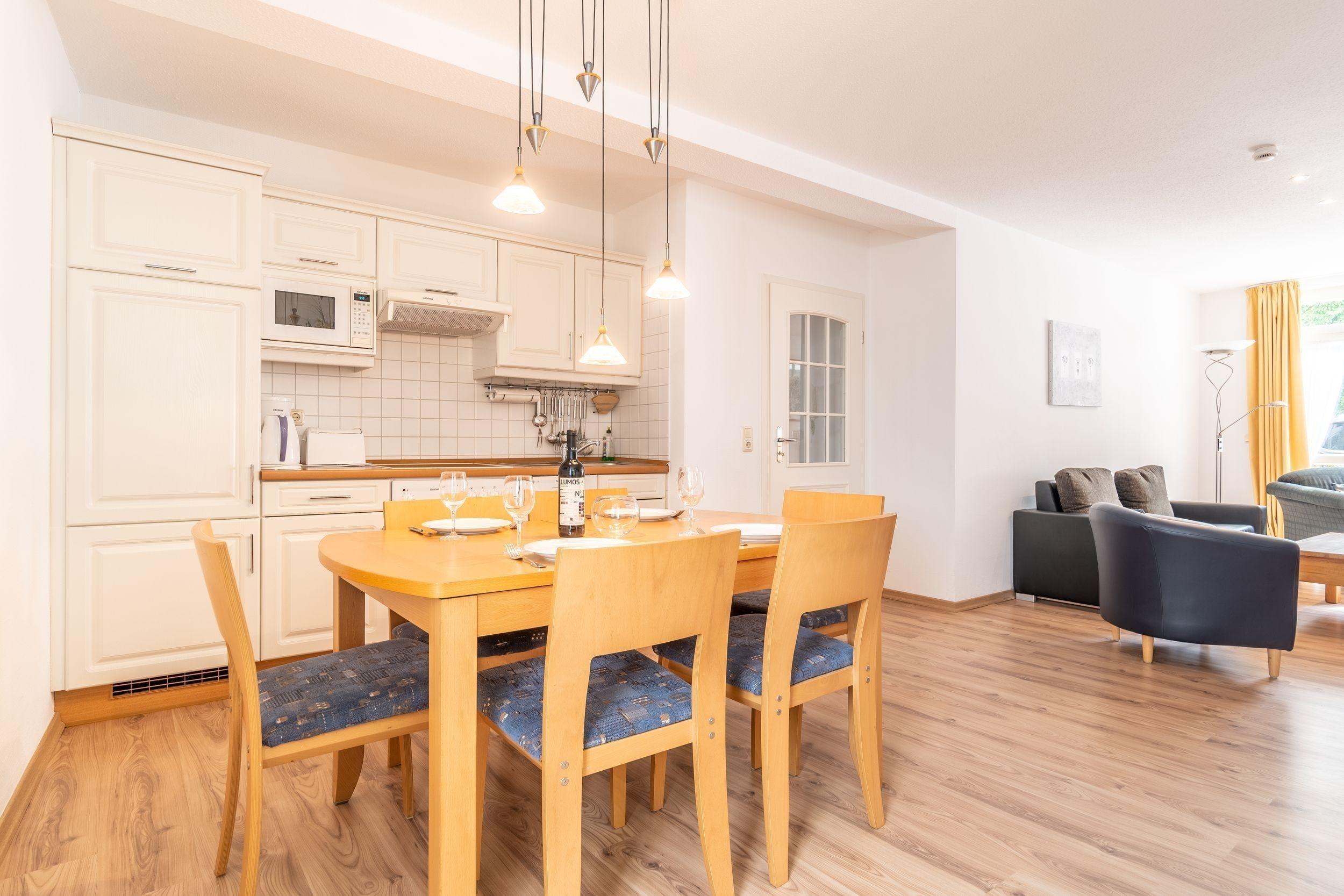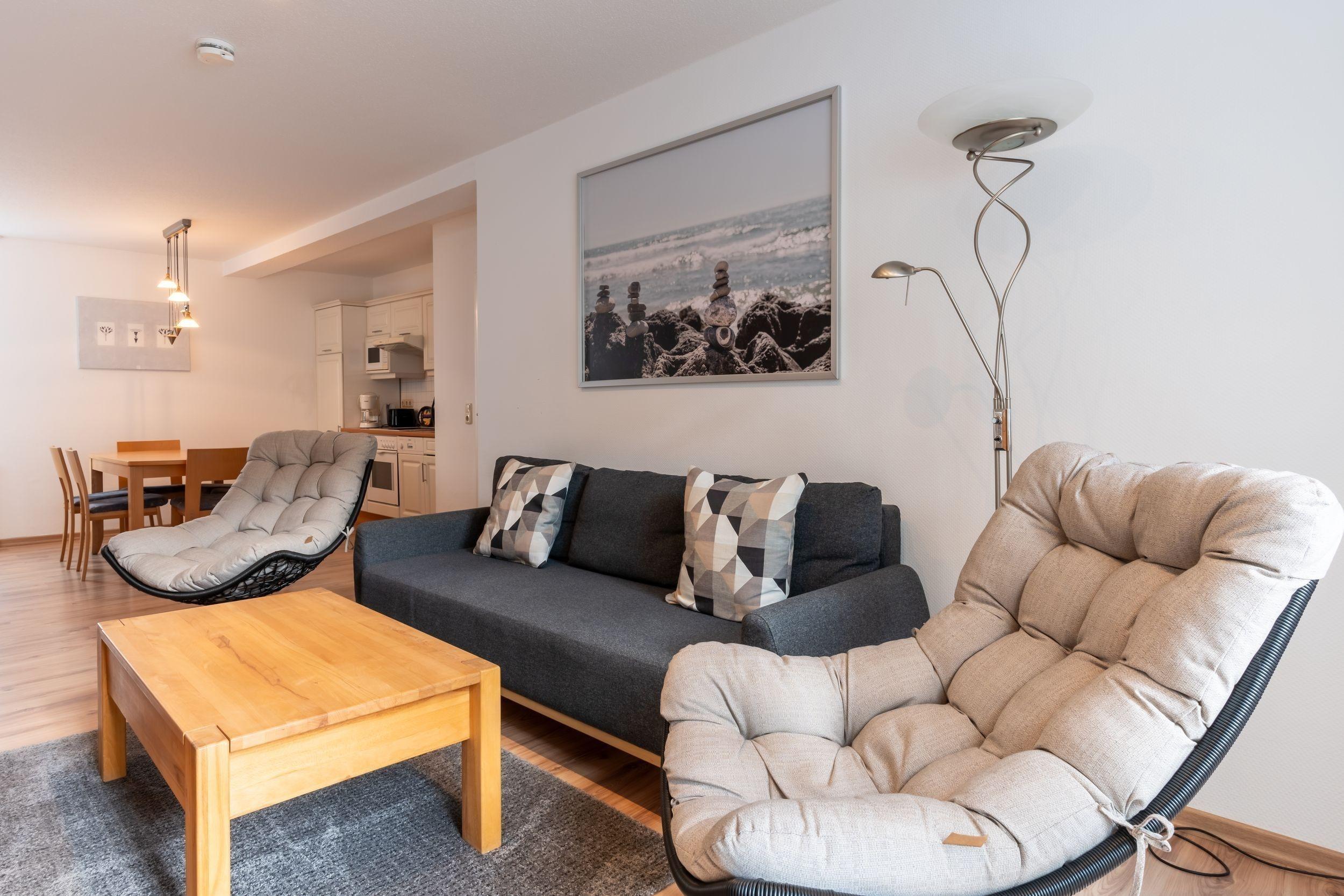 Unser 2- Raum Apartment bietet auf 59 qm Platz für bis zu 4 Personen. Im Wohn/Essbereich ist eine umfangreich ausgestattete Küchenzeile integriert.