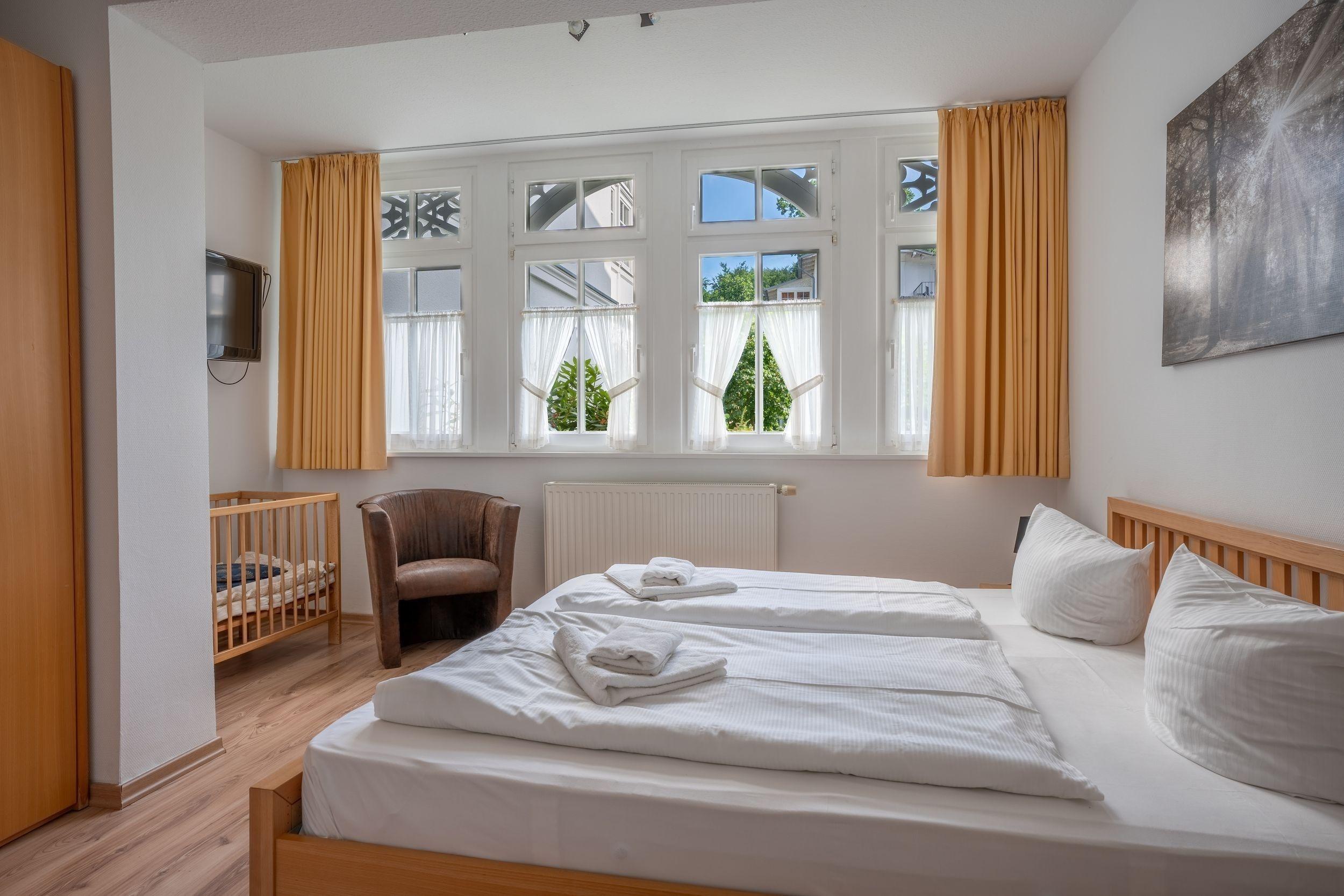 Das separate Schlafzimmer ist mit einem 1,80 m großen Doppelbett, Kleiderschrank, TV und Kinderbett ausgestattet.