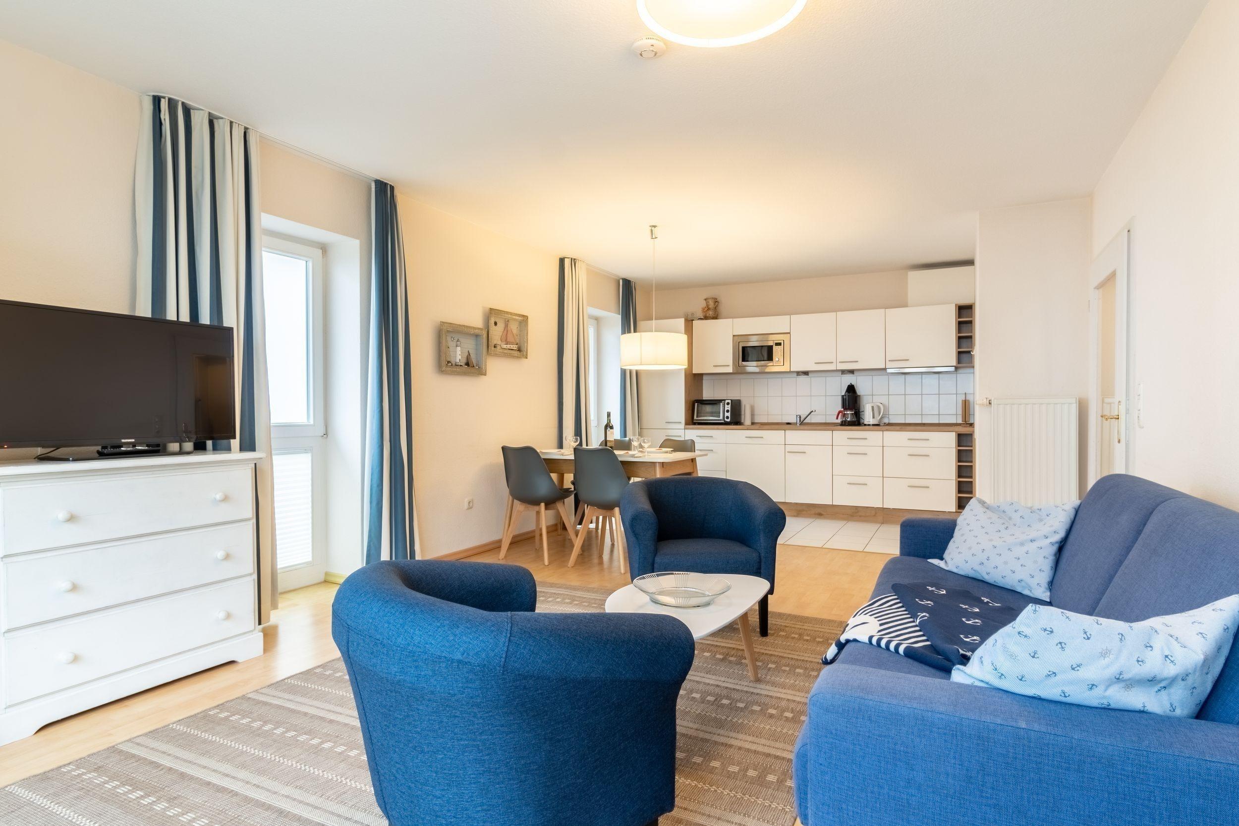 In dem großzügigen Wohnbereich befindet sich eine funktionale Couch, die einfach zu einer Schlafmöglichkeit für zwei Personen umgebaut werden kann. Ein moderner Smart TV ist natürlich auch vorhanden. Vom Wohnbereich hat man Zugang zu dem 4 m² großen Balkon mit Gartenmöbeln.