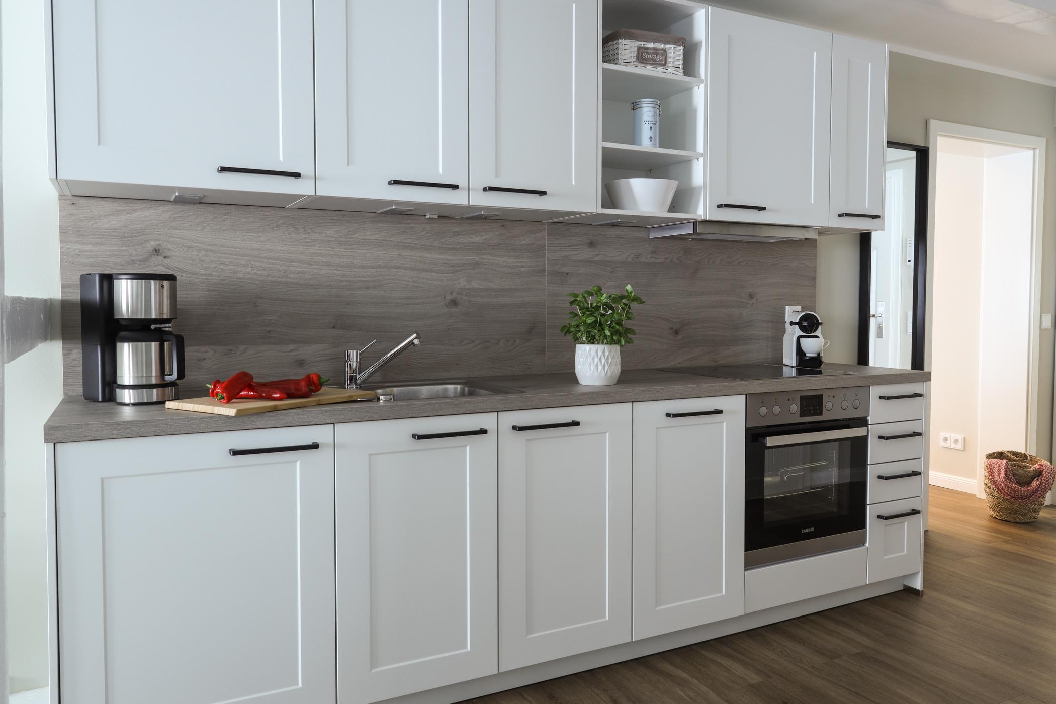 Die Ferienwohnung ist ausgestattet mit einer Kochnische. Die Kochnische ist voll ausgestattet mit allem was man für den Urlaub braucht, Herd, Kühlschrank, Toaster, Backofen, Spülmaschine sowie verfügt diese über Geschirr, Kochutensilien und Besteck.